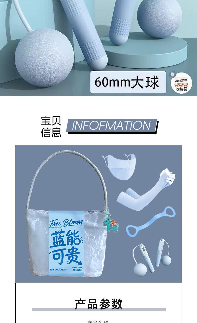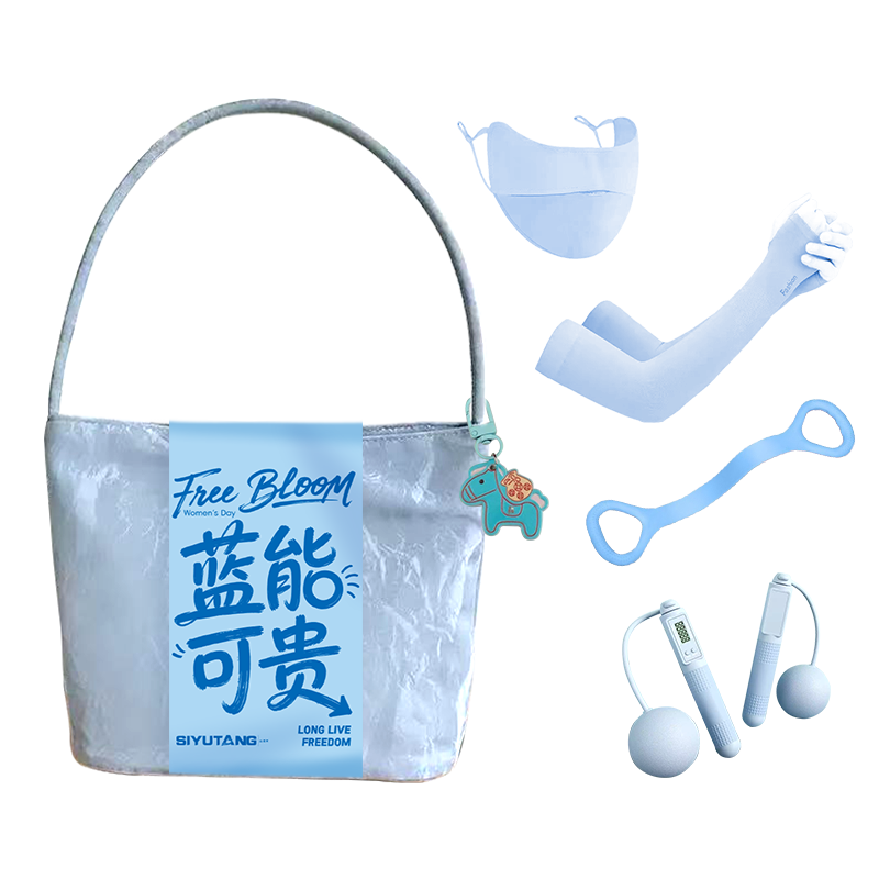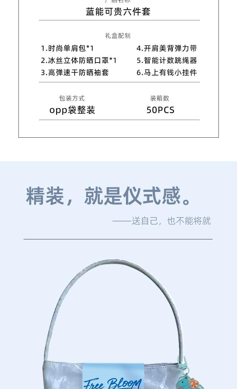 礼盒配制:1.时尚单肩包*1 2.冰丝立体防晒口罩*1 3.高弹速干防晒袖套 4.开肩美背弹力带 5.智能计数跳绳器 6.马上有钱小挂件 包装方式:opp袋整装