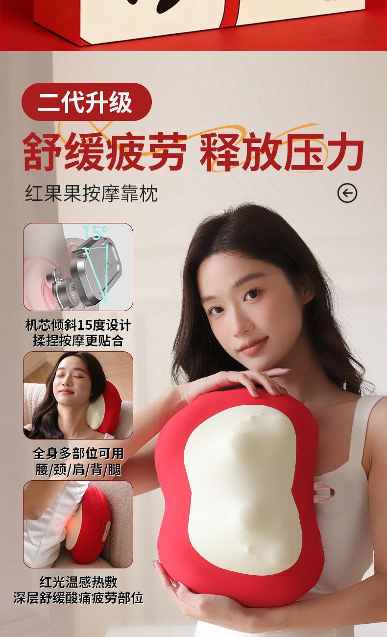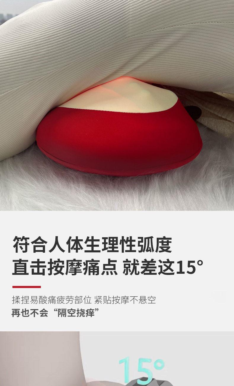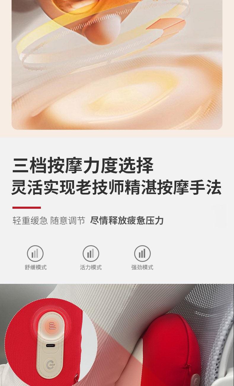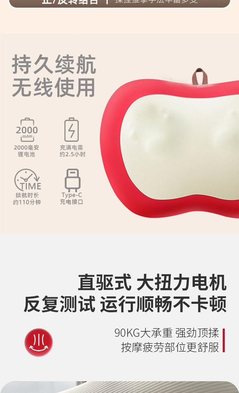 定输入:5V/2A 电池容量:1800毫安 力度挡位:3档 适用部位:颈/腰/背/腹/腿/臀 颜色:红色 蓝色 绿色 产品净重:约1.45KG 充电时间:约3小时 材质:记忆棉+高弹手感布 产品尺寸:345X281 X122MM 按摩体验类(直击痛点,模拟专业手感):15° 机芯倾斜设计,贴合人体生理弧度,直击按摩痛点,正转按压 + 反转揉捏,搭配三档力度,复刻老技师推拿手法,43° 红光温感热敷,深层舒缓酸痛疲劳,加速血液循环,全身多部位适配:腰 / 颈 / 肩 / 背 / 腿,一台满足全家需求,90KG 大承重,强劲顶揉不塌陷,按摩更到位