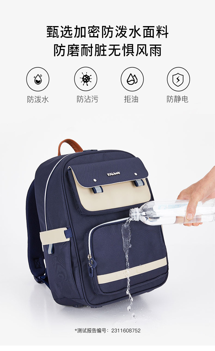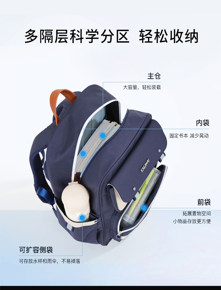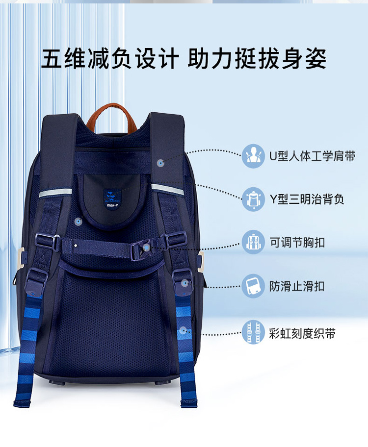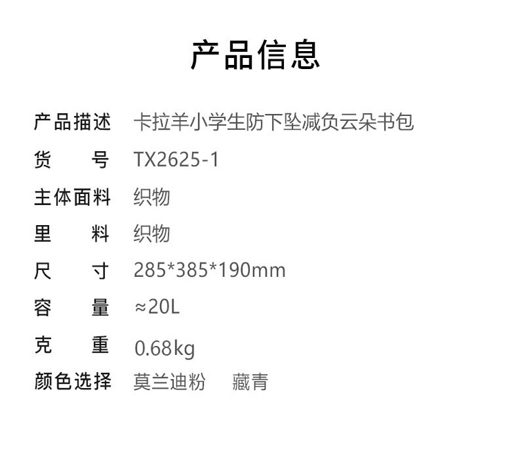货号:TX2625-1 主体面料:织物+合成革;里料:织物 颜色:藏青 定位:3-6年级/135以上-165cm 净重:0.68kg/20L