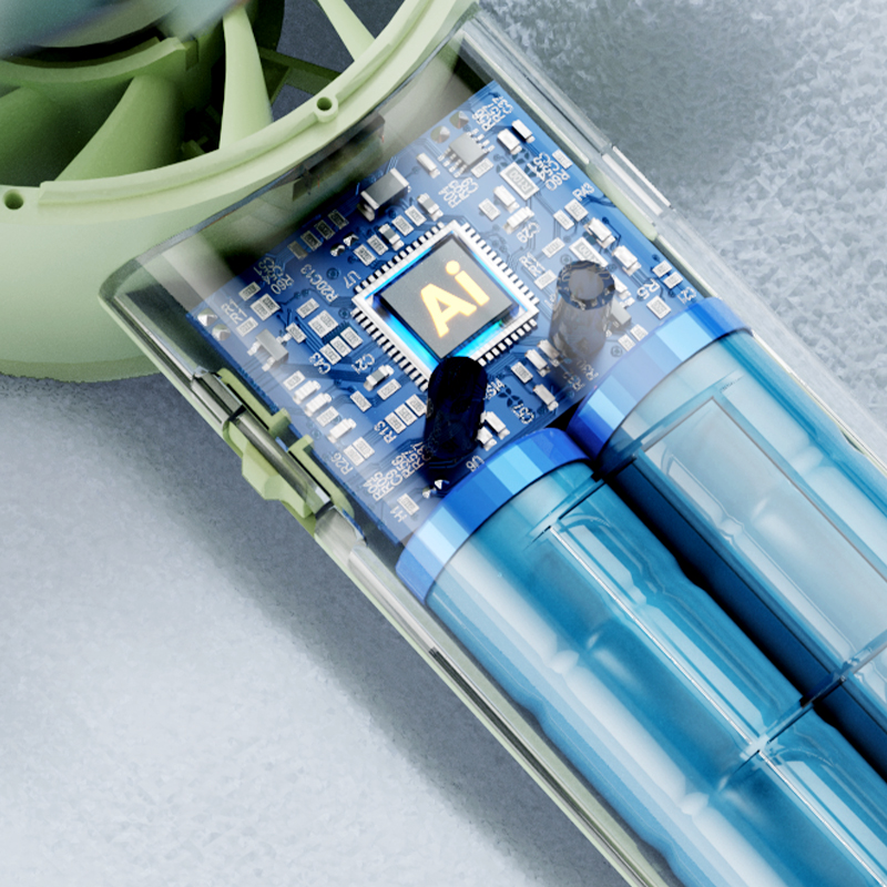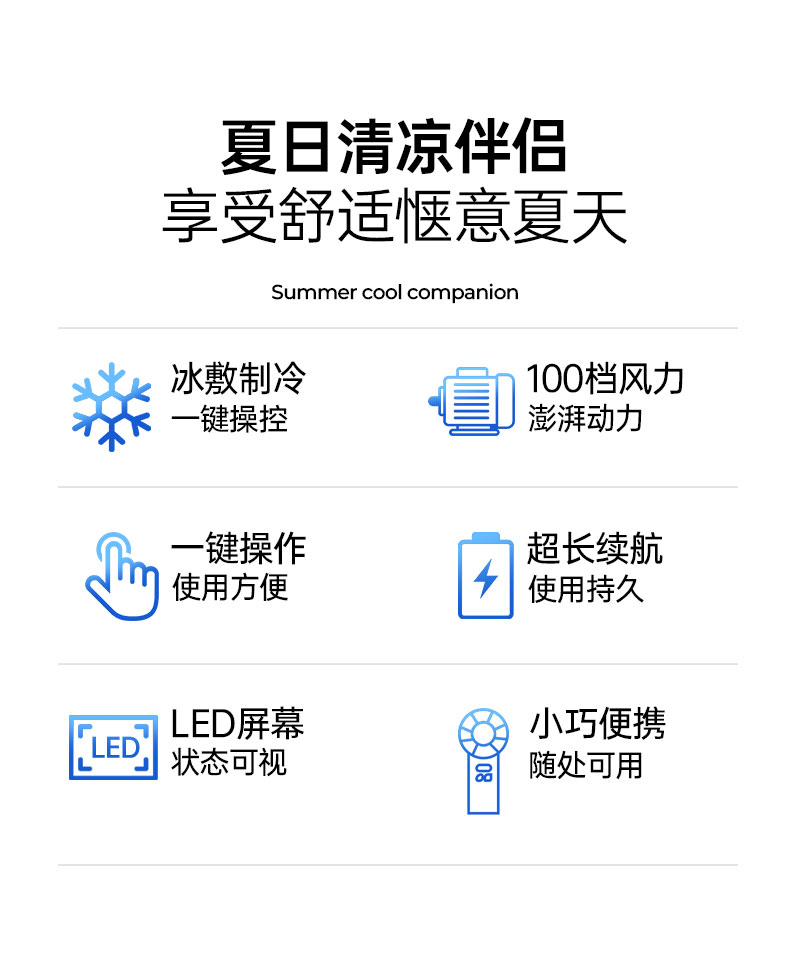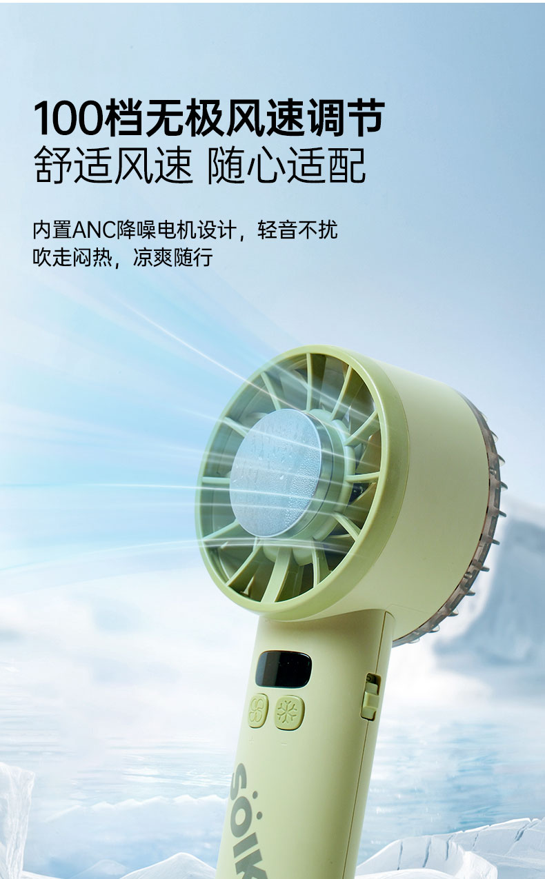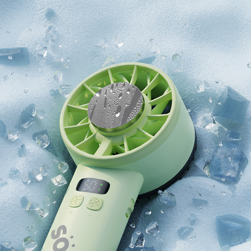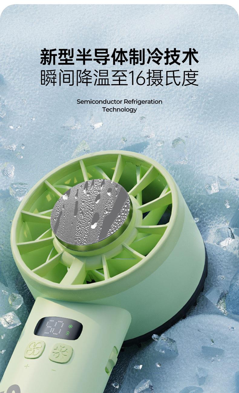 ● 新型半导体制冷技术,瞬间降温至16摄氏度 ● 1分钟即享冰敷感,凉爽加倍 ● 100档无极风速调节,舒适风速随心适配 ● 内置ANC降噪电机设计,轻音不扰 ● AI聚能芯片,低耗高能,性能稳定,续航时长 ● LED数显,状态一目了然 ● 大容量电池,充电时长约4H,可用约10H 5200毫安内置18650电池内置电池,续航大幅提升 (*以10档为例,风扇功能续航≈10H ,风扇+制冷续航≈3H/支持边充边用,仅风扇功能) ● 12叶扇面,风力切割极度均匀,舒适感强 ● 小巧便携,随处可用 ● 多场景应用:日常通勤、办公场景、野餐露营、旅行远足