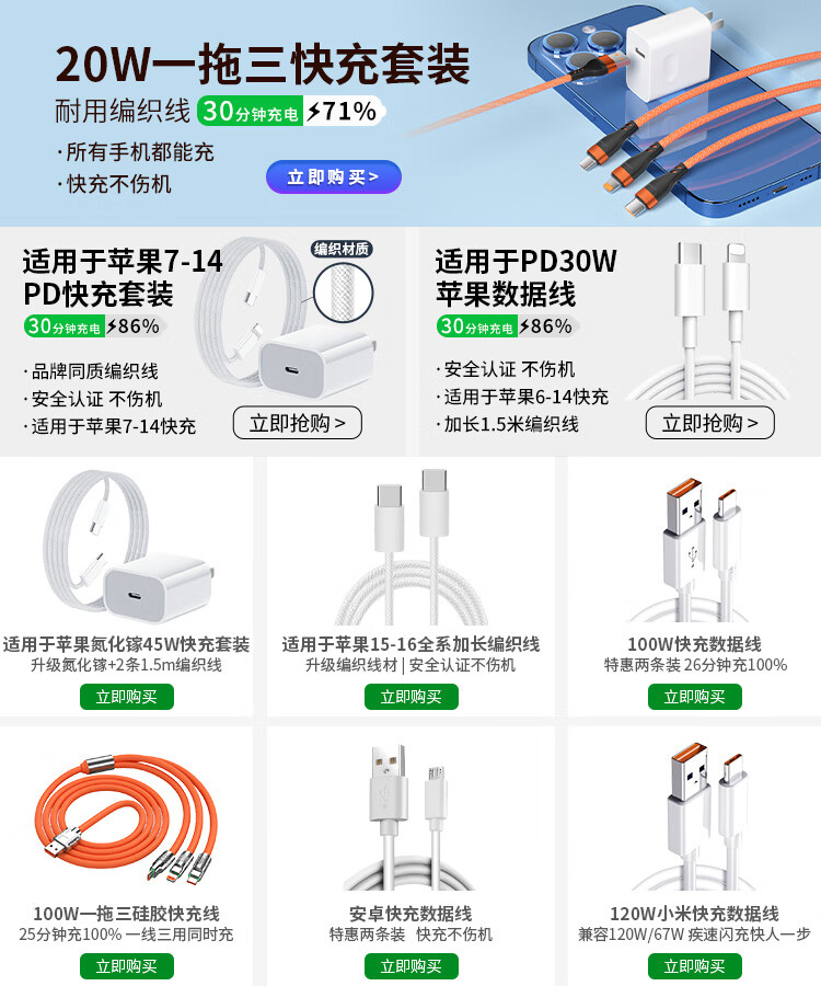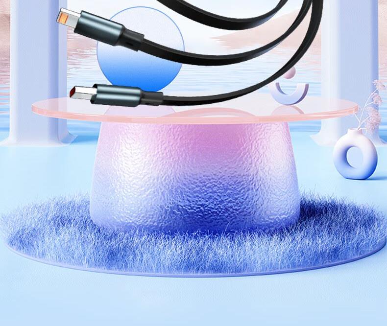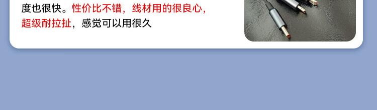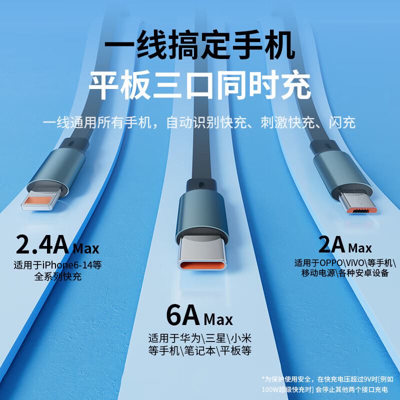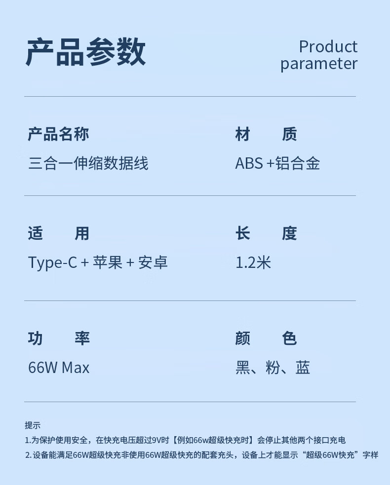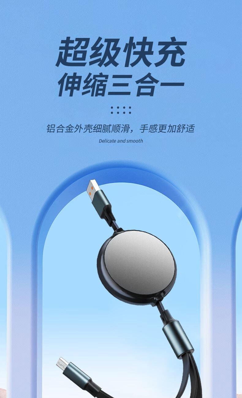 长度:1.2米 型号:OKSJ-快充伸缩一拖三数据线 电流:3A 接口:USB转TYPE-C、苹果、安卓 材质:柔性TPE+ABS 颜色:黑 长度:1.2米 功率:66W Max 接口:TYPE-C、苹果、Micro USB 材质:铝合金+ABS 铝合金外壳。