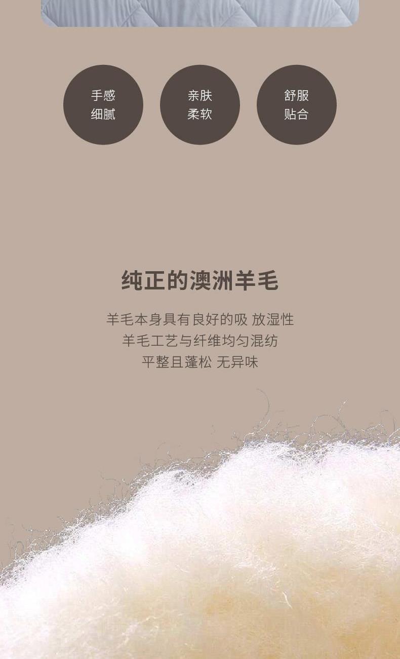 面 料:聚酯纤维 尺 寸:200×230cm 填充物 :羊毛 填充克重:1000g 填充:羊毛本身具有良好的吸、放湿性。澳洲进口羊毛,保暖性更佳,且无异味。 面料:手感细腻,亲肤柔软,舒适贴合; 工艺:细致包边,固定被芯。