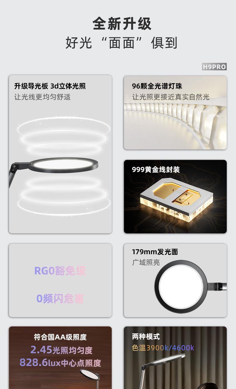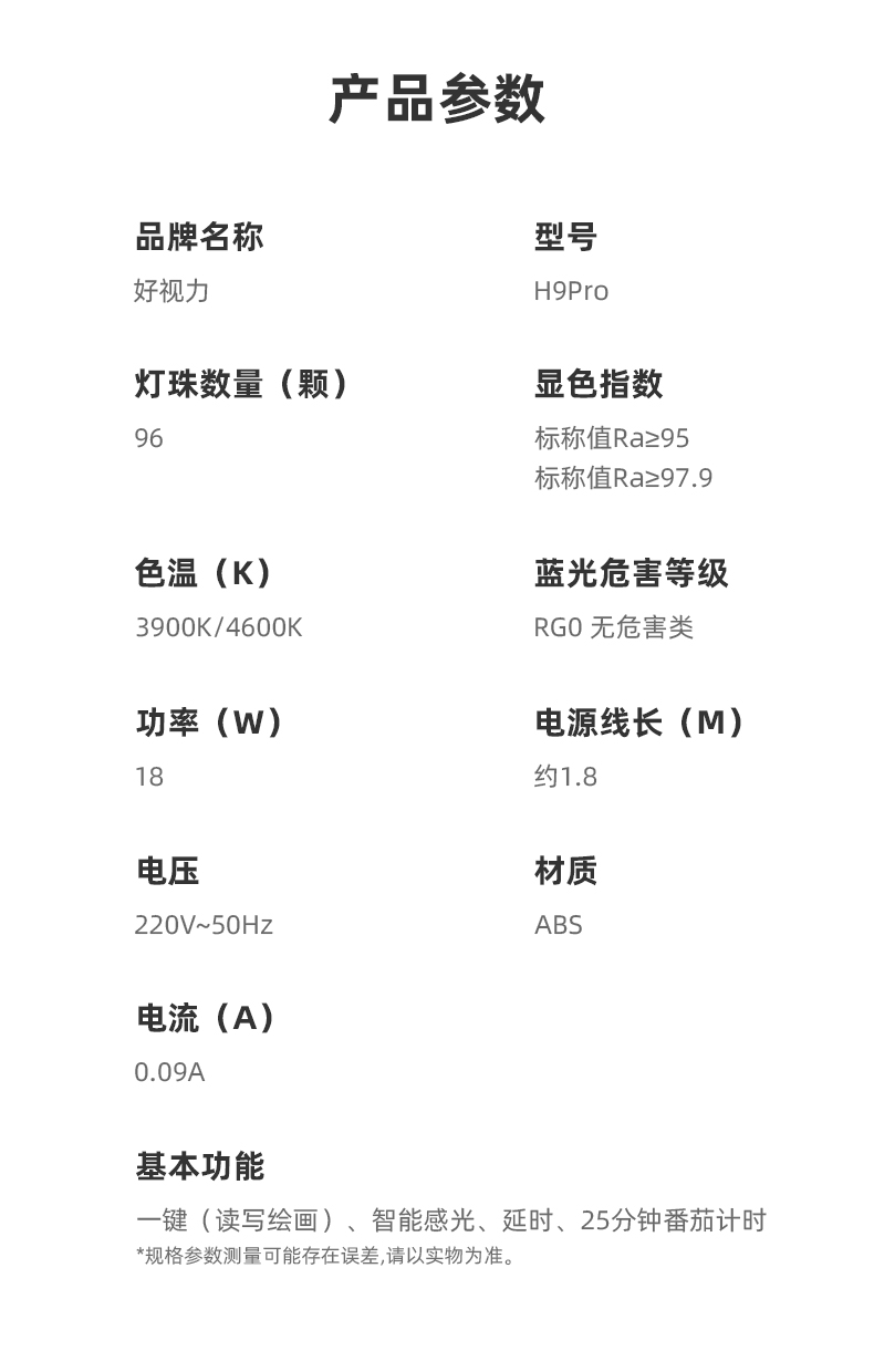 灯珠数量(颗):96 型号:H9Pro 显色指数:标称值Raz95 标称值Raz97.9 色温(K):3900K/4600K 功率(W):18 电压:220V~50Hz 蓝光危害等级:RG0 无危害类 电源线长(M):约1.8 材质:ABS