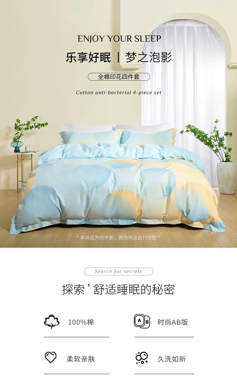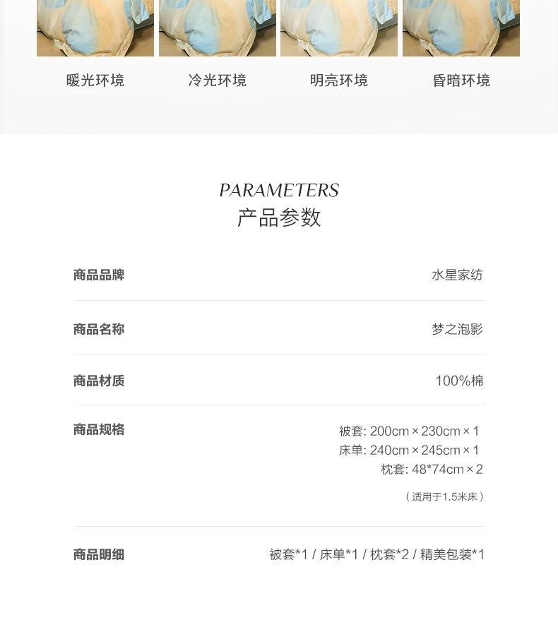 材质:棉 被套:200cm×230cm×1 床单:240cm×245cm×1 枕套:48cm×74cm×2