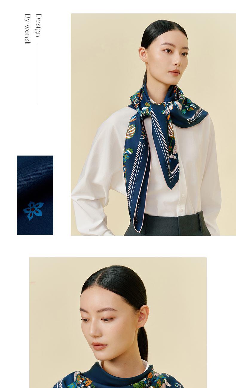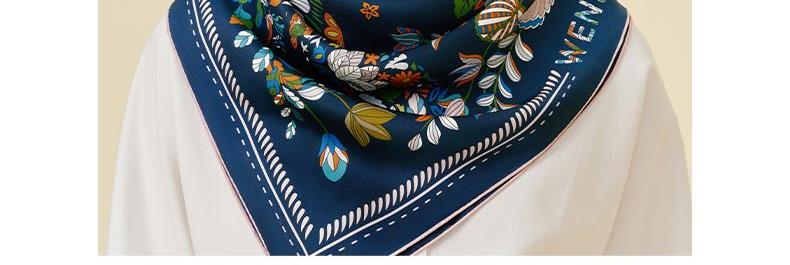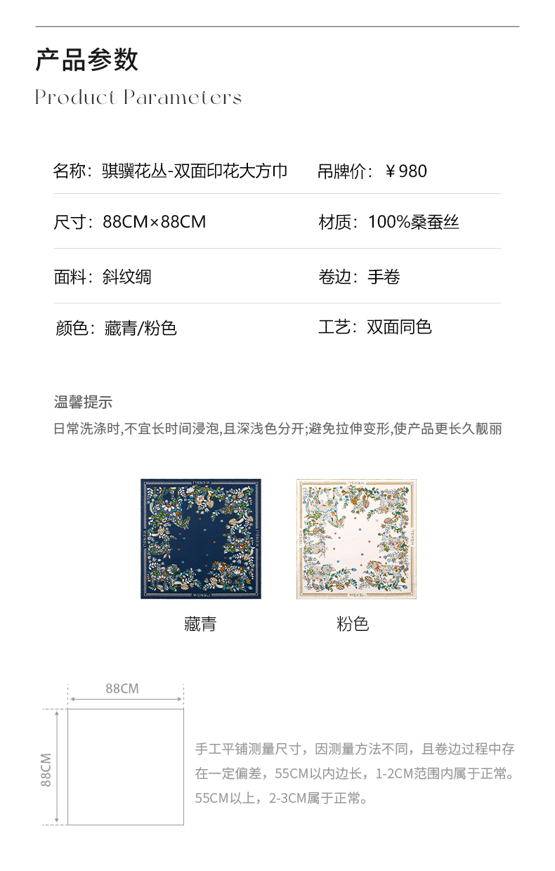 尺寸:88CM×88CM 材质:100桑蚕丝 面料:斜纹绸 卷边:手卷 颜色:藏青/粉色 工艺:双面同色