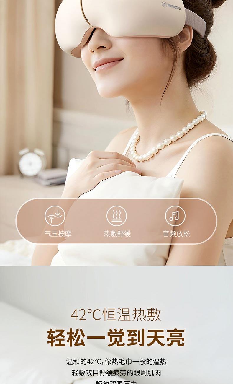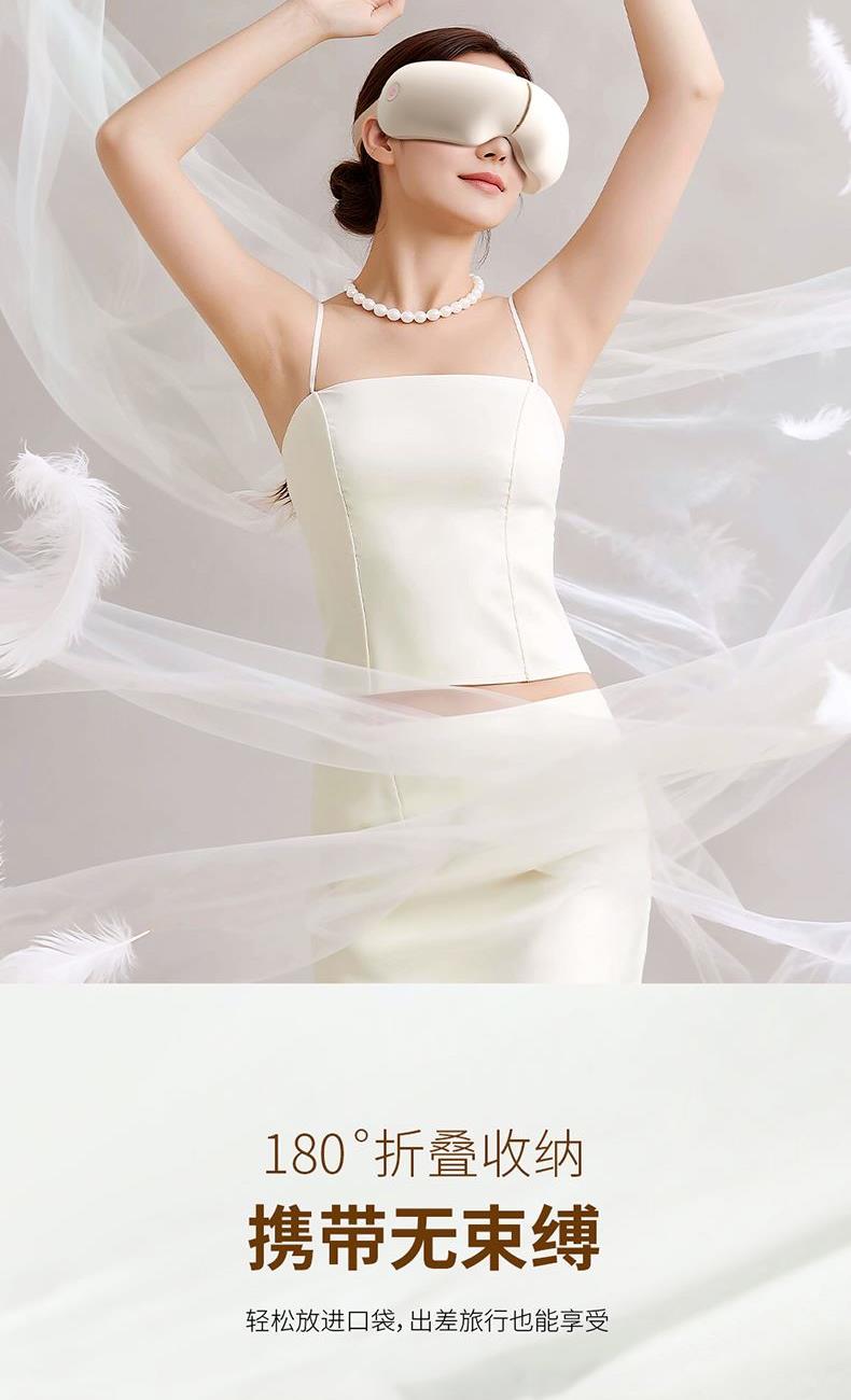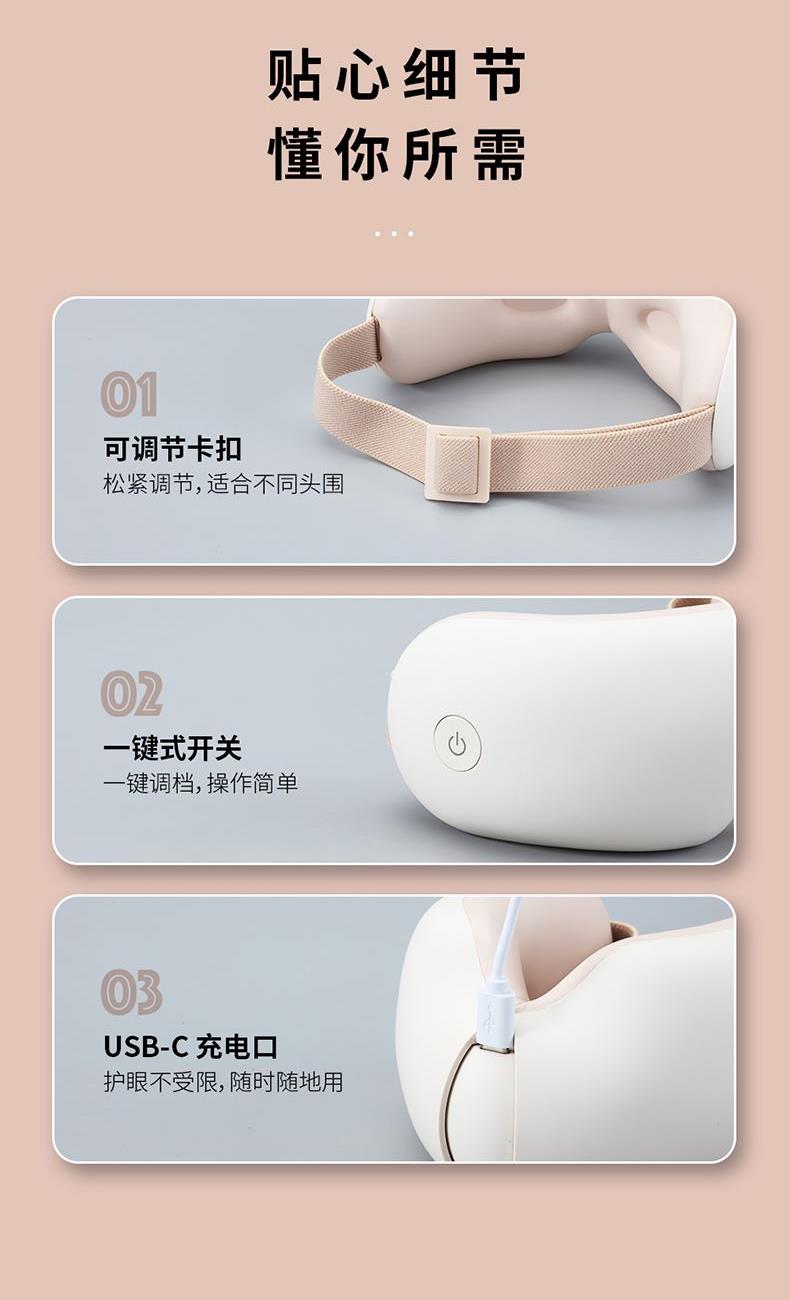 产品规格: 1、额定电压:3.7V 2、额定功率:5W 3、电池容量:1200mAh 4、外壳材质:ABS+PC 5、眼罩材质:蛋白皮 6、工作时长:15min 7、产品颜色:米黄色 产品特点: 1、可180°折叠,方便携带; 2、使用蛋白皮眼罩,更易清洁; 3、双层气袋揉压设计更紧贴于眼部; 4、可连接蓝牙立体播放/内置静心音乐; 5、42±3℃恒温热敷,缓解疲劳更舒服; 6、五档工作模式,多场合可用。