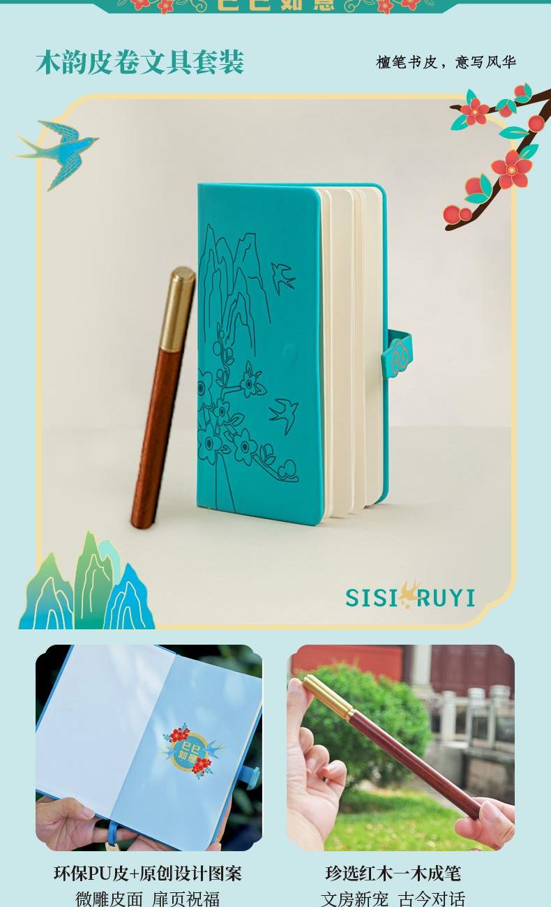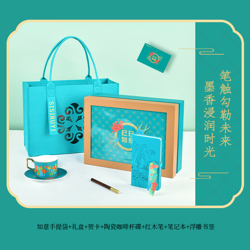 如意毛毡包*1 相框型主题礼盒*扉页*1 精致陶瓷咖啡杯碟&勺子*1 48K如意笔记本*1 古韵木质签字笔*1 巳巳如意主题书签*1 主题贺卡*1