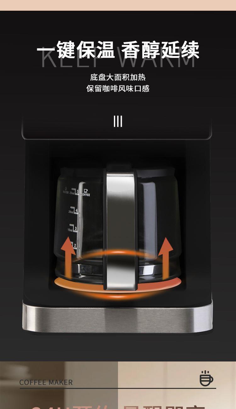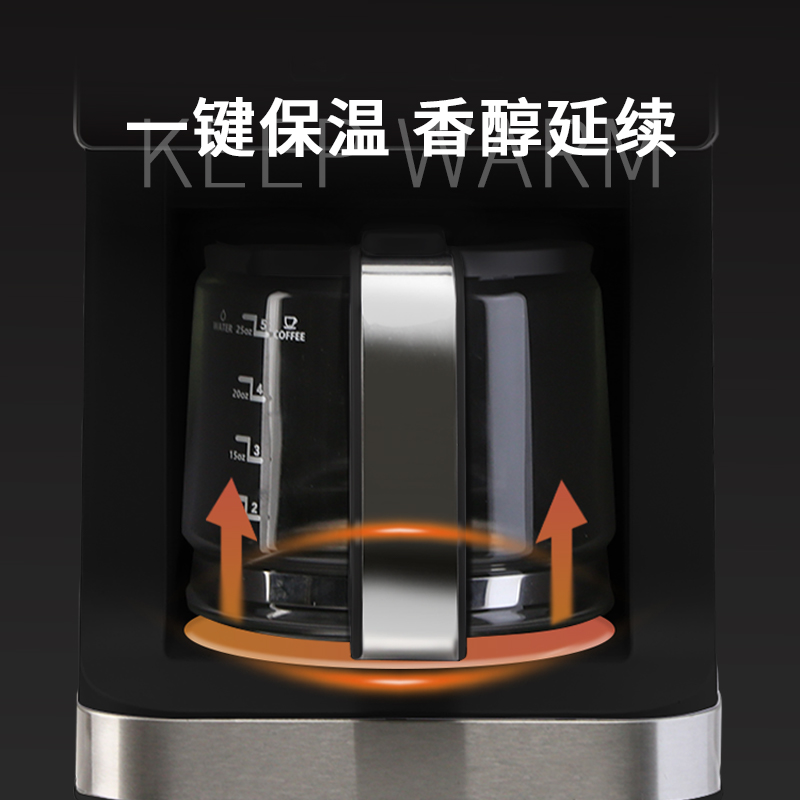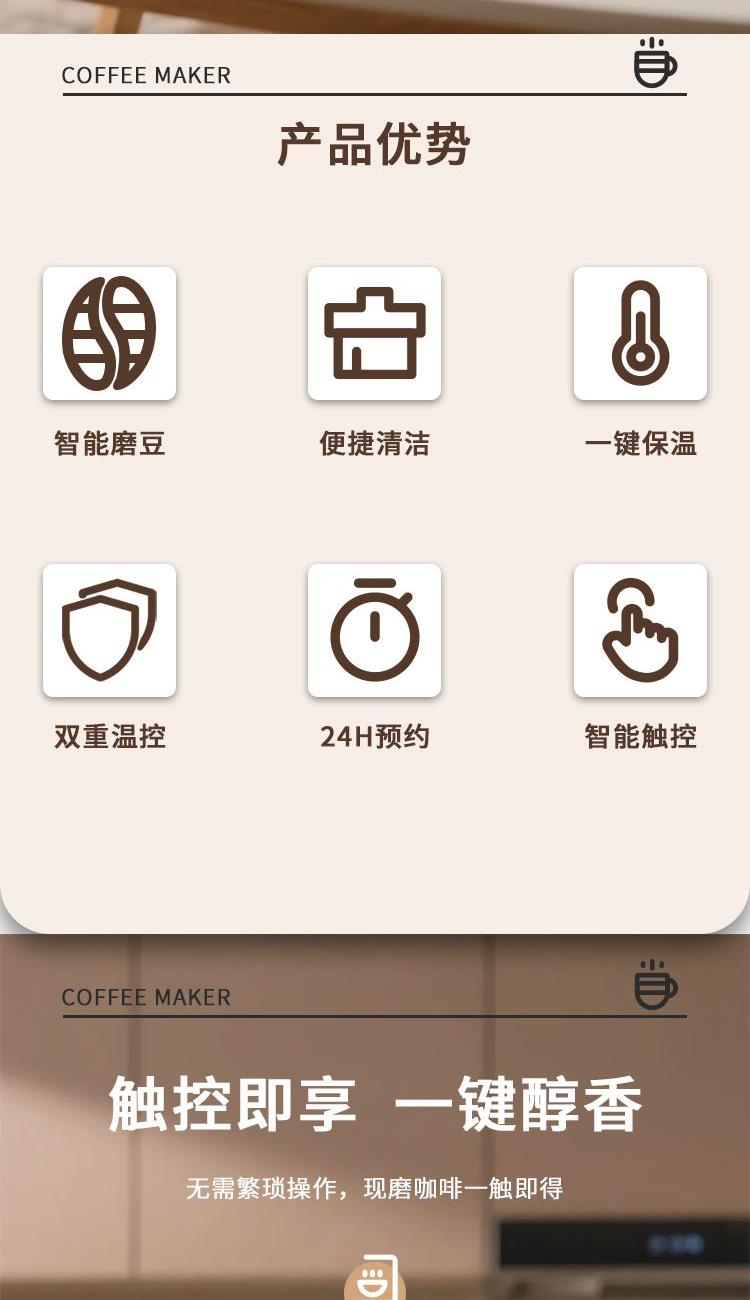 产品参数 额定电压:220V~ 额定频率:50Hz 加热功率:900W 磨豆功率:150W 产品净重:3.0kg 产品毛重:3.6kg 彩盒尺寸:366×231×347mm 产品特点 1、磨豆和咖啡粉双功能滴漏咖啡机 2、操作面板IMD工艺触摸控制,带图标显示 3、可预约24H,自带磨豆功能,三种磨豆粗细选择,粗10S/中等20S/细分30S 4、底部自带保温功能