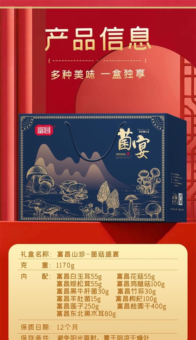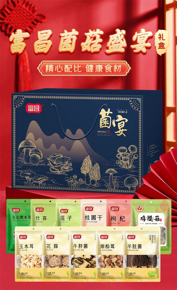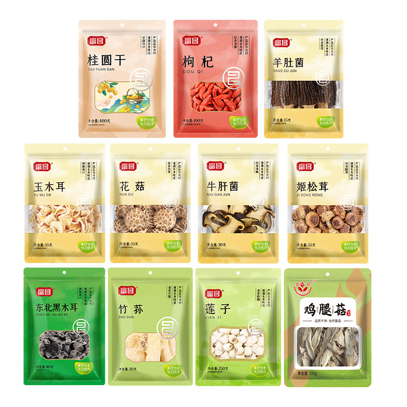 富昌东北黑木耳80g 富昌白玉耳55g 富昌花菇55g 富昌竹荪30g 富昌鸡腿菇100g 富昌黑牛肝菌30g 富昌姬松茸55g 富昌羊肚菌15g 富昌枸杞100g 富昌莲子250g 富昌桂圆干400g