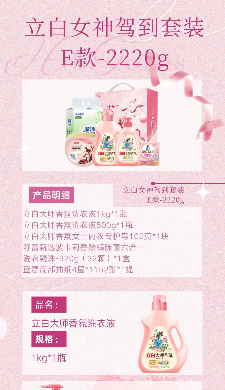 配置: 立白大师香氛洗衣液1kg*1瓶 立白大师香氛洗衣液500g*1瓶 立白大师香氛女士内衣专护皂102克*1块 舒蕾甄选波卡莉香除螨除 菌六合一洗衣凝珠-320g(32颗)*1盒 蓝漂底部抽纸4层*1152张*1提 核心卖点: 可选产品丰富多样,礼箱随心组合,多种价位因需而定,充分满足各种送礼需求,是商务送礼、单位福利的用心之选。