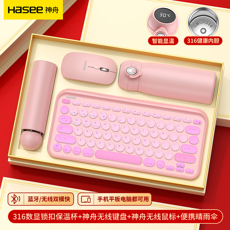 【产品配置】键盘S5+鼠标+弹跳杯+五折伞 【产品型号】LXX-05 【产品颜色】樱花粉,薄荷绿,宝石蓝 【定制工艺】印刷、雕刻 【包装尺寸】40*29.5*7.8cm