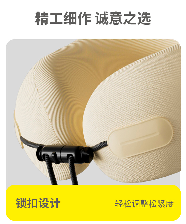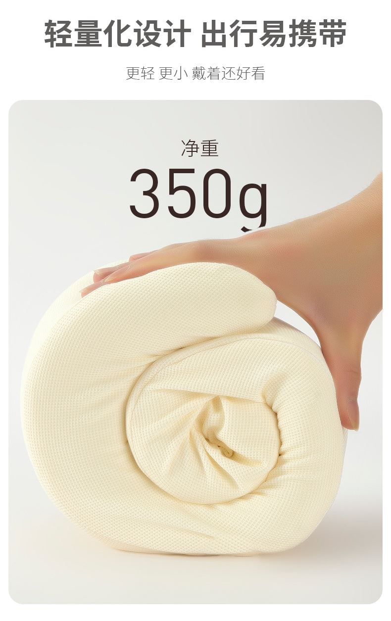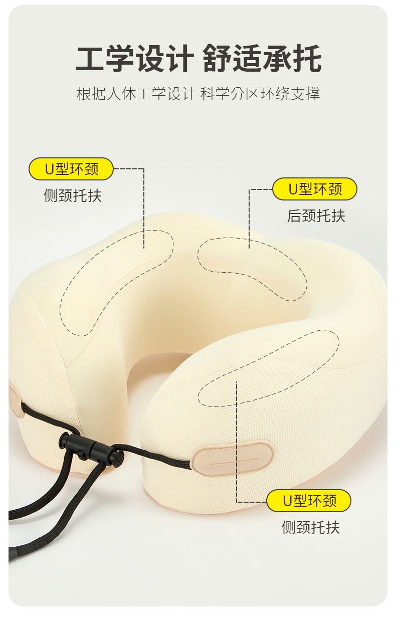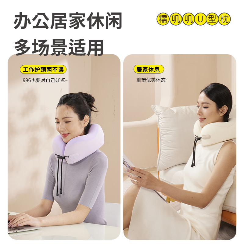 糯叽叽U型枕 型号:UF-1 外圈:涤纶 枕芯:记忆棉 净重:0.35kg 执行标准:GB 18401-2010-B 类 内圈:87%锦纶 13%氨纶 尺寸:25*25*13cm 颜色:象牙白 风信紫 护颈内核,9小时+旅行不累 双内核技术,内芯护颈,外芯舒缓压力 360°包裹减压,前后左右承托头部 透气面料,凉感舒适