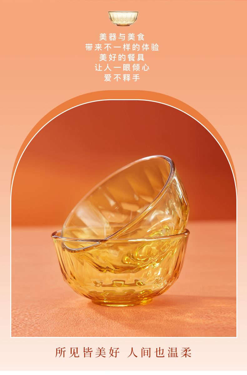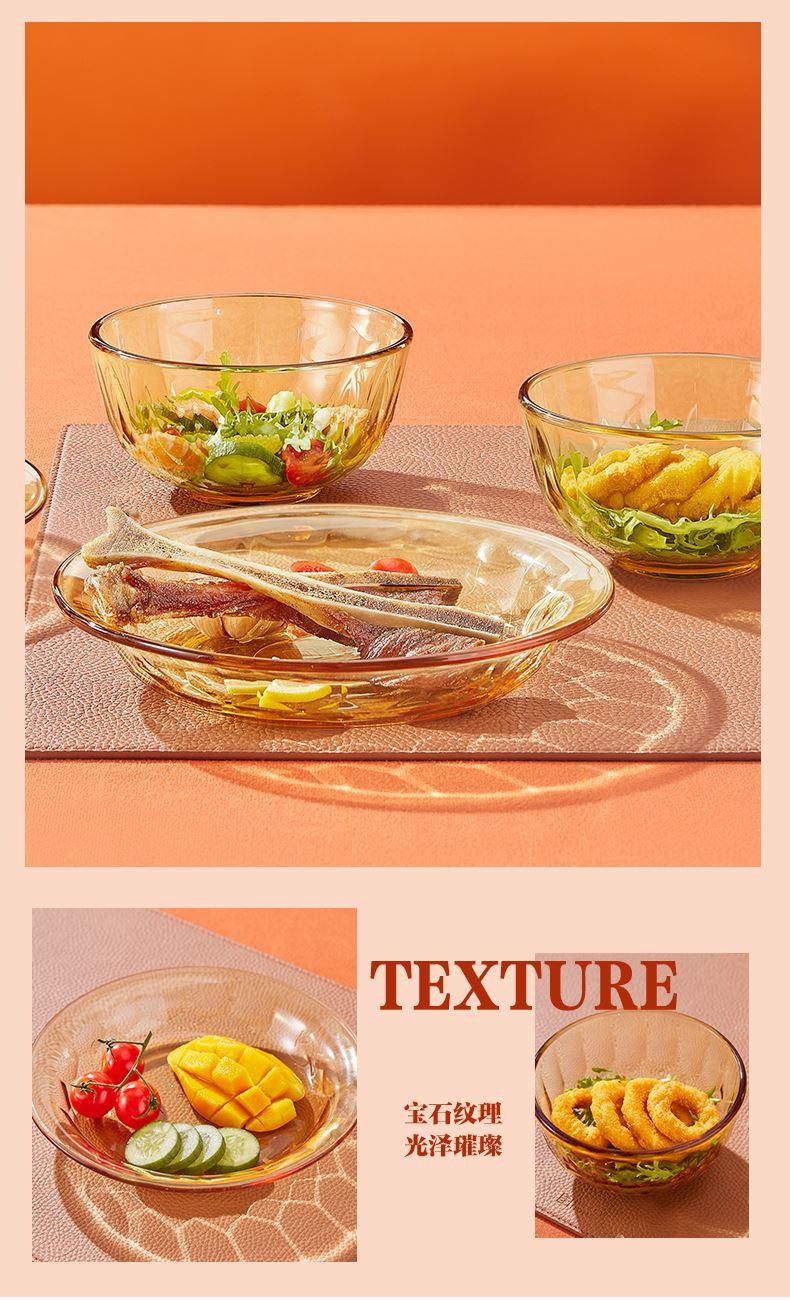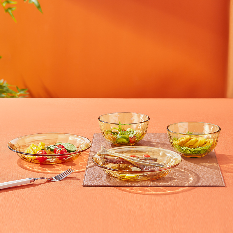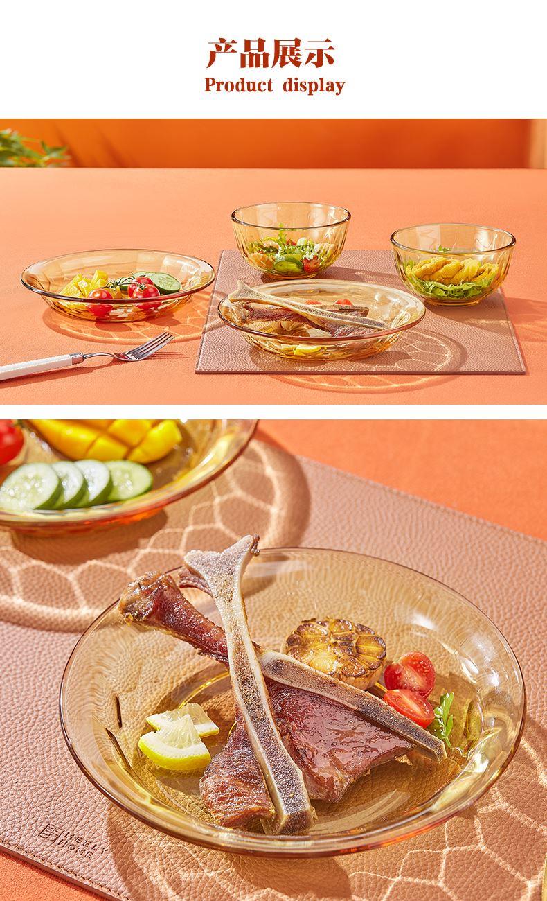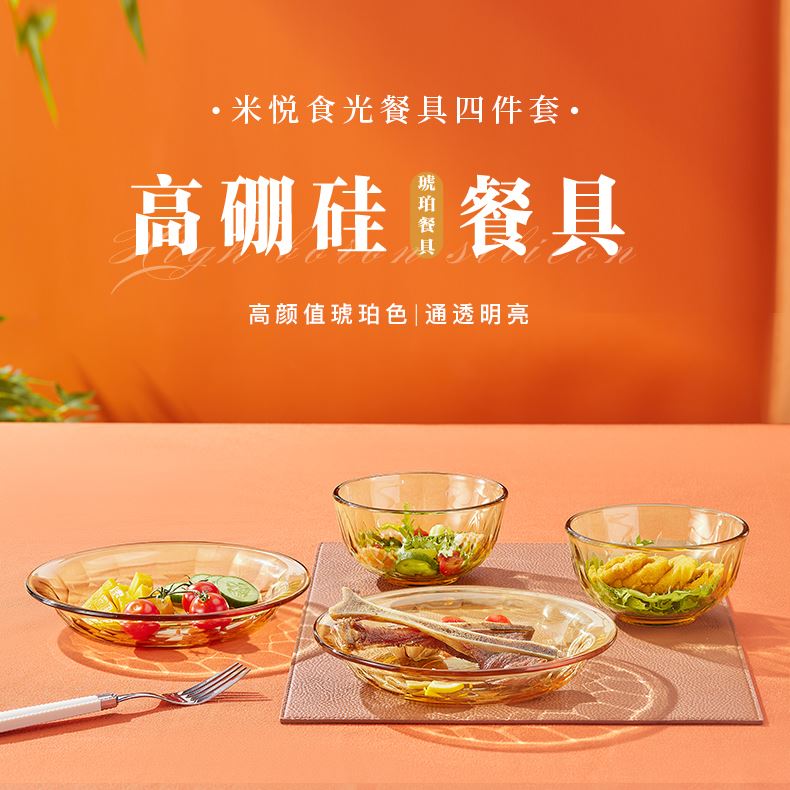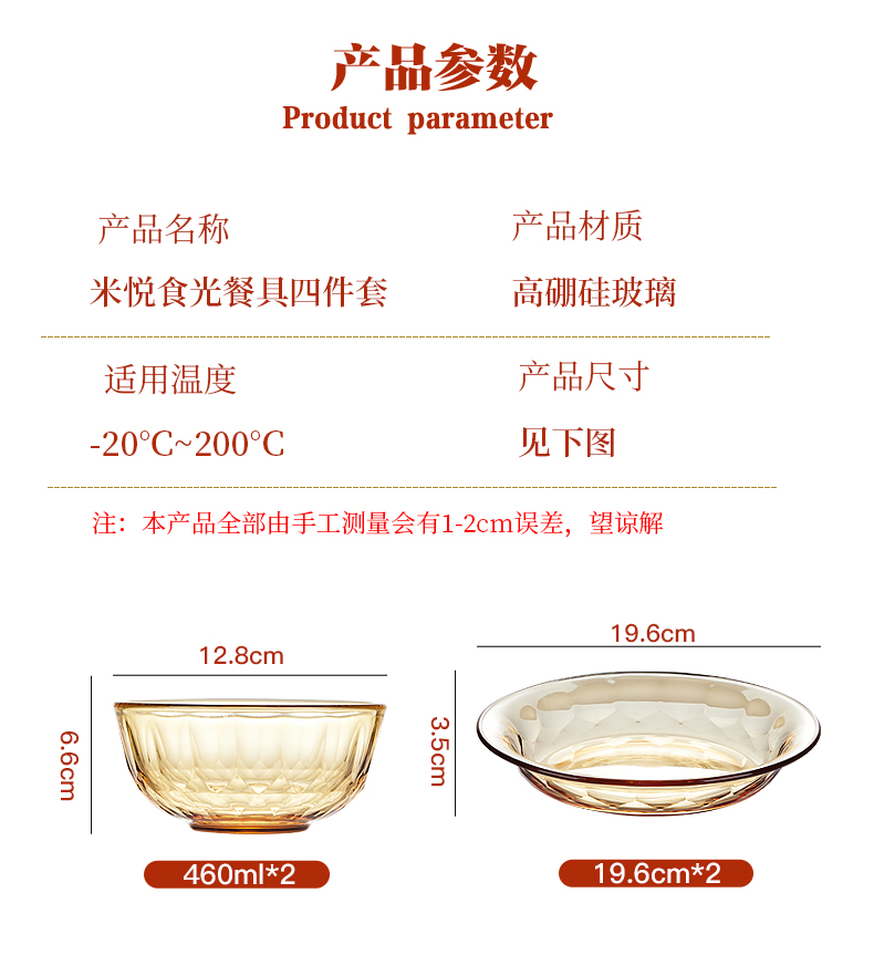 产品规格:小碗460ml*2、 盘196mm*2 产品材质:高硼硅玻璃 彩盒尺寸:342*82*259mm 外箱尺寸:43.5*35.4*53.7cm 外箱毛重:16.5kg 产品特点: 1.产品采用高硼色料玻璃材质,颜色与生俱来,永不退色。烤箱、微波炉、冰箱冷冻放心使用。2.高硼餐具设计理念,用线条勾勒几何切面,以面为境折射时光、徜徉星空。3.触感温润,为您的餐桌增添一抹高雅。