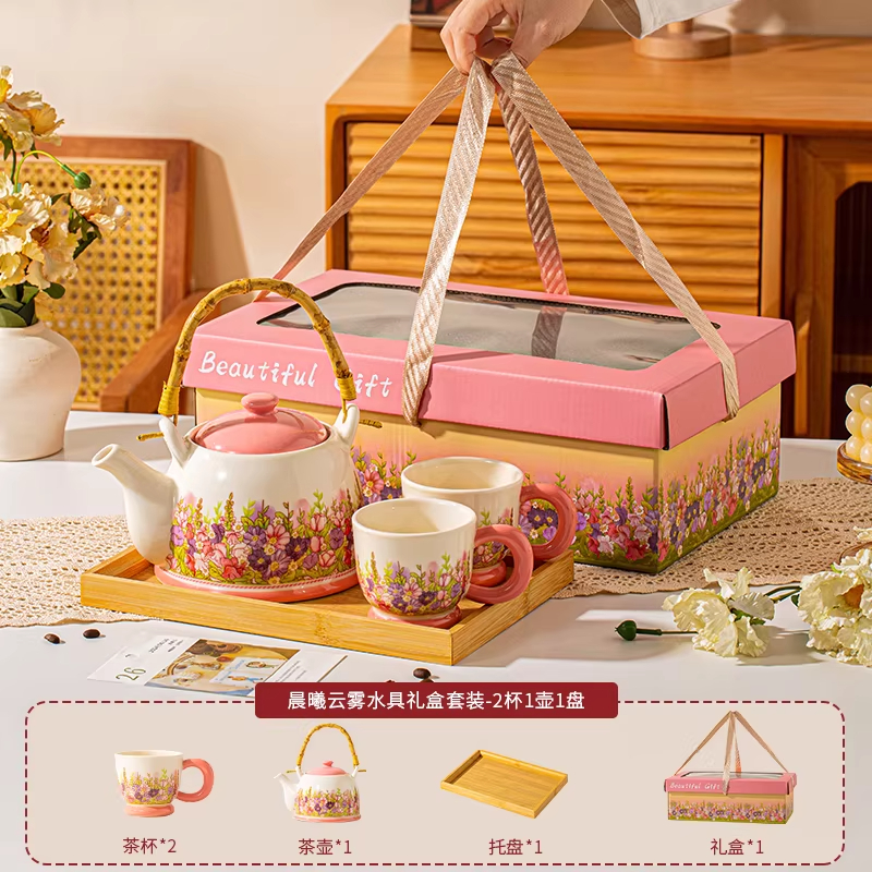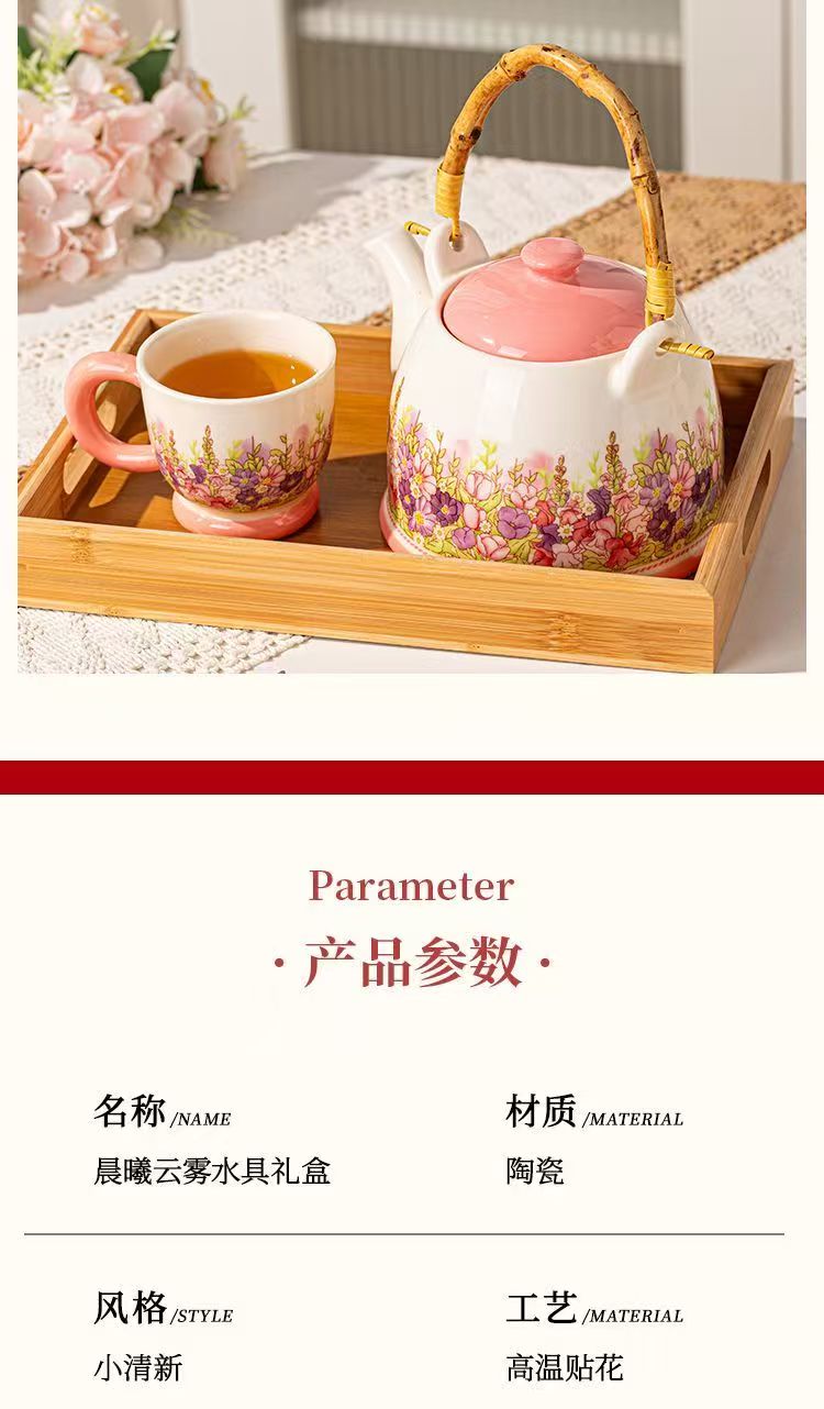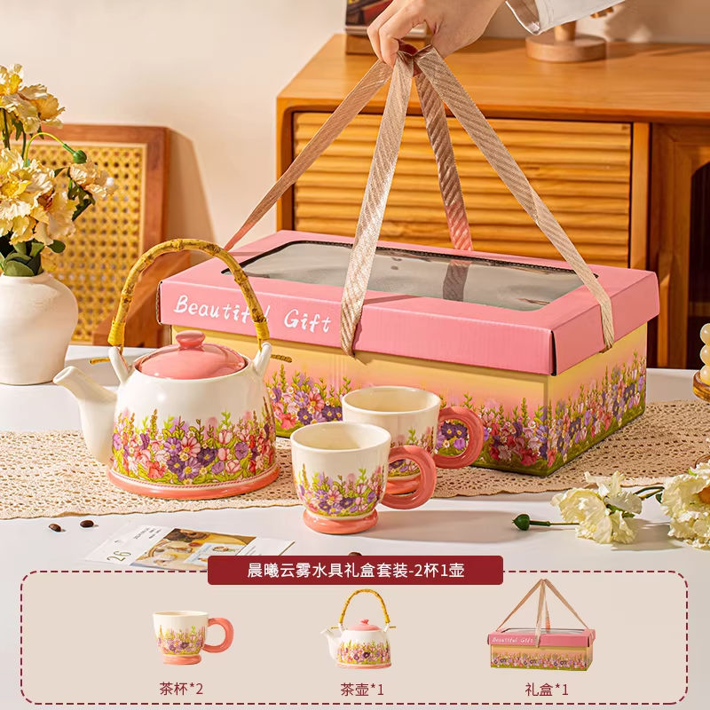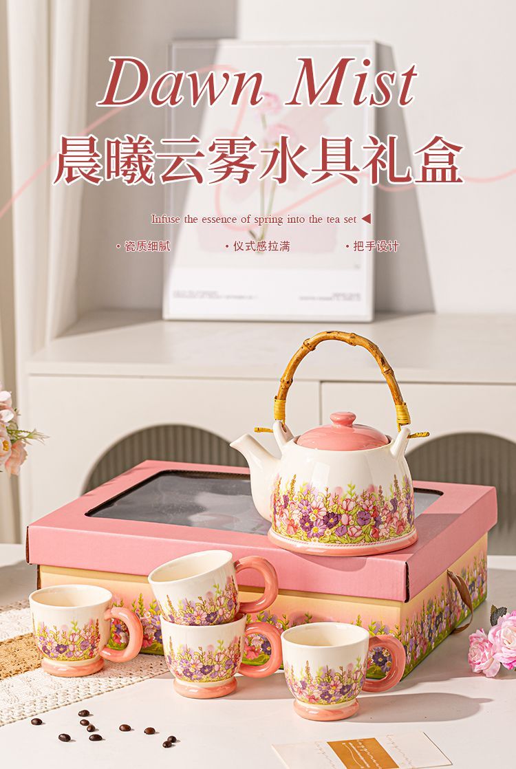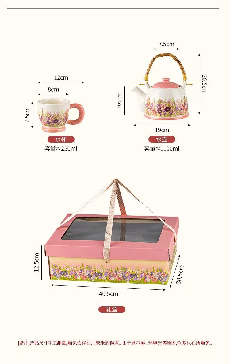 产品尺寸:杯口径8cm*高7.5cm,壶口径7.5cm*高9.6cm 容 量:杯250ml,壶1100ml 配 件:2杯+1壶(另外加托盘:小10.2元) 包装尺寸:38.4*22.1*13.5cm 外箱尺寸:54* 39.5* 67cm 16.4kg 产品特点: 春日繁花浮雕:手绘紫粉花簇沿壶身与杯壁绽放,釉色温润细腻,像把整个春天的温柔都封存在瓷里。 暖色系配色:奶白瓷底 + 柔粉壶盖 / 杯底,搭配天然竹制提梁,温柔又有质感,摆在哪都是一道风景。 仪式感拉满:一壶多杯的礼盒装,无论是晨间泡茶、午后会客,还是送客户给闺蜜、长辈当礼物,都体面又贴心,开窗礼盒自带时尚感,送礼自用都有仪式感。