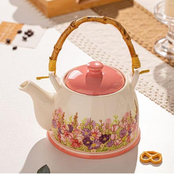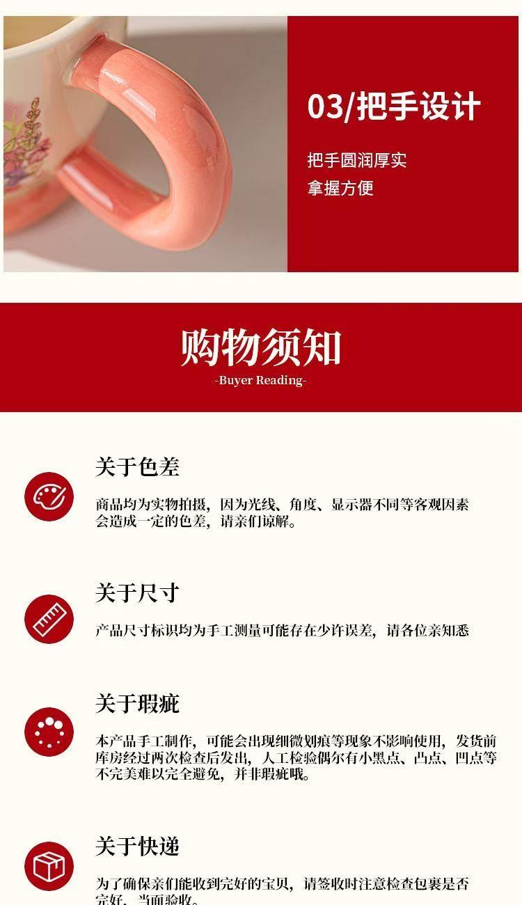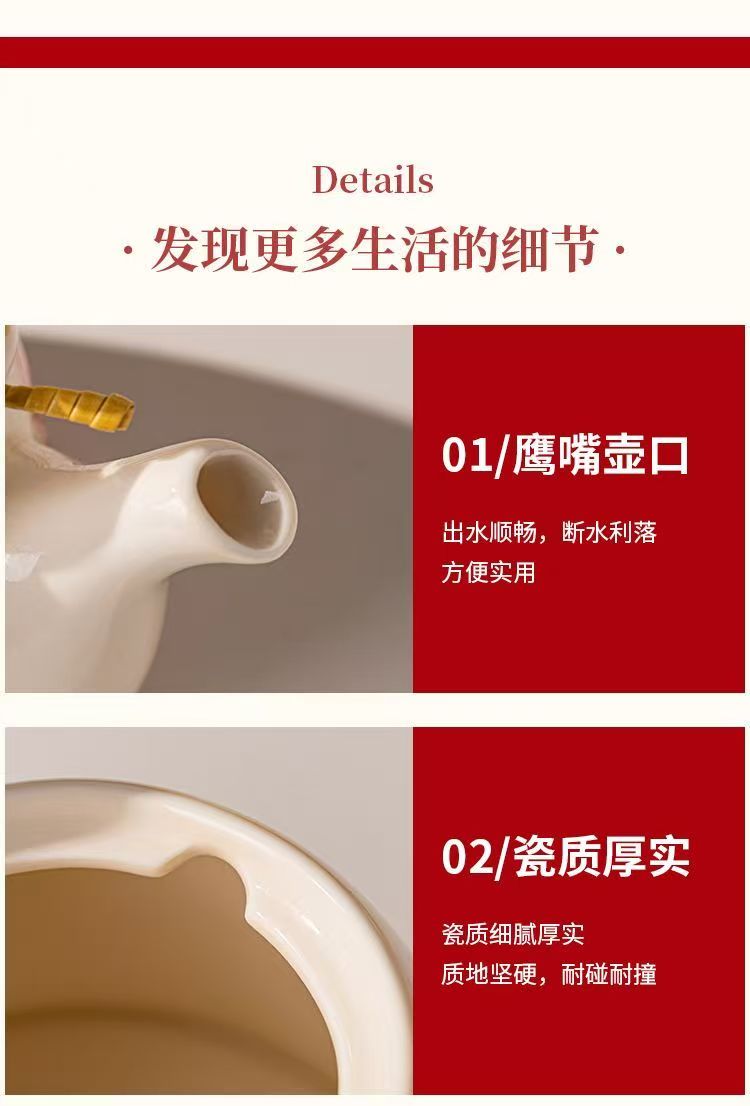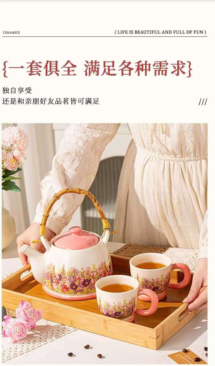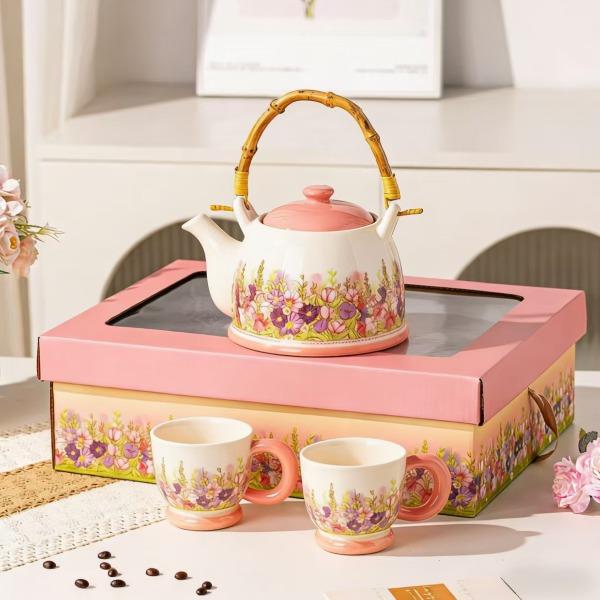 产品尺寸:杯口径8cm*高7.5cm,壶口径7.5cm*高9.6cm 容 量:杯250ml,壶1100ml 配 件:2杯+1壶(另外加托盘:小10.2元) 包装尺寸:38.4*22.1*13.5cm 外箱尺寸:54* 39.5* 67cm 16.4kg 产品特点: 春日繁花浮雕:手绘紫粉花簇沿壶身与杯壁绽放,釉色温润细腻,像把整个春天的温柔都封存在瓷里。 暖色系配色:奶白瓷底 + 柔粉壶盖 / 杯底,搭配天然竹制提梁,温柔又有质感,摆在哪都是一道风景。 仪式感拉满:一壶多杯的礼盒装,无论是晨间泡茶、午后会客,还是送客户给闺蜜、长辈当礼物,都体面又贴心,开窗礼盒自带时尚感,送礼自用都有仪式感。