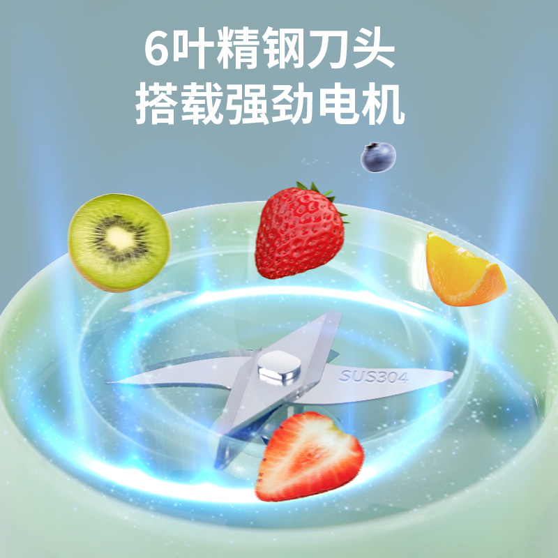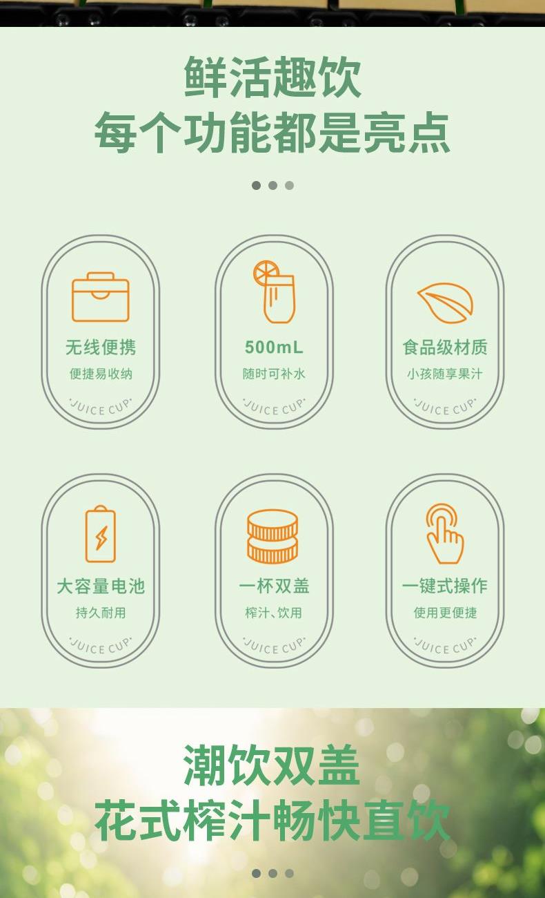 产品参数 工作功率:40W 工作电压:3.7V ⎓ 充电电压:5V ⎓ 充电电流:1A 电池容量:1300mAh 额定容量:500ml 产品净重:0.5kg 产品毛重:0.66kg 彩盒尺寸:115X115X190mm 外箱尺寸:480X360X400mm 产品特点 1、独特的外观、无线便携设计。 2、双盖搭配,搅拌直饮皆可行。 3、双击启动开关设计,点动关闭工作,随意控制实物切碎程度。 4、食品级搅拌杯,食品级不锈钢刀,易清洗,健康卫生。