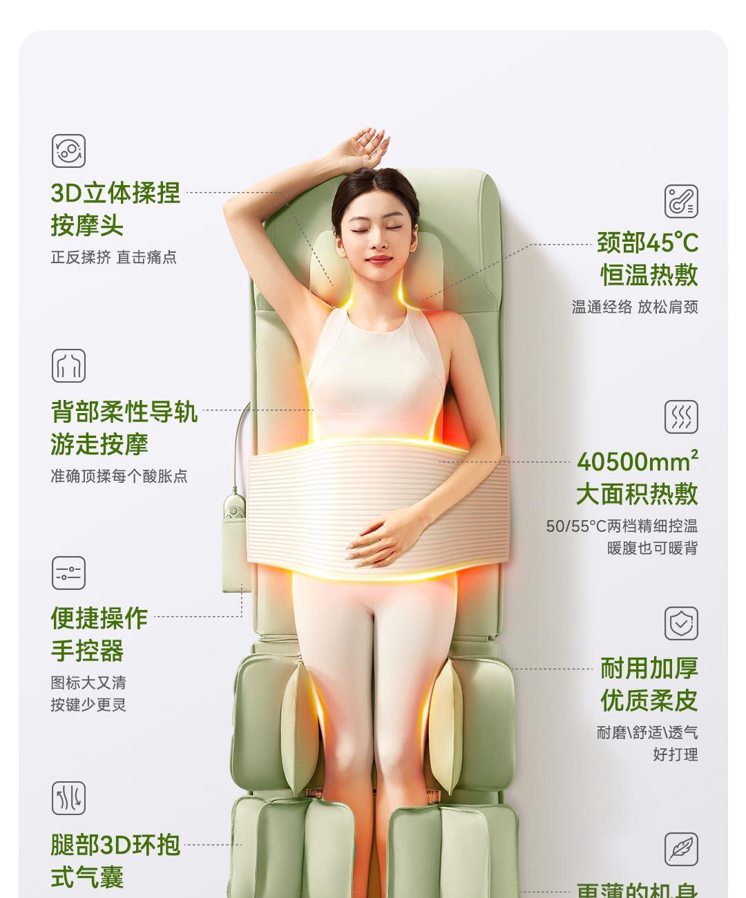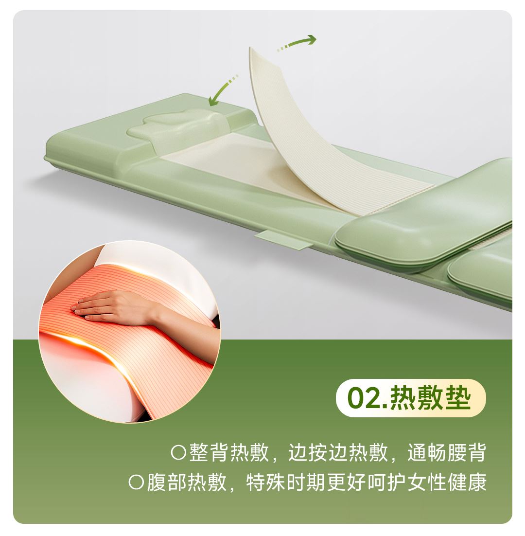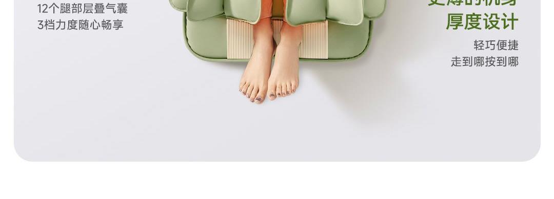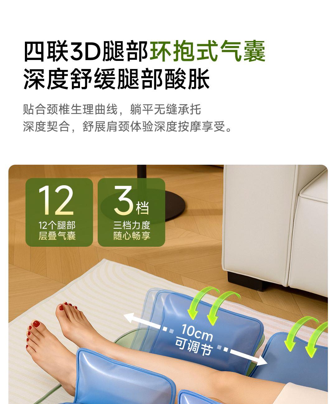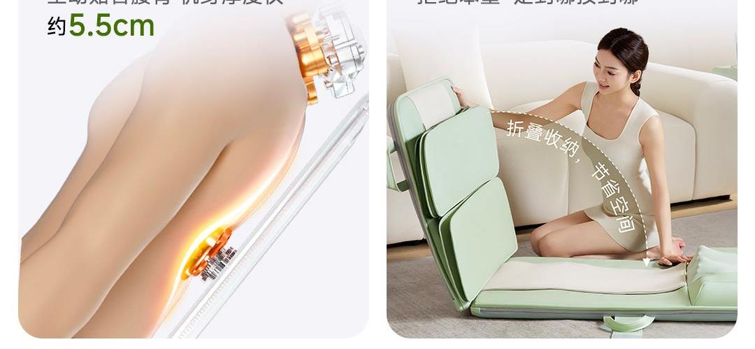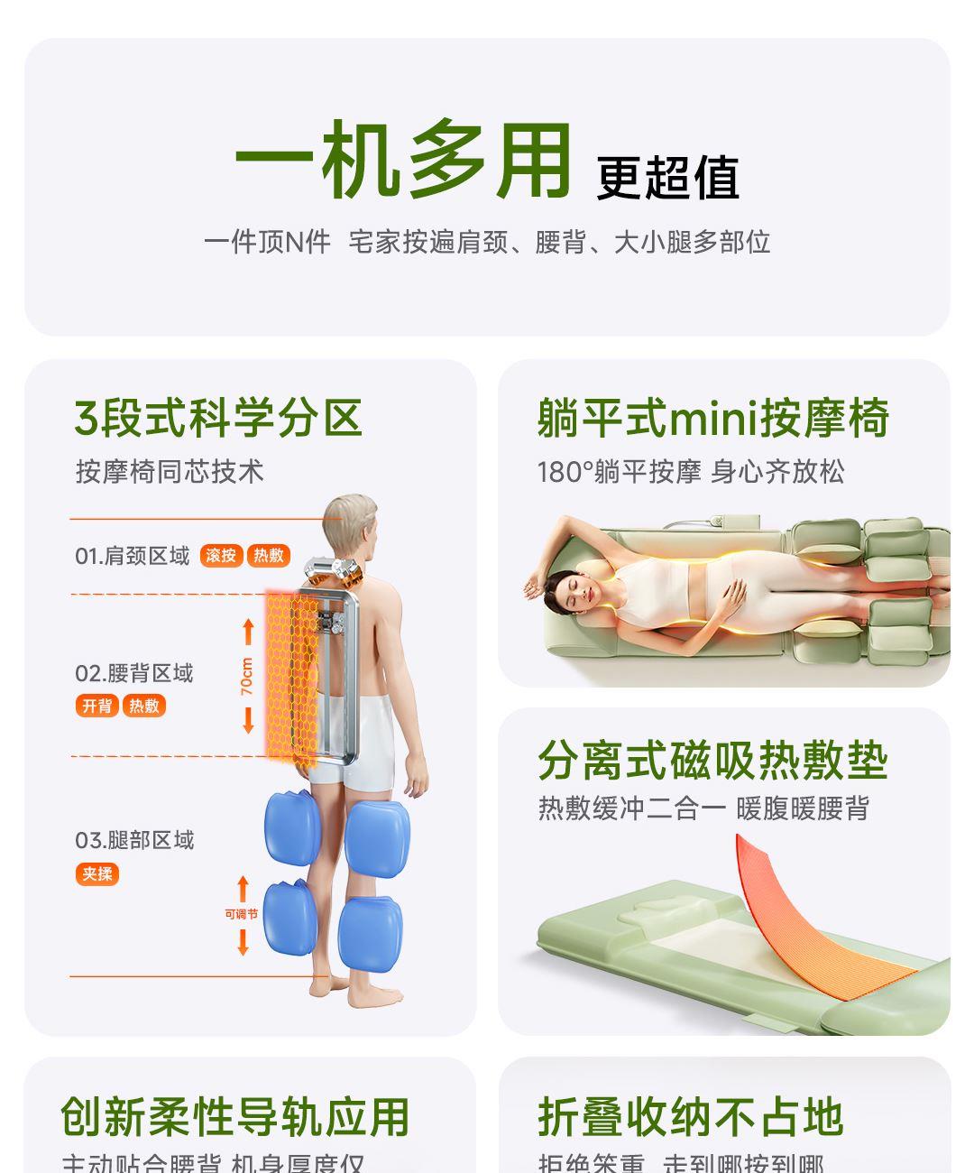 1机多用更超值,宅家按遍肩颈、腰背、大小腿多部位 3段式科学分区,按摩椅同芯技术 躺平式mini按摩椅,180°躺平按摩 身心齐放松 分离式磁吸热敷垫,热敷缓冲二合- 暖腹暖腰背 创新柔性导轨应用,主动贴合腰背 机身厚度仅约5.5cm 折叠收纳不占地,拒绝笨重 走到哪按到哪 全家人的专属按摩师,三档力度模式,满足不同需求