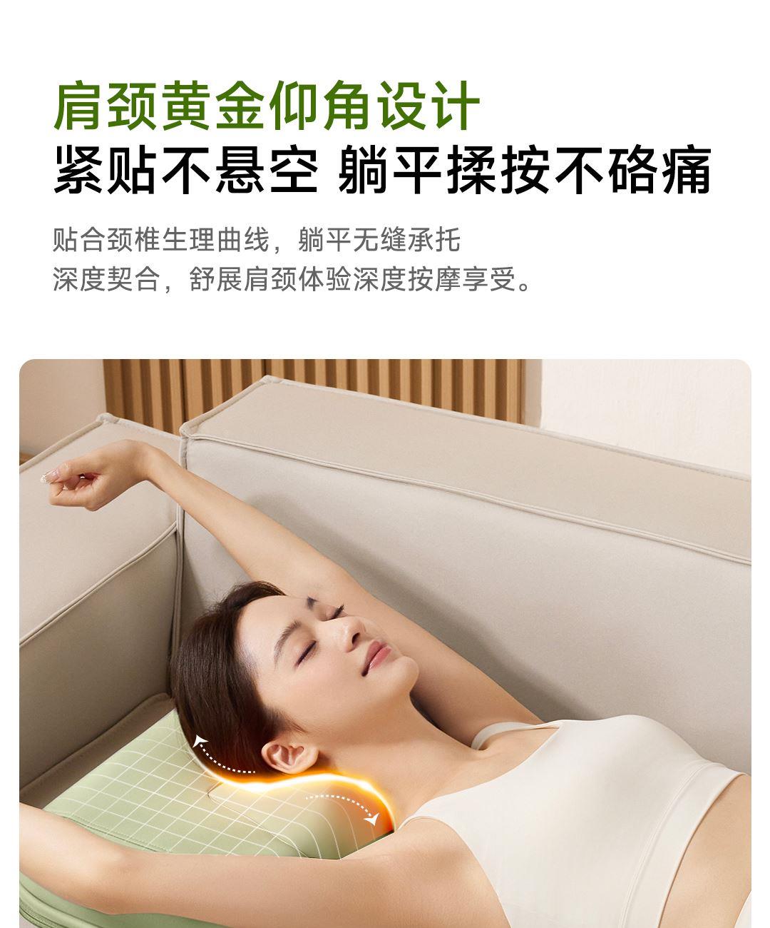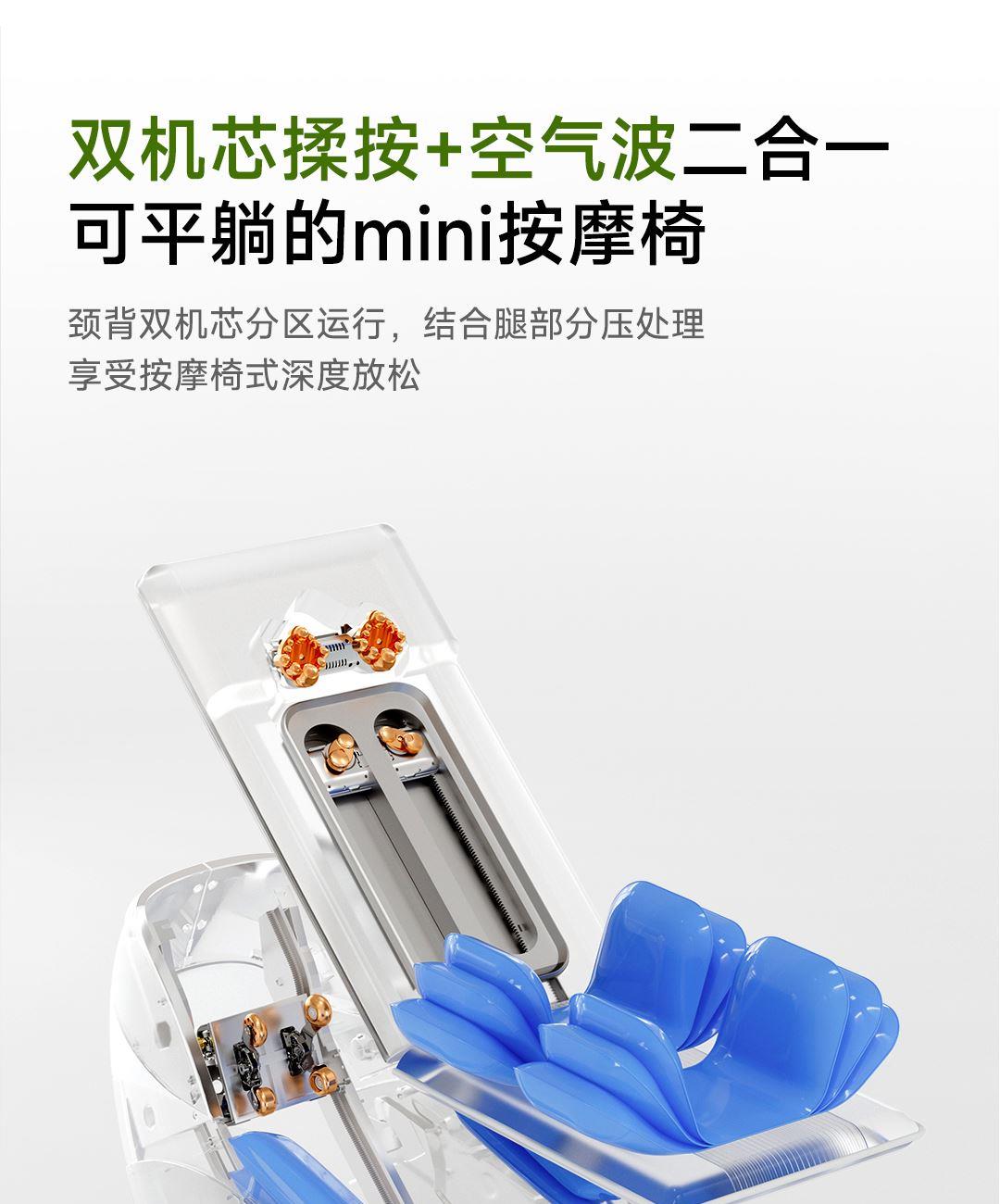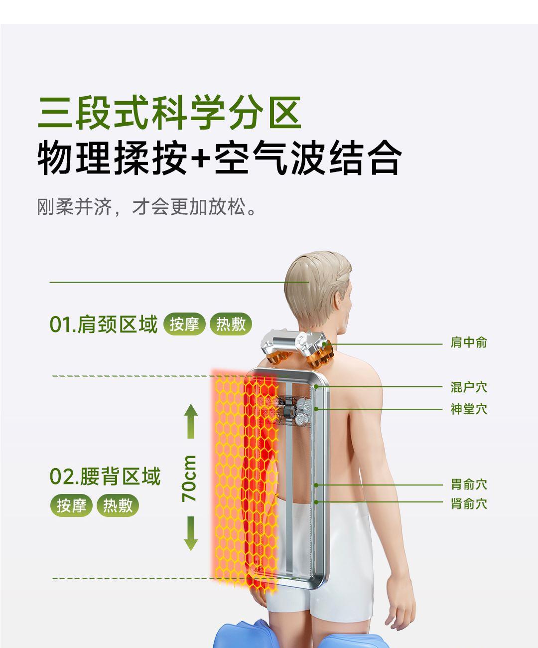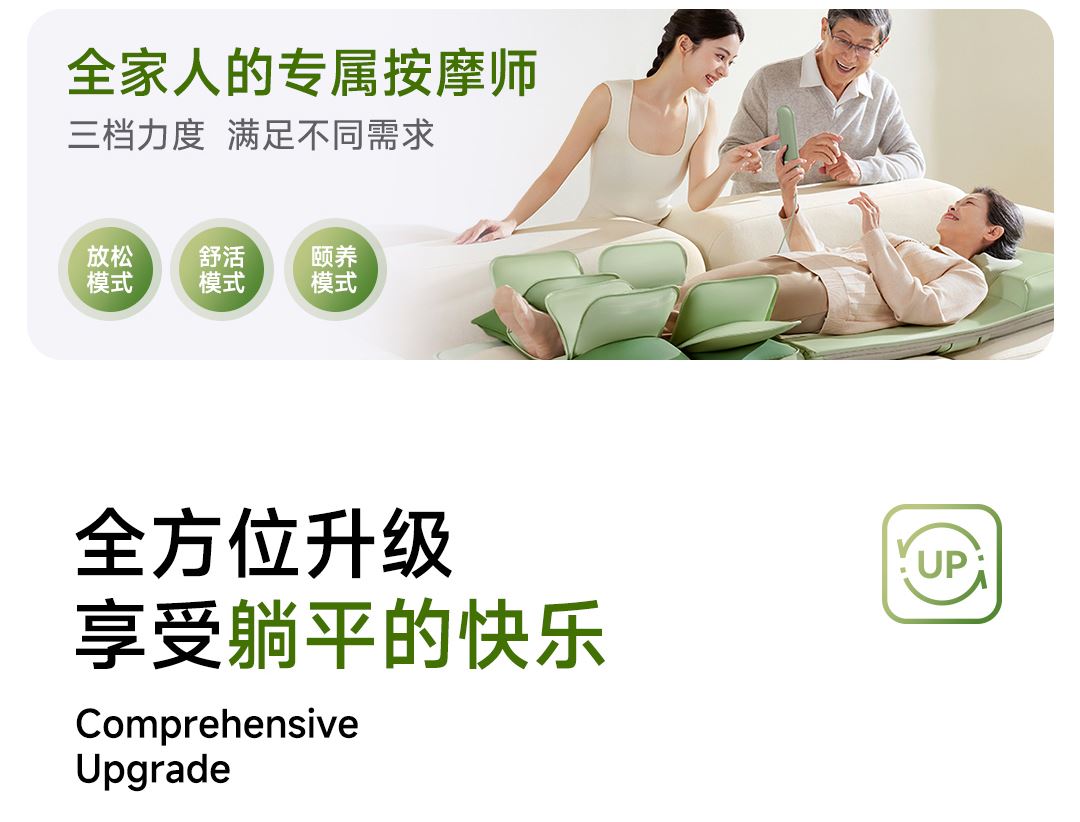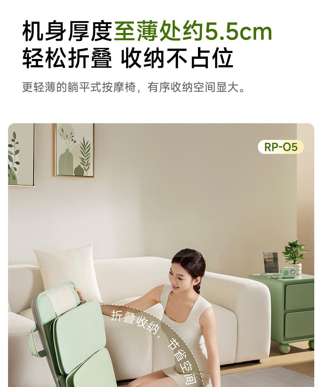 1机多用更超值,宅家按遍肩颈、腰背、大小腿多部位 3段式科学分区,按摩椅同芯技术 躺平式mini按摩椅,180°躺平按摩 身心齐放松 分离式磁吸热敷垫,热敷缓冲二合- 暖腹暖腰背 创新柔性导轨应用,主动贴合腰背 机身厚度仅约5.5cm 折叠收纳不占地,拒绝笨重 走到哪按到哪 全家人的专属按摩师,三档力度模式,满足不同需求
