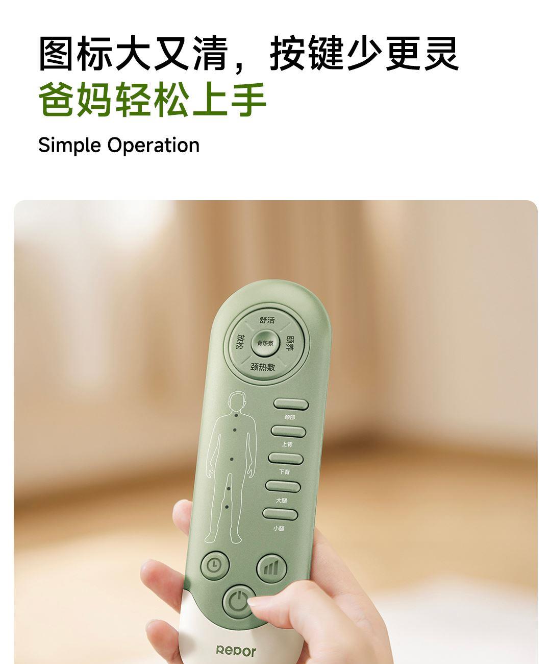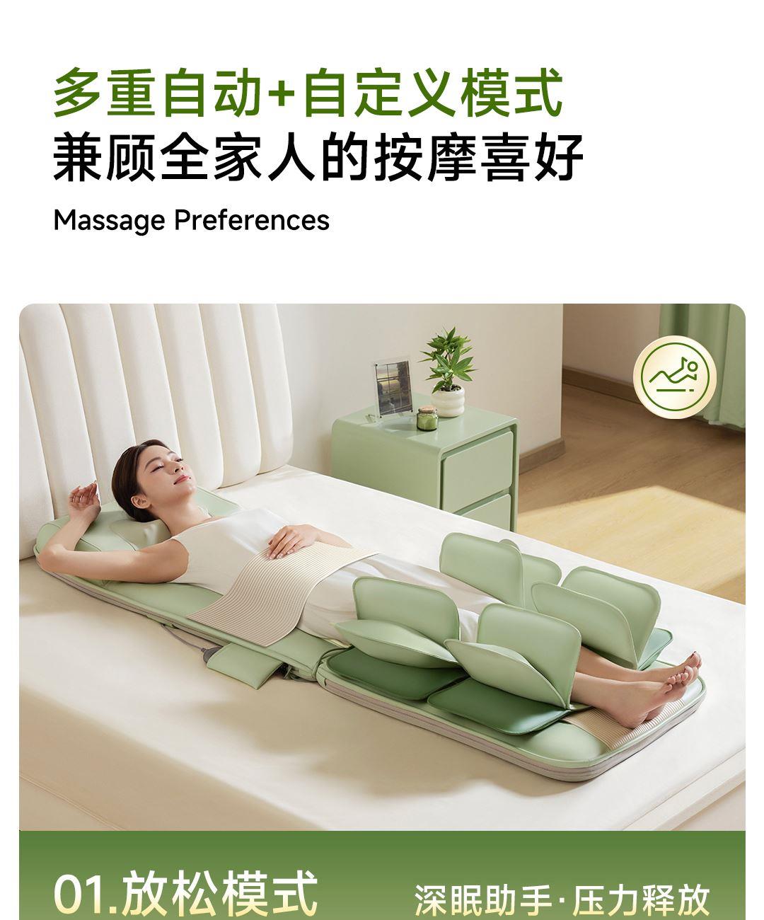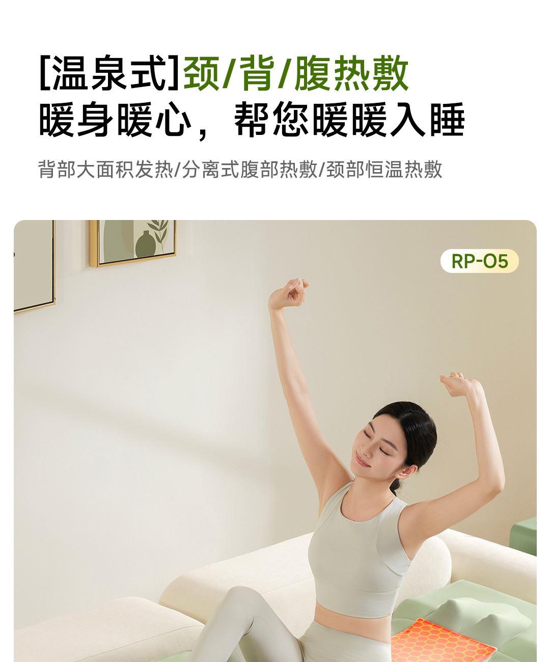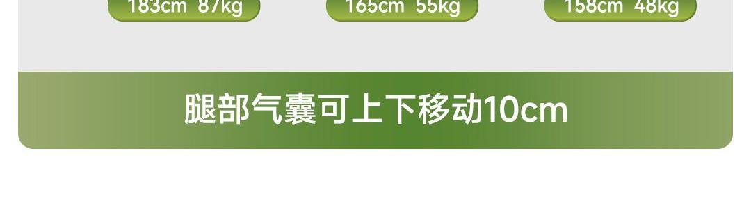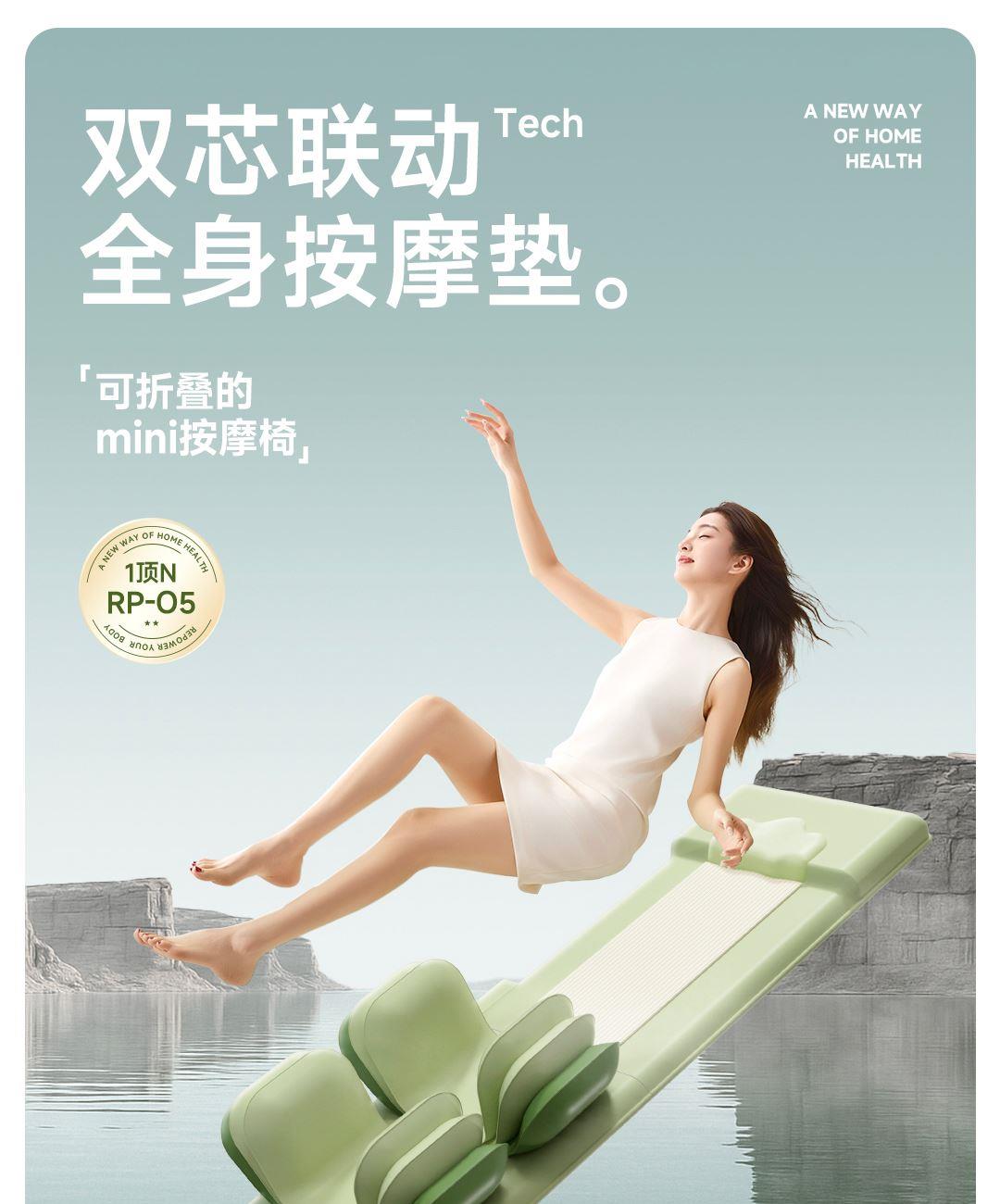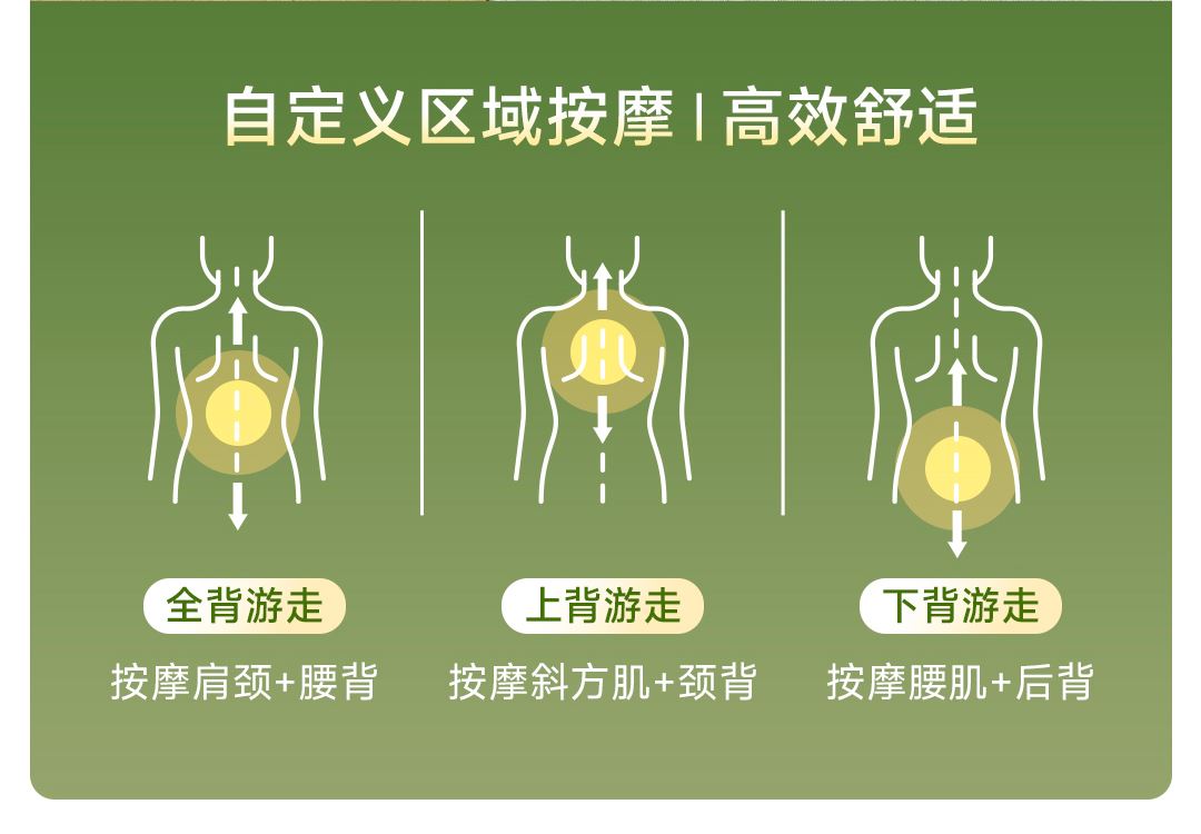 1机多用更超值,宅家按遍肩颈、腰背、大小腿多部位 3段式科学分区,按摩椅同芯技术 躺平式mini按摩椅,180°躺平按摩 身心齐放松 分离式磁吸热敷垫,热敷缓冲二合- 暖腹暖腰背 创新柔性导轨应用,主动贴合腰背 机身厚度仅约5.5cm 折叠收纳不占地,拒绝笨重 走到哪按到哪 全家人的专属按摩师,三档力度模式,满足不同需求
