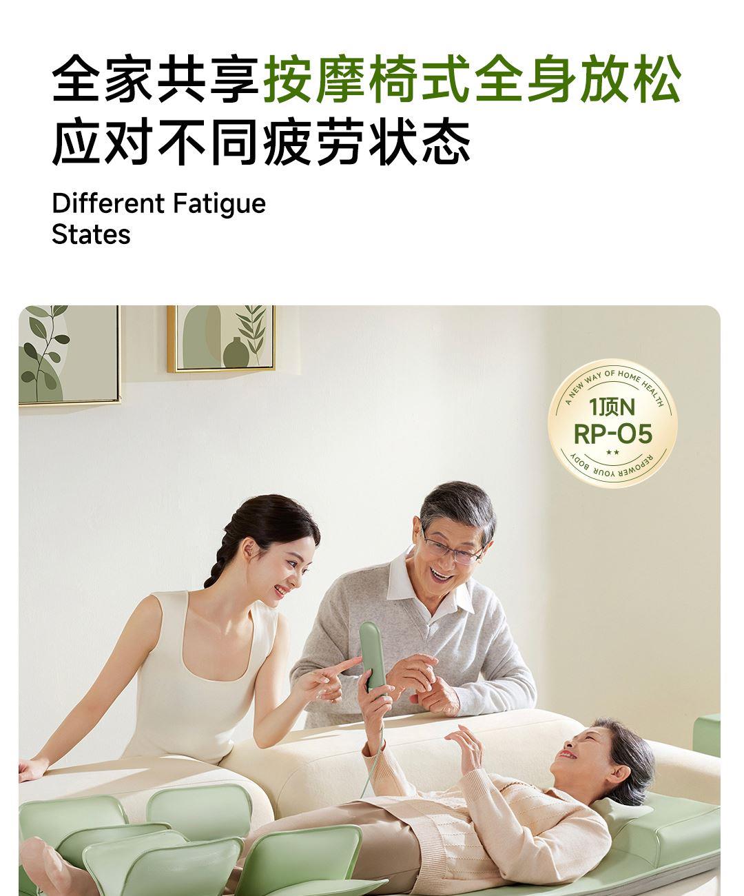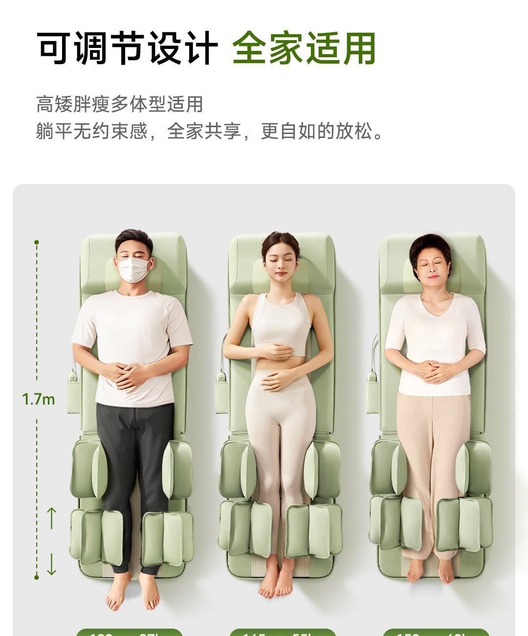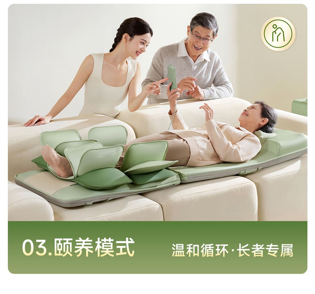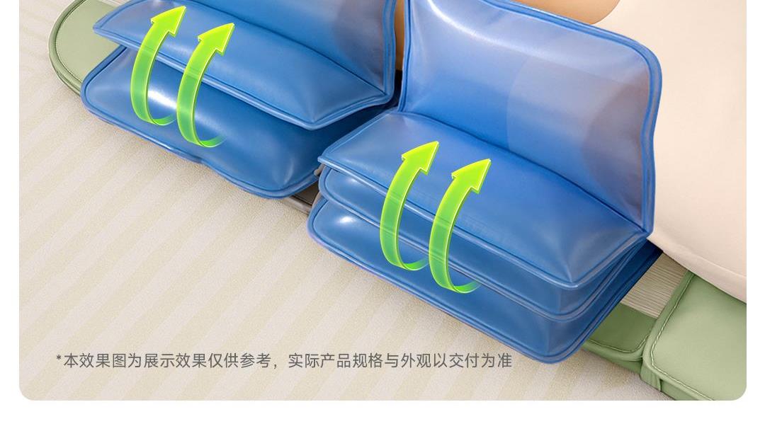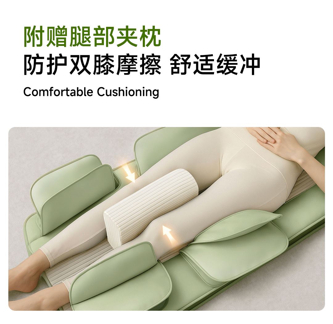 1机多用更超值,宅家按遍肩颈、腰背、大小腿多部位 3段式科学分区,按摩椅同芯技术 躺平式mini按摩椅,180°躺平按摩 身心齐放松 分离式磁吸热敷垫,热敷缓冲二合- 暖腹暖腰背 创新柔性导轨应用,主动贴合腰背 机身厚度仅约5.5cm 折叠收纳不占地,拒绝笨重 走到哪按到哪 全家人的专属按摩师,三档力度模式,满足不同需求