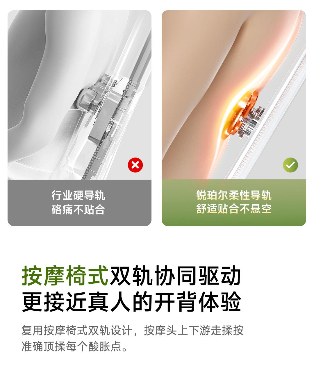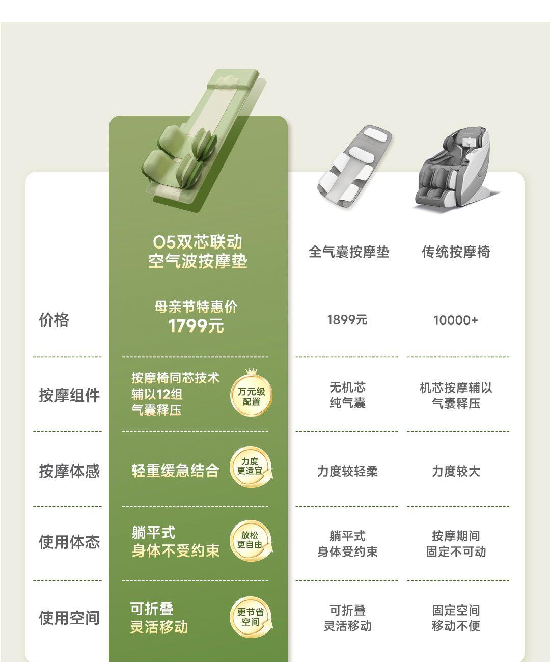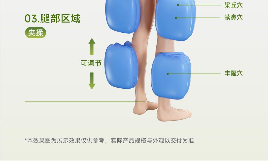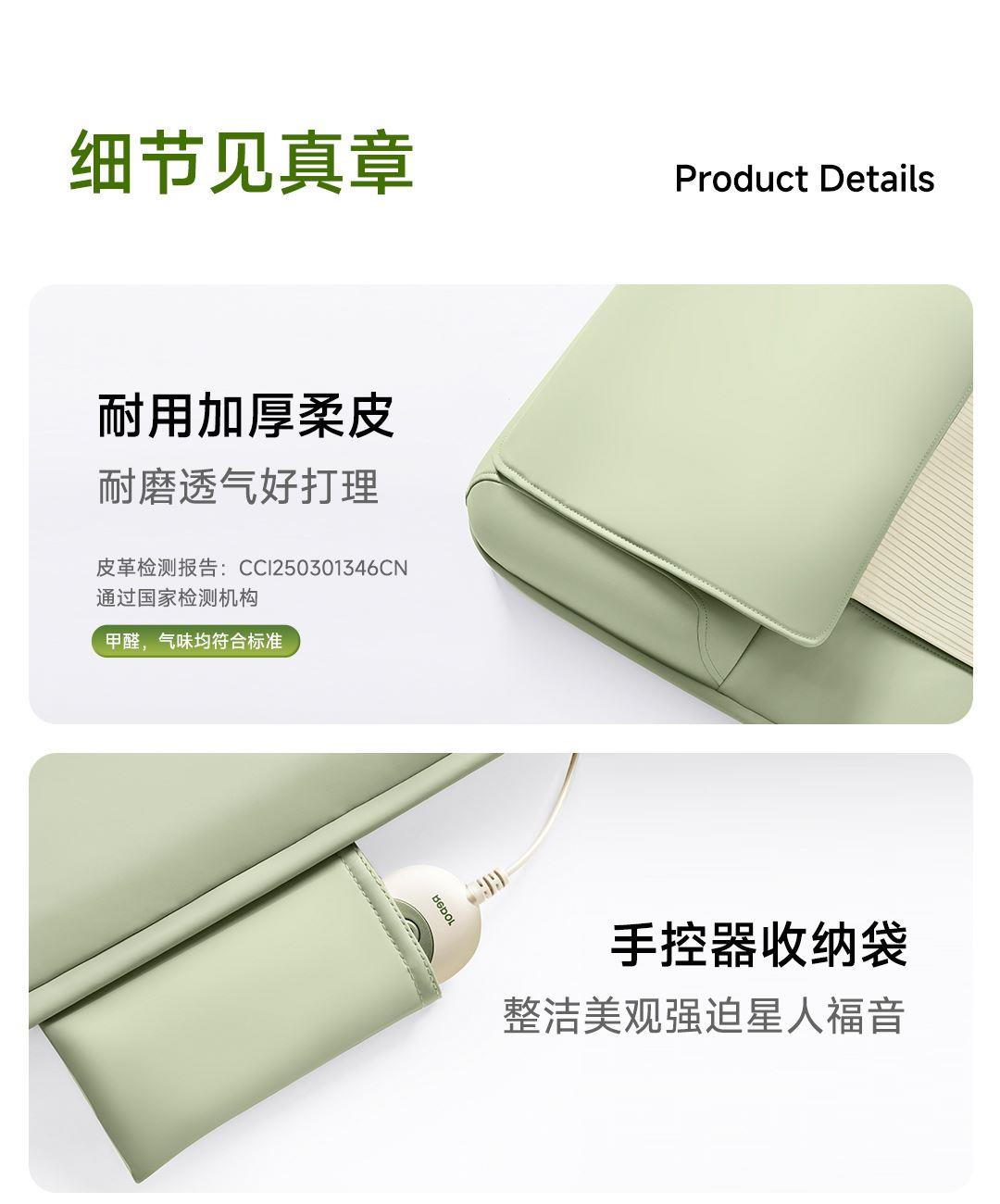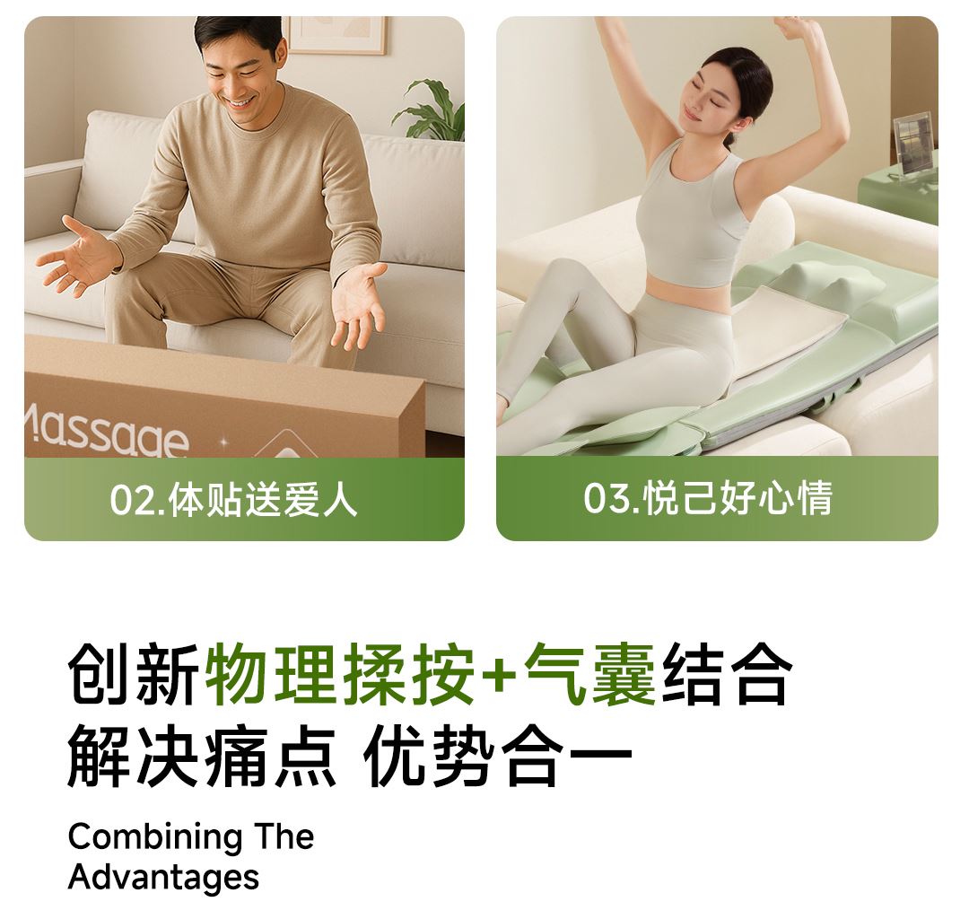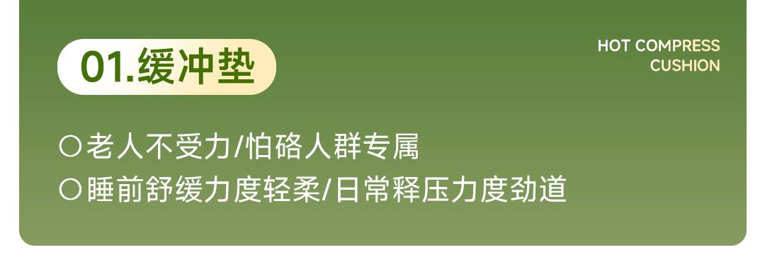 1机多用更超值,宅家按遍肩颈、腰背、大小腿多部位 3段式科学分区,按摩椅同芯技术 躺平式mini按摩椅,180°躺平按摩 身心齐放松 分离式磁吸热敷垫,热敷缓冲二合- 暖腹暖腰背 创新柔性导轨应用,主动贴合腰背 机身厚度仅约5.5cm 折叠收纳不占地,拒绝笨重 走到哪按到哪 全家人的专属按摩师,三档力度模式,满足不同需求