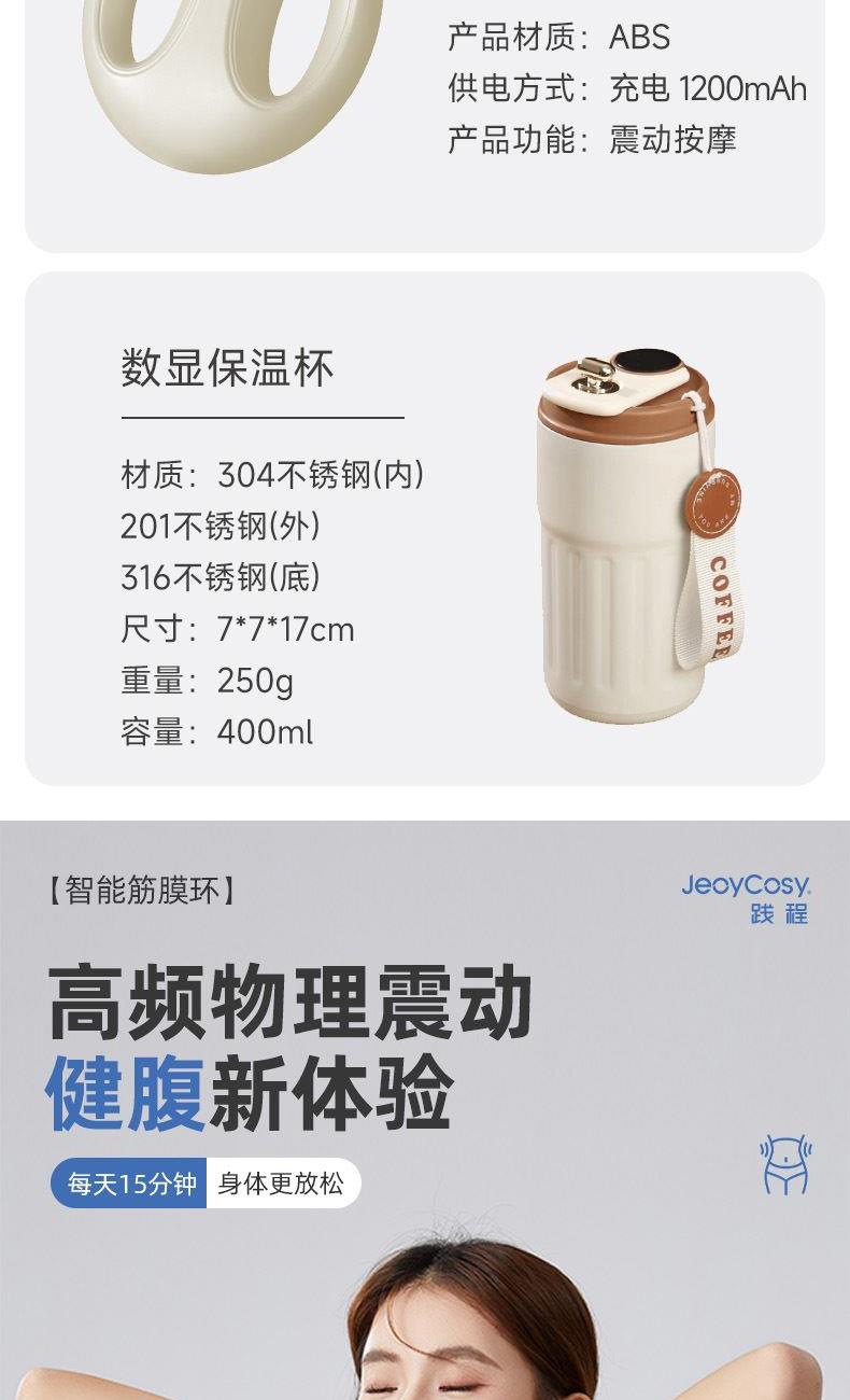 组盒配置:筋膜环*1 数显保温杯*1 彩盒尺寸:30*30*10cm 标准箱尺寸:61*53.5*32cm 条形码:6952679802031 筋膜环: 额定电压:DC 5V 额定功率:10W 产品功能:震动按摩 产品材质:ABS 供电方式:TYPE-C充电 1200mAh 数显保温杯 材质:304不锈钢(内) 201不锈钢(外) 316不锈钢(底) 尺寸:7*7*17cm 重量:250g 容量:400ml