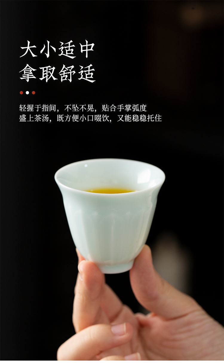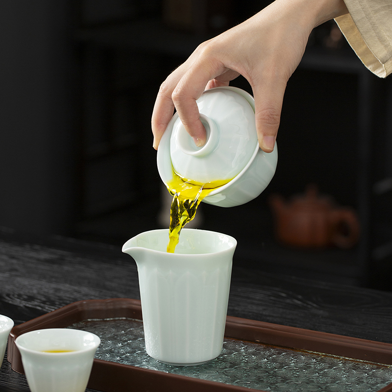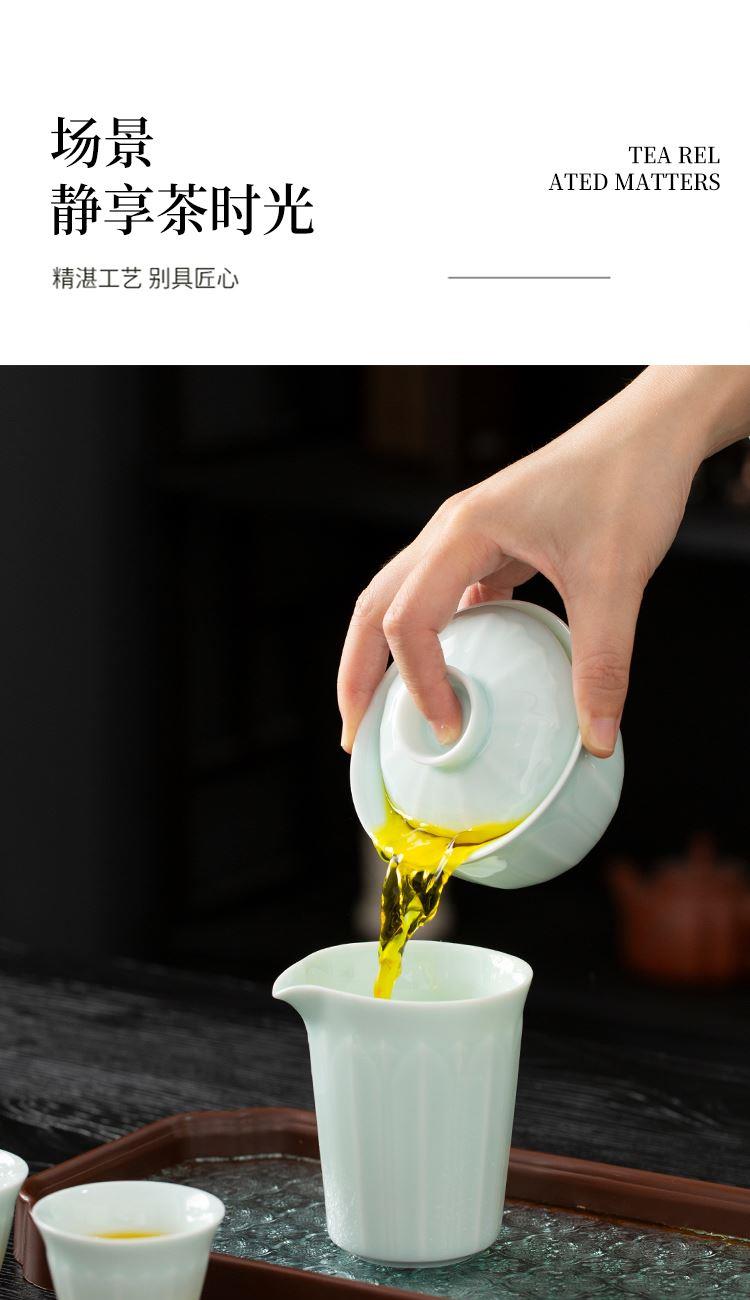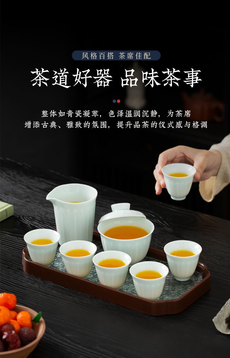 配置:盖碗款:两才盖碗*1 品茗杯*6 茶海*1 玻璃茶盘*1 皮包*1 材质:影青瓷 礼盒尺寸:34.2cm*13.2cm*19.5cm 产品尺寸:品茗杯 60ml 盖碗 200ml 壶 250ml 茶海 230ml