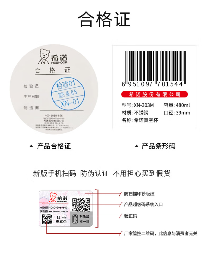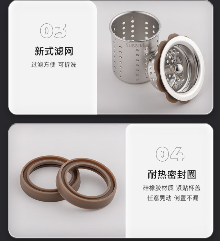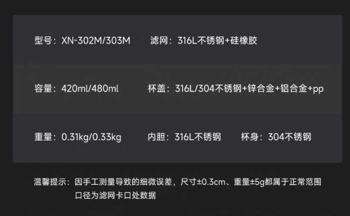 XN-302M:39(杯口直径) x66(直径) x183(高度) 内胆材料 SUS316L不锈钢 滤网材料 SUS316L、食品级硅胶 密封圈 食品级硅胶 条形码 XN-302M:6951097701537 保温效能 XN-302M:6小时≥55℃ 颜色 XN-302M:本色、烟灰、浅香槟、紫罗兰