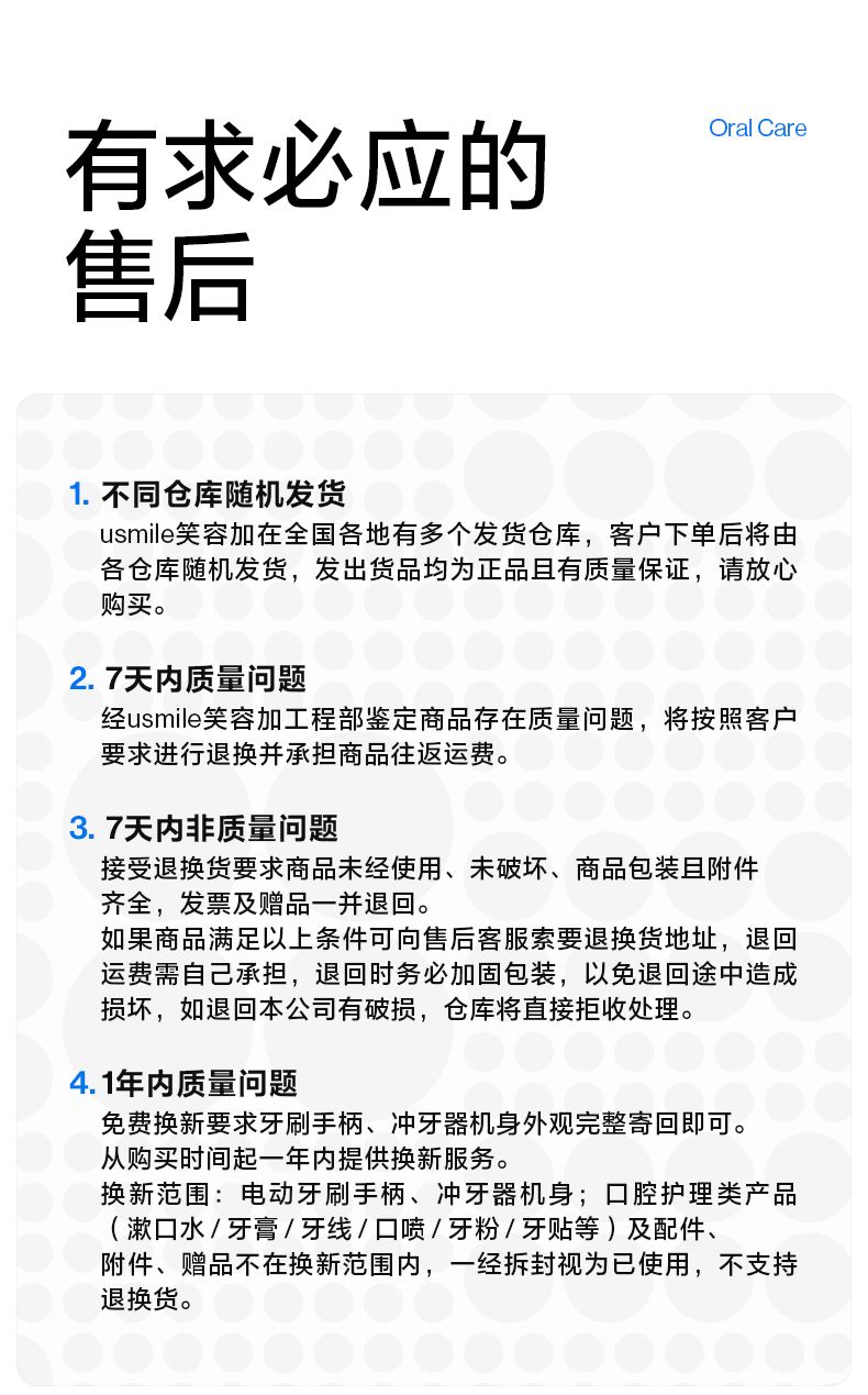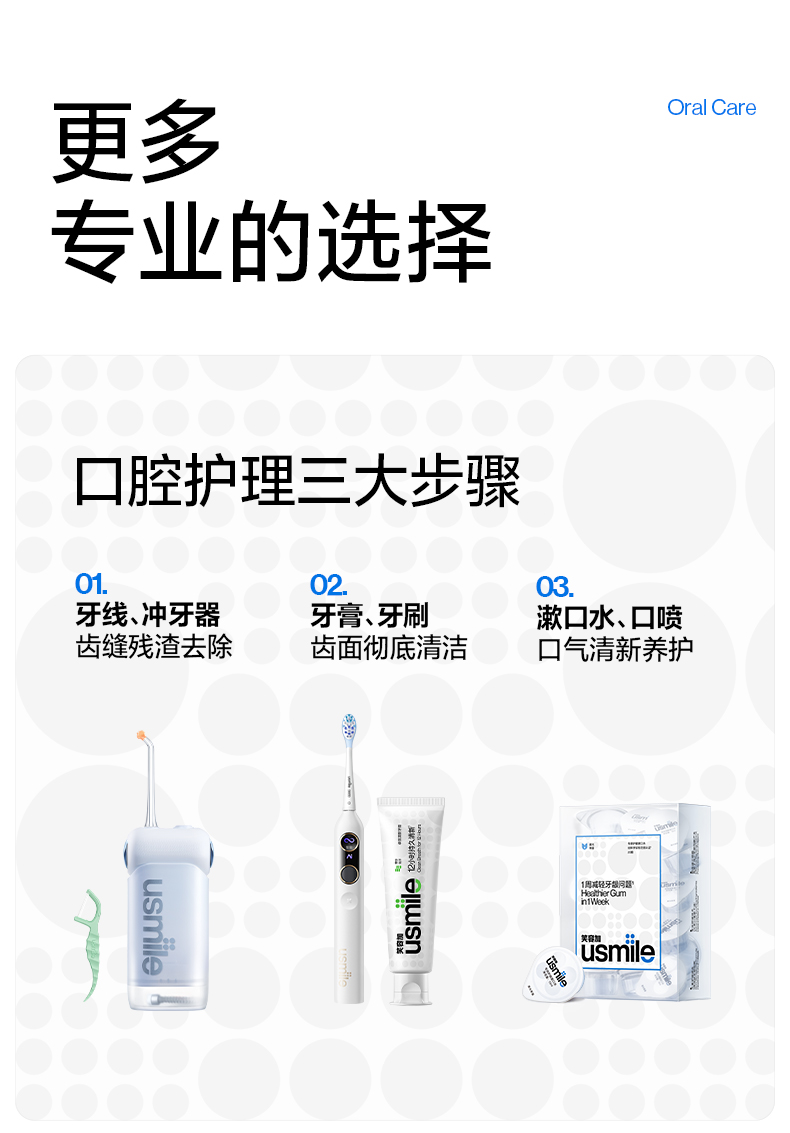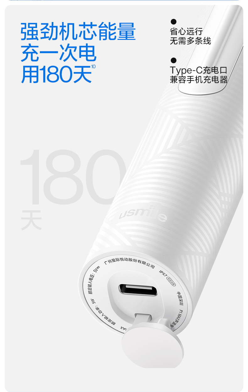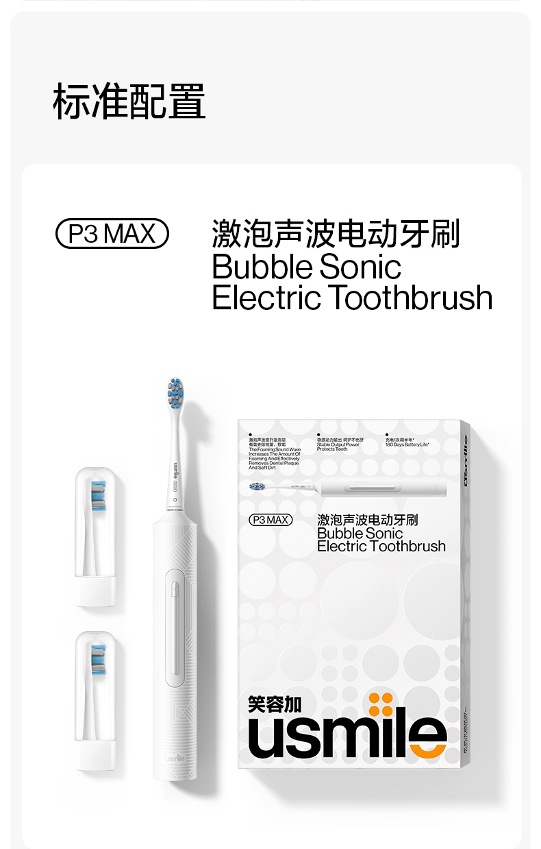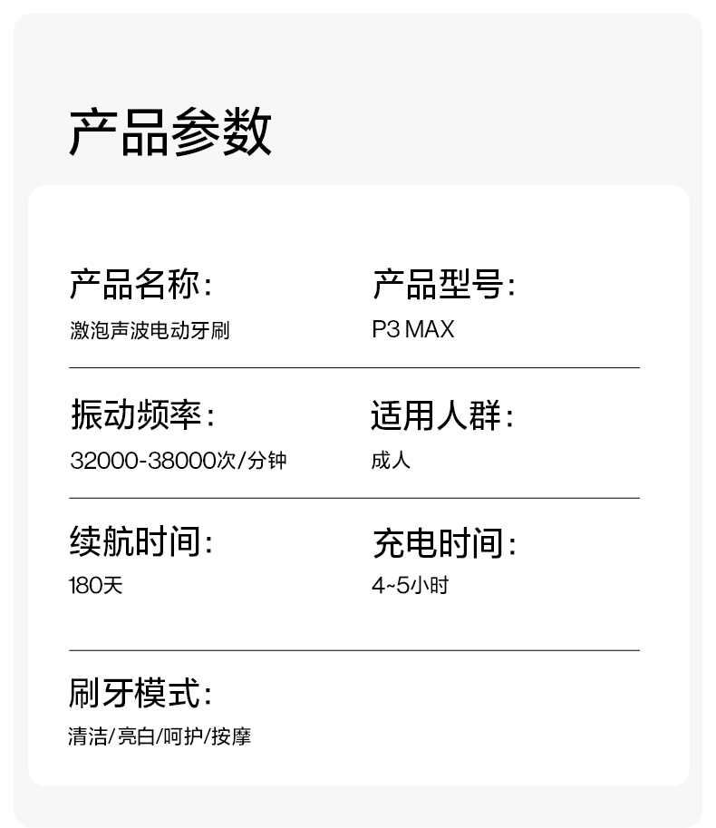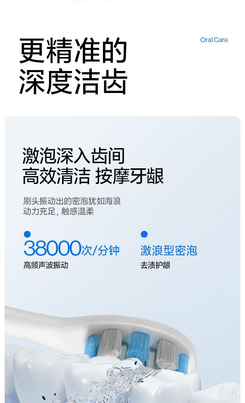 三大核心卖点: 激泡技术,洁净力强大稳定,深层洁净 专业刷头,高磨圆率刷丝,洁净不伤牙 4种模式,缓解多种口腔问题 其它卖点: 续航半年,一年充电两次 30秒换区提醒,4分钟关机 3D镭射科技,有质感不滑手 IPX7级防水 深层防水更安心