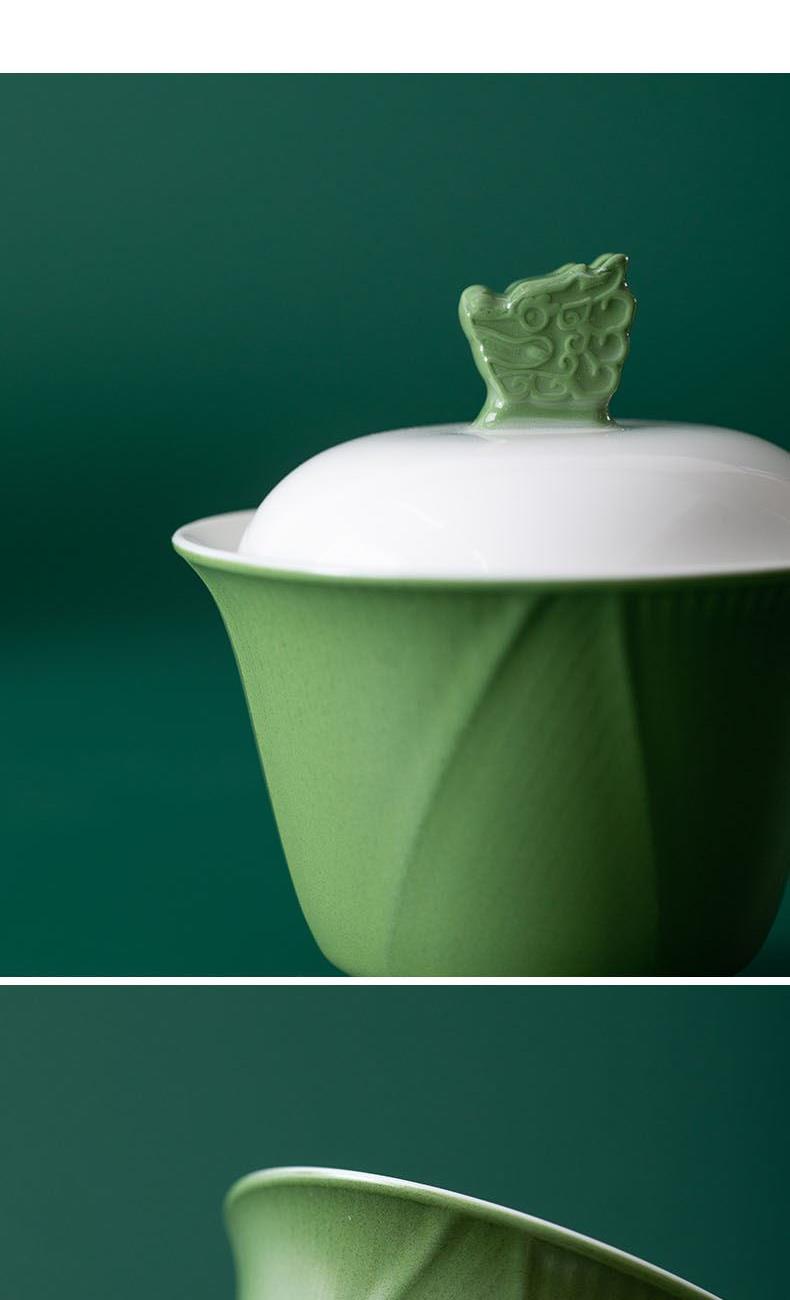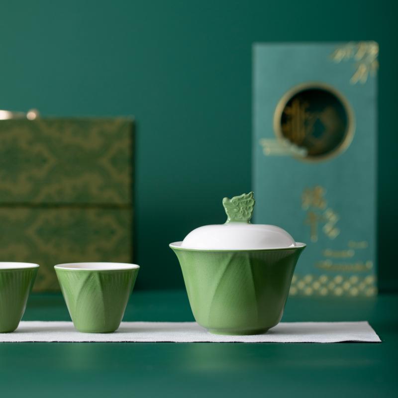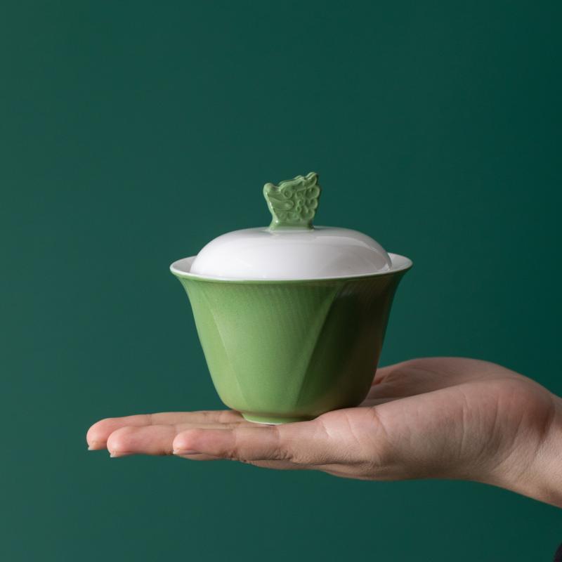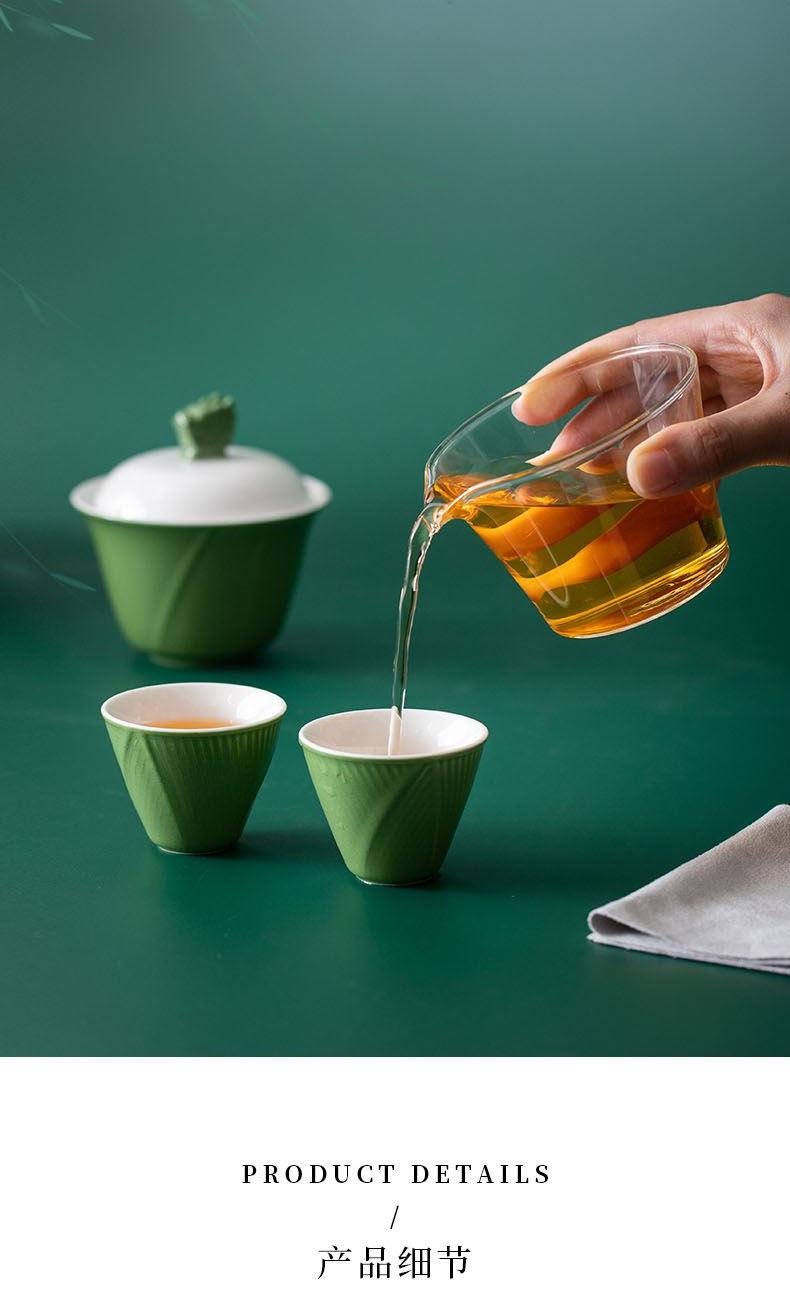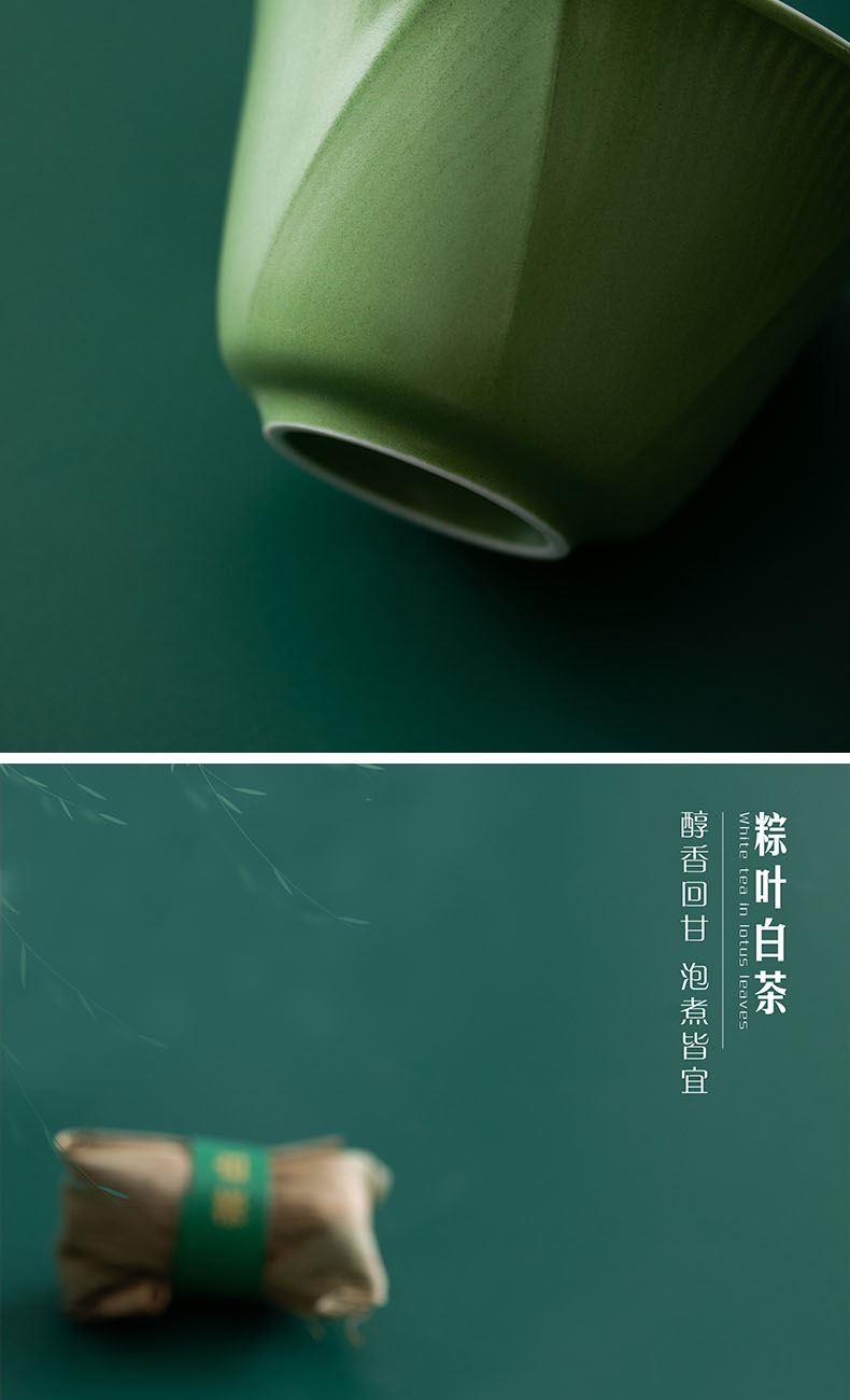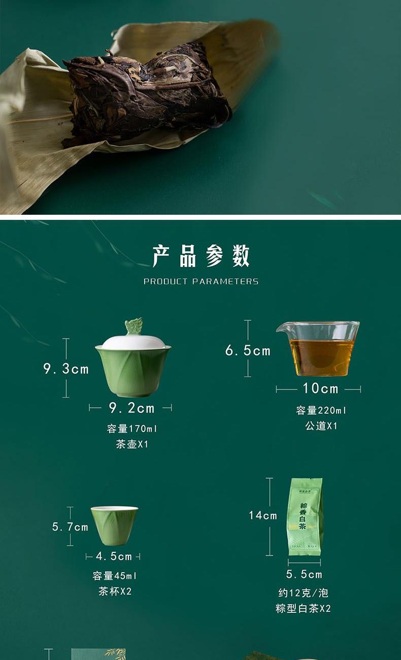 1.立体龙头盖碗搭配粽叶纹茶杯,辅以玻璃茶器,尽显东方茶道雅致意境。 2.粽叶包裹白茶,冲泡后蜜韵悠长,茶香与粽叶清香层层叠叠,带来味觉与嗅觉的双重享受。 3.哑光墨绿礼盒搭配复古纹样,金属提手质感,精致雅致,格调不凡。 材 质:绿釉白瓷、高硼硅玻璃 容 量:盖碗100ml、茶海170ml、茶杯50ml 包装尺寸:L25 W14 H12.3cm 配 置:盖碗和公杯各一个,茶杯两个,粽叶包老白茶两泡,茶巾一条,贺卡一张,含提手彩盒包装。