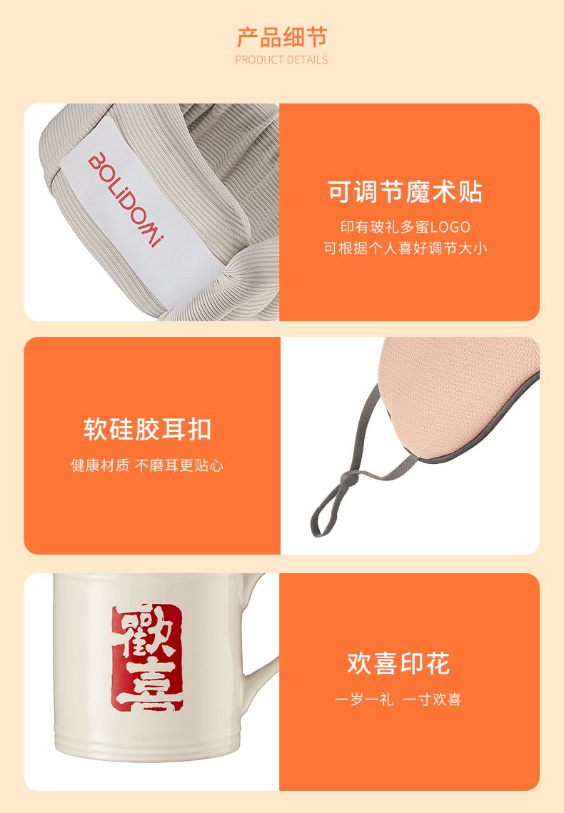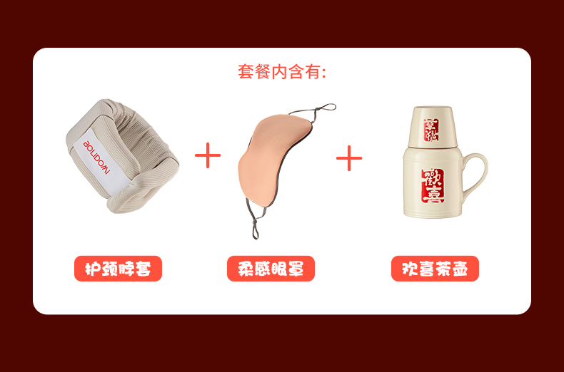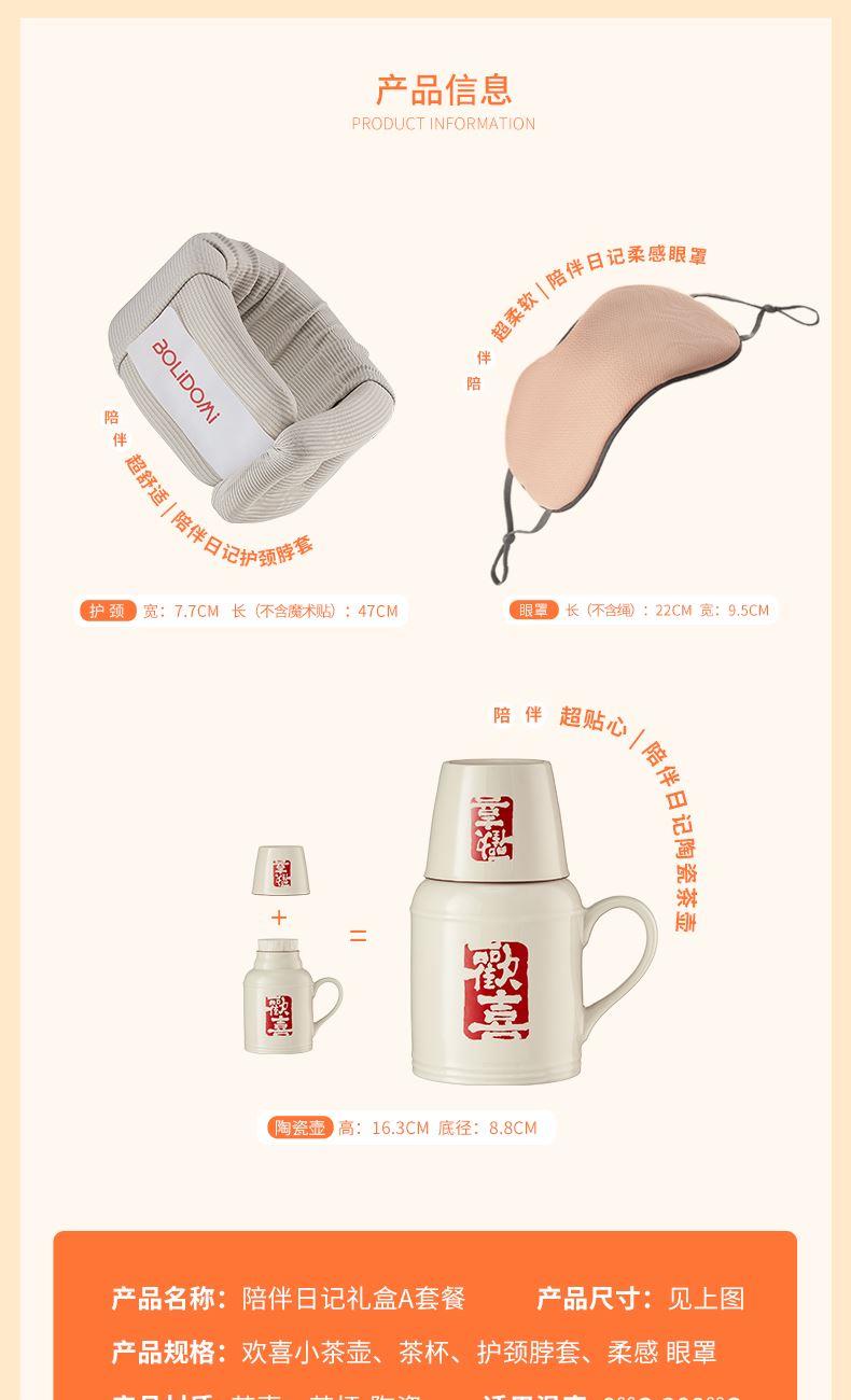 【组合】:欢喜小茶壶500ml、茶杯130ml,护脖颈套,柔感眼罩 【材质】:陶瓷,脖套-聚氨酯、涤纶,眼罩-面料:锦纶88.6%, 氨纶11.4%、里料:聚酯纤维 【彩盒尺寸】:321*105*246mm 【外箱尺寸】:54.7*33.5*51cm 产品卖点:1、复古瓷器小茶壶,1300℃高温烧制+百次冷热测试,骤冷骤热不炸不裂,耐用度碾压普通陶壶。 2、反重力悬浮托颈,颠覆性支撑系统(创新技术为本)「反重力力学结构+360°环绕支撑]悬颈如云卸压70%,医 学验证贴合曲线,高矮颈型无缝贴合,告别卡喉感 3、瞬眠遮光眼罩,温凉双面智能切换,黑洞遮光98%遮光率+鼻翼加密开灯如盲,工位秒深睡。