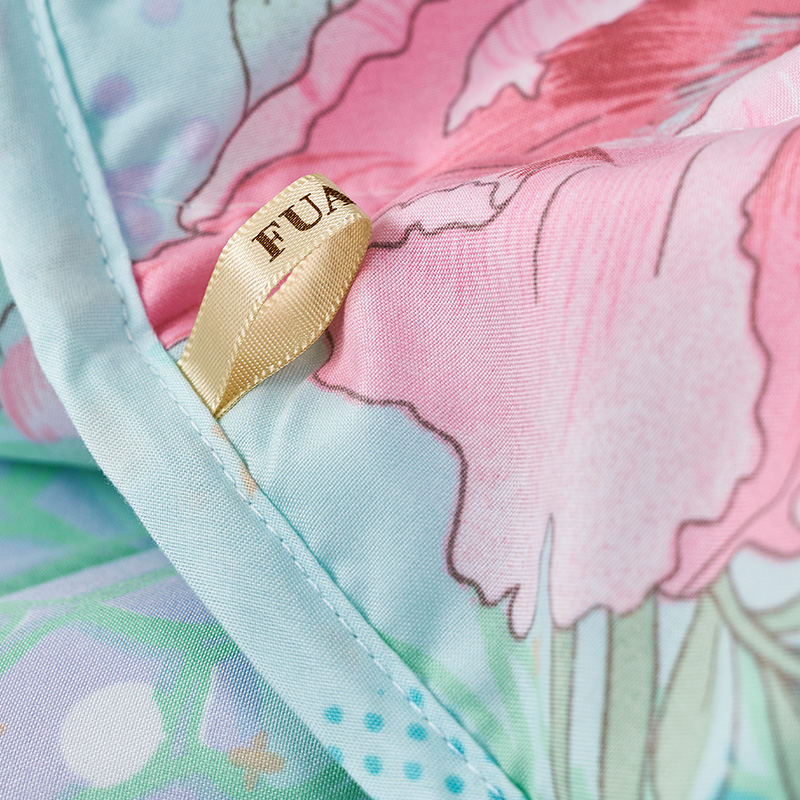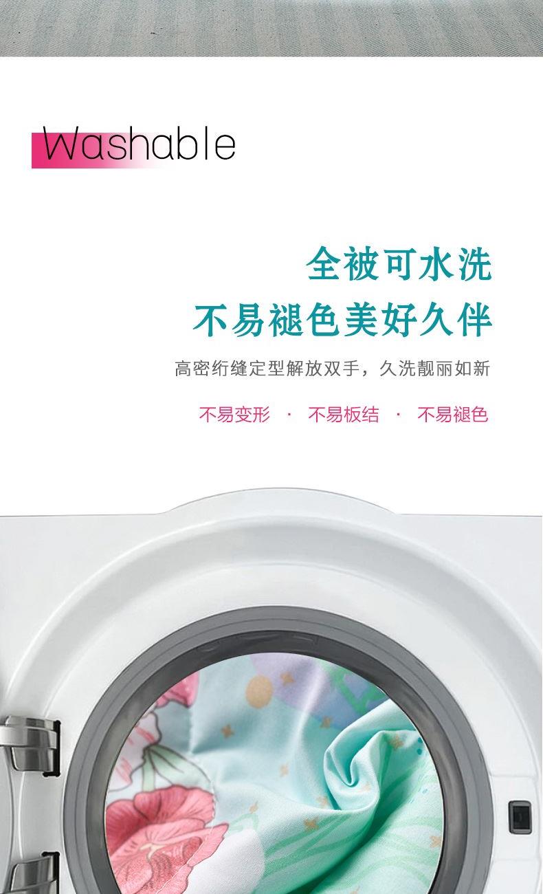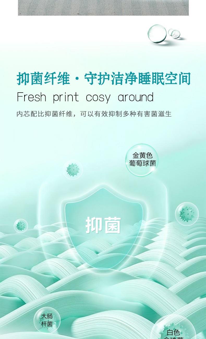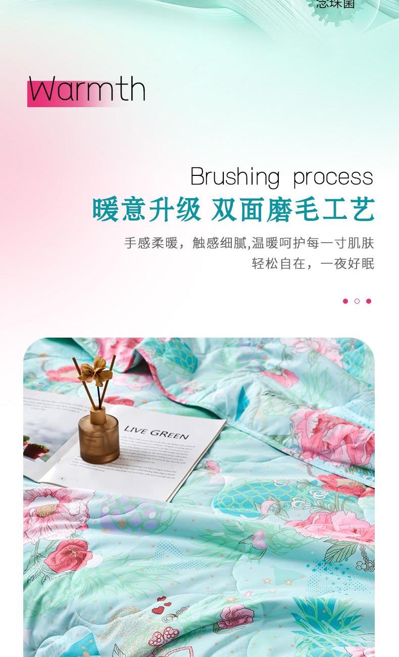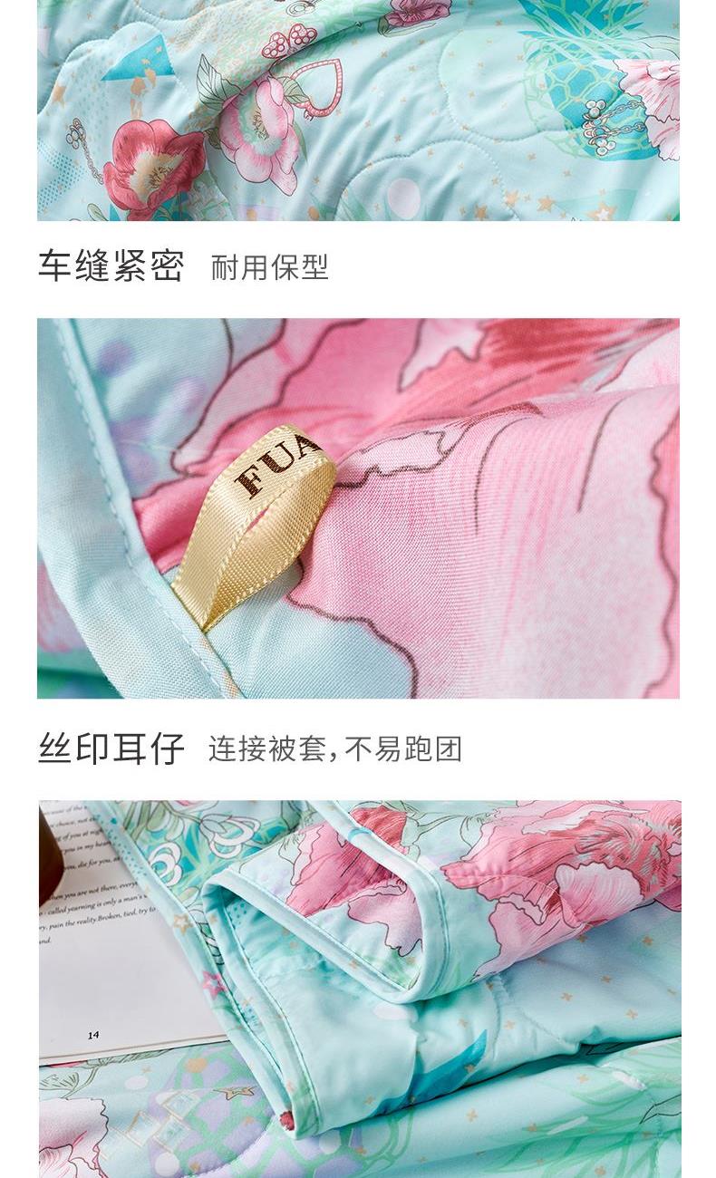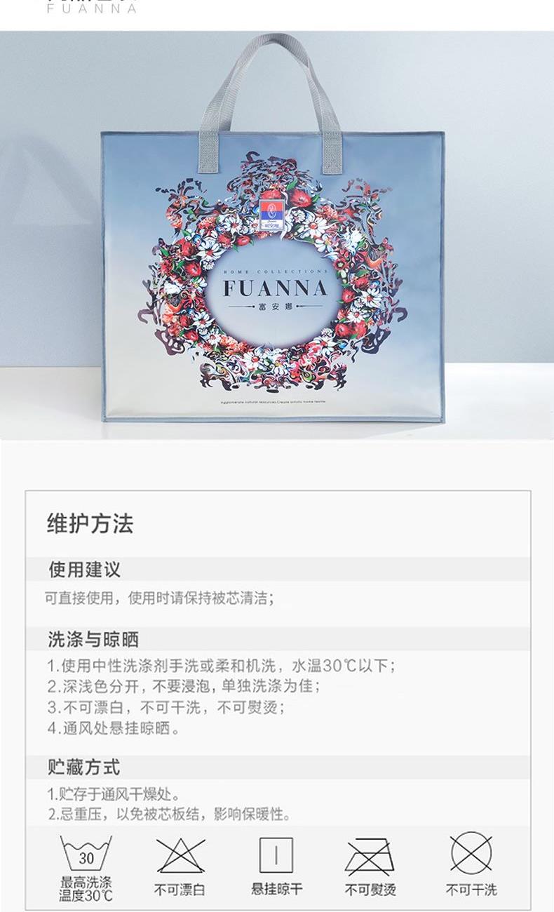 【产品面料】全涤磨毛印花 【产品填充】聚脂纤维(含七孔纤维) 【产品规格】203*229cm(370g) 【产品重量】毛重约1.6kg 净重约1.3kg 【包装尺寸】富安娜复合袋 48*5*40cm 1.优选全涤磨毛面料面料表面有一层细密的绒毛,触感柔暖细腻,透气更贴身