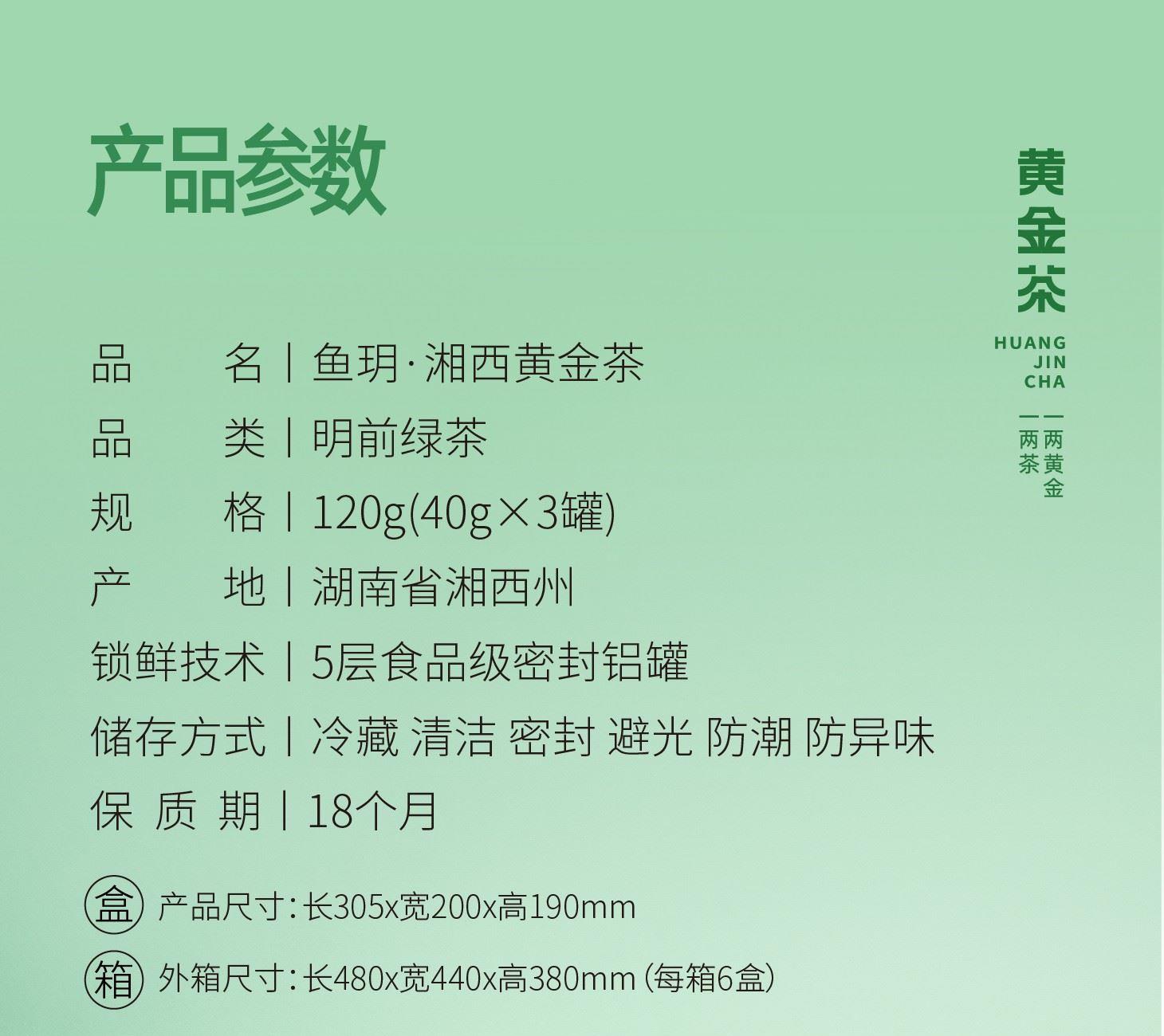 产品规格:黄金茶明前绿茶40gx3罐 包装材质:精装礼盒+复合密封铝罐 保质期:18个月 储存条件:避光、通风、阴凉干燥