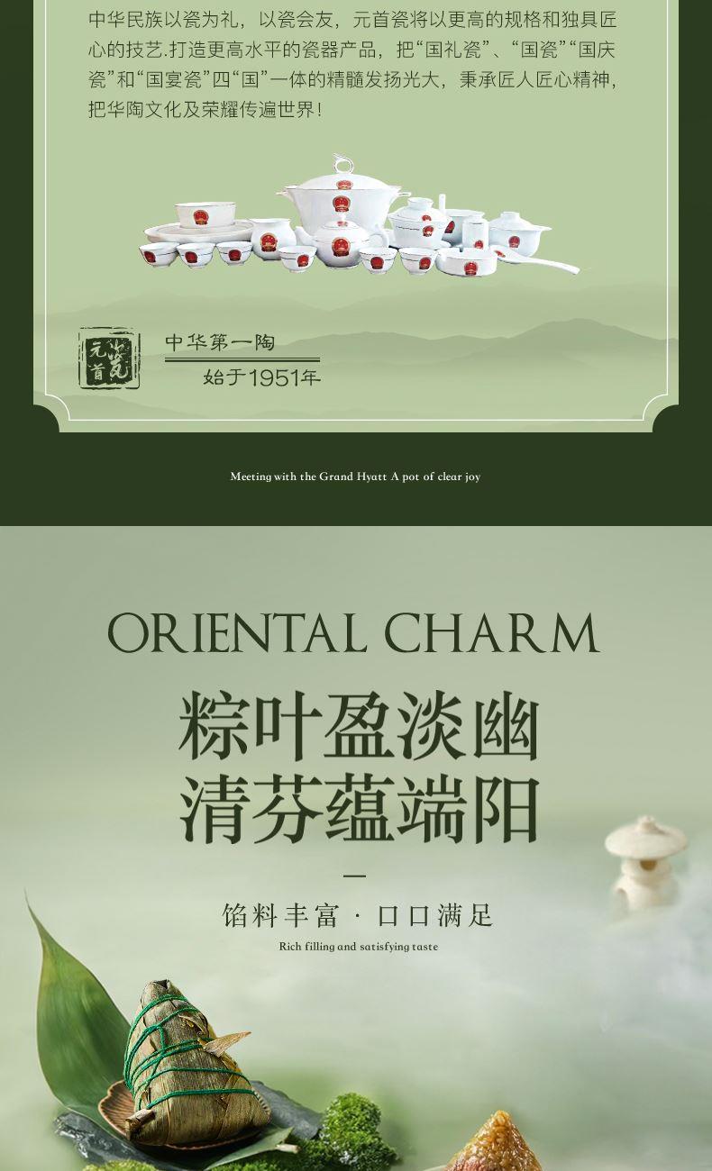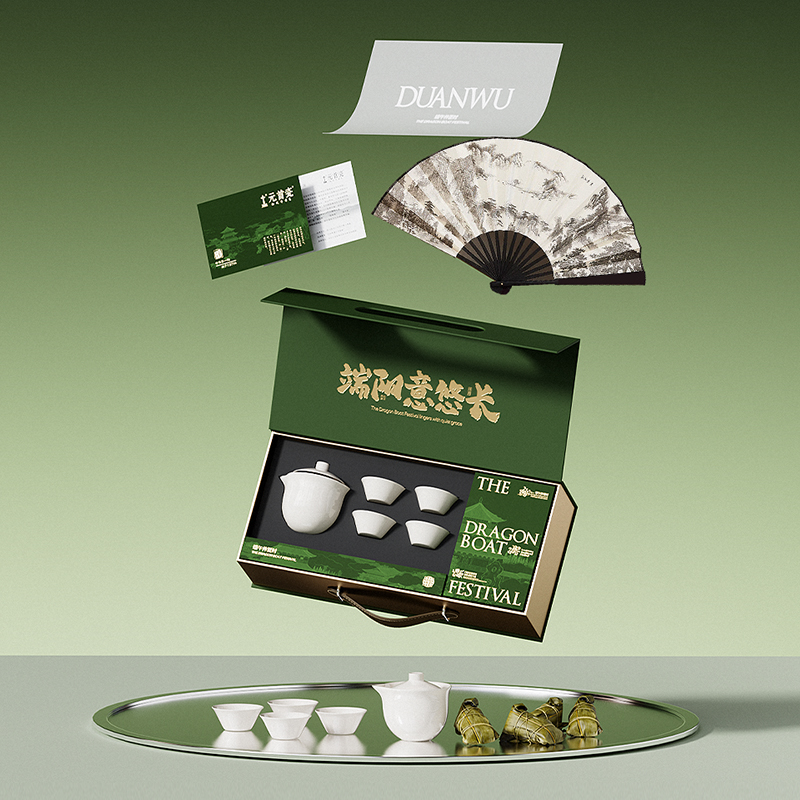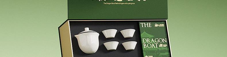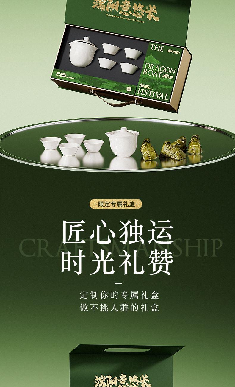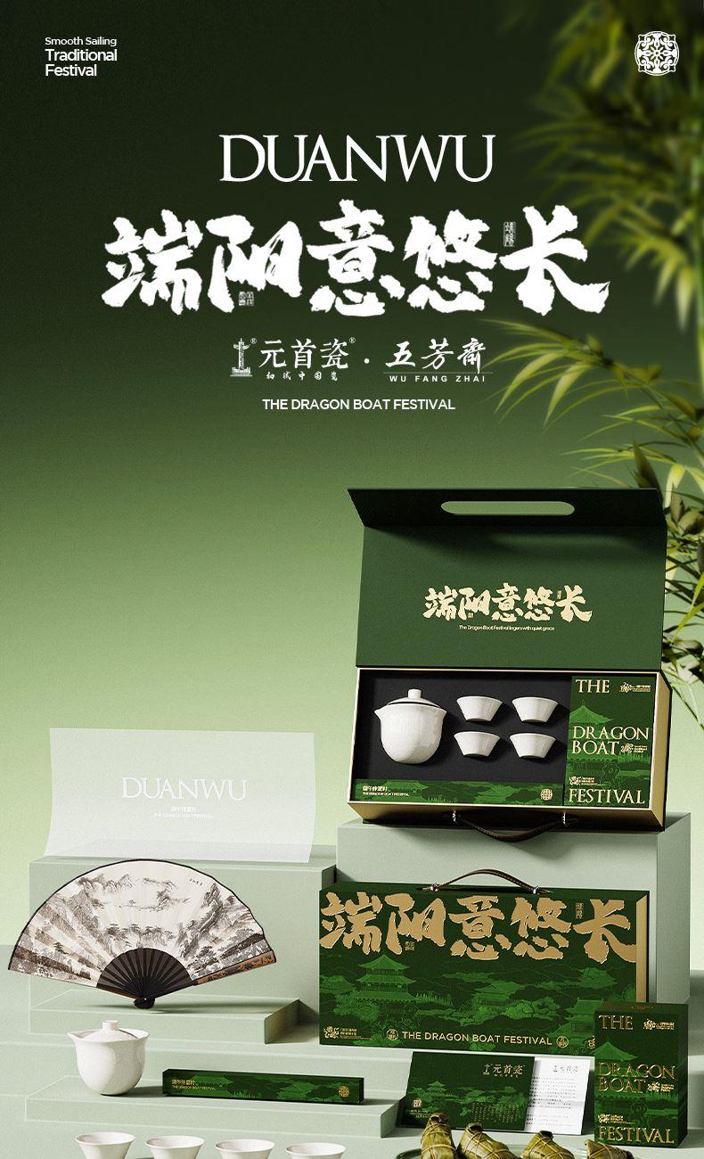 产品型号:DW-2 产品配置:陶瓷茶具套装*1、五芳斋粽子*4、绢布折扇*1、贺卡*1 包装寸:415*205*115mm 1、口味多样化:香糯蜜枣粽、猪肉粽 2、陶瓷快客杯套装:集泡茶、过滤、品茶于一体,适合办公室、旅行或日常使用,方便快捷,让喝茶变的轻松高效 3、折扇:既可纳凉实用,又可赏玩怡情 3、贺卡:书写赠言,传递心意 4、食、茶、雅、礼"四位一体 ,不止于送粽子,更是一份可品味、可使用、可留存的文化体验