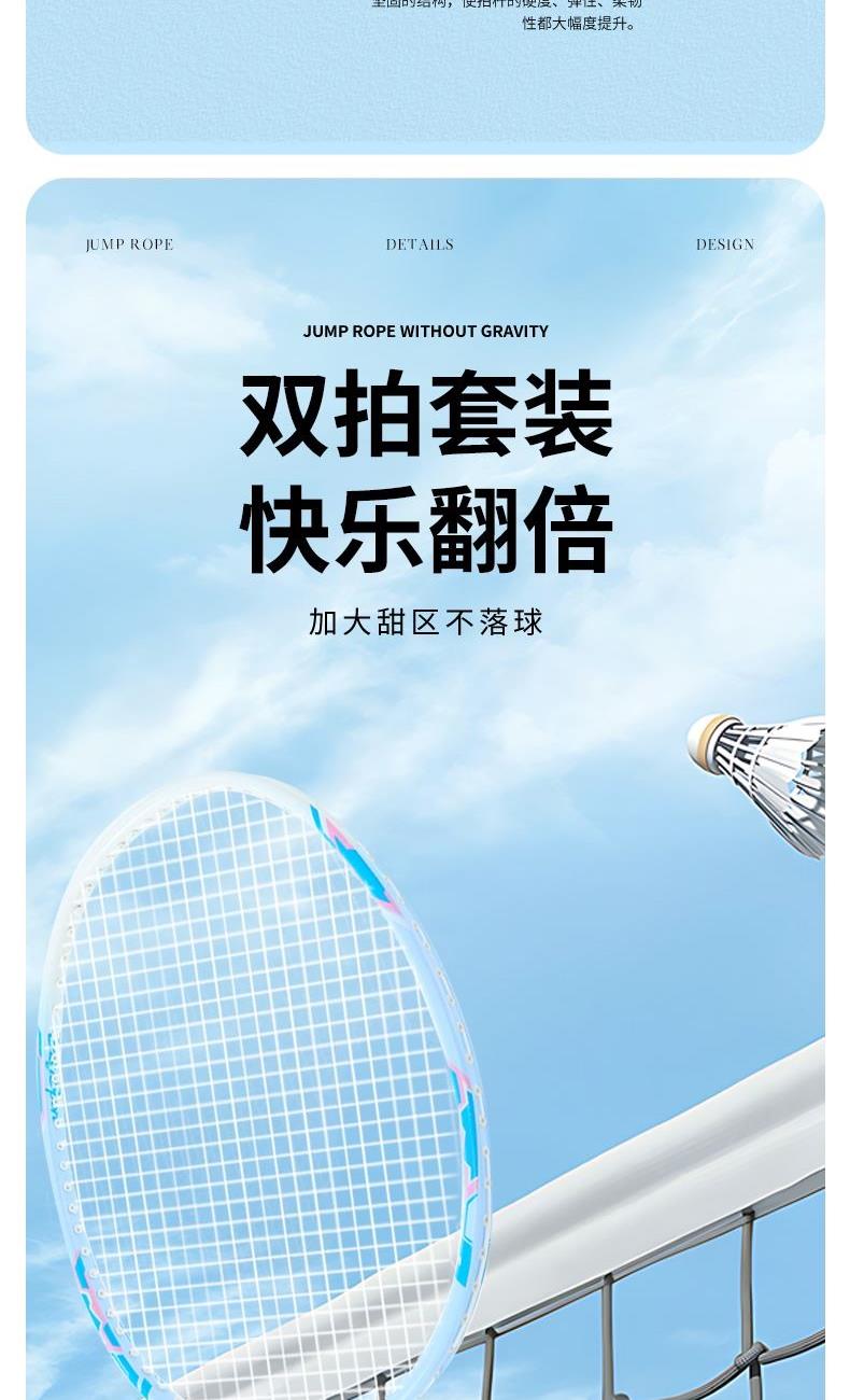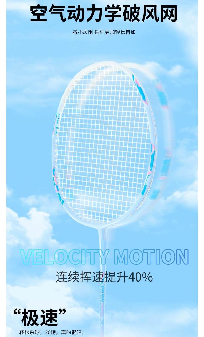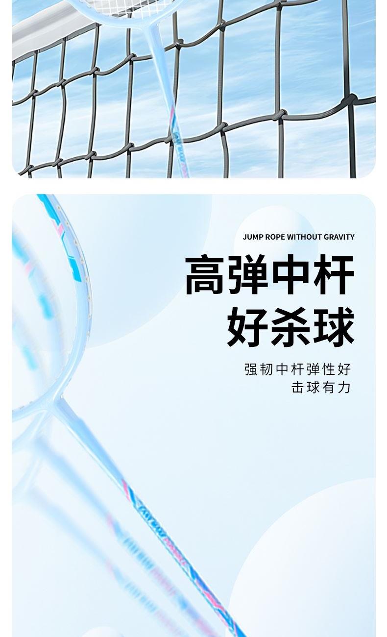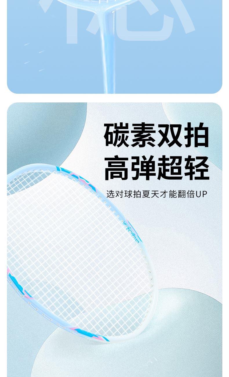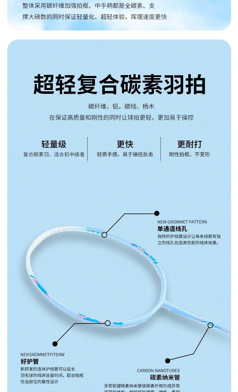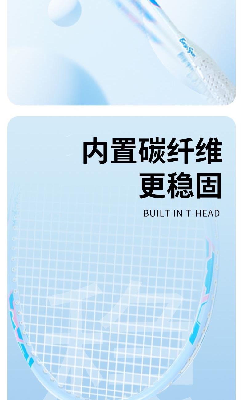 产品介绍: 中杆采用碳纤维材质,韧性强,结合铝框设计,让球拍既轻盈又坚韧,节省体力的同时又极富攻击性,是准专业级选手的优选装备 拍杆一体成型,流线性的设计,能有效减少阻力,力量传输更柔和 手柄处设减震模块,更好地保护手腕 产品规格: 马卡龙记忆碳羽毛球拍x2 、双层牛津包x1 重量:0.38KG 材质:碳纤维、铝、 碳线、杨木、PVC