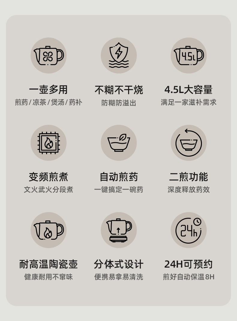 主要材质:PP+陶瓷 电压:220V 功率:600W 容量:3.5L 1、小巧机身,时尚百搭 2、高硼硅玻璃壶体,无惧冷热骤变 3、轻音模式,工作休息不打扰 4、滤网分离式设计,蒸煮两用 5不粘发热盘,告别清洗烦恼 6、分体式杯体设计,清洗方便 7、24小时长效保温,无需看管