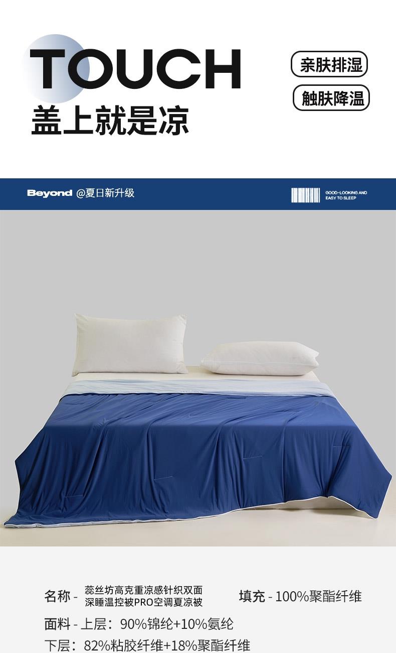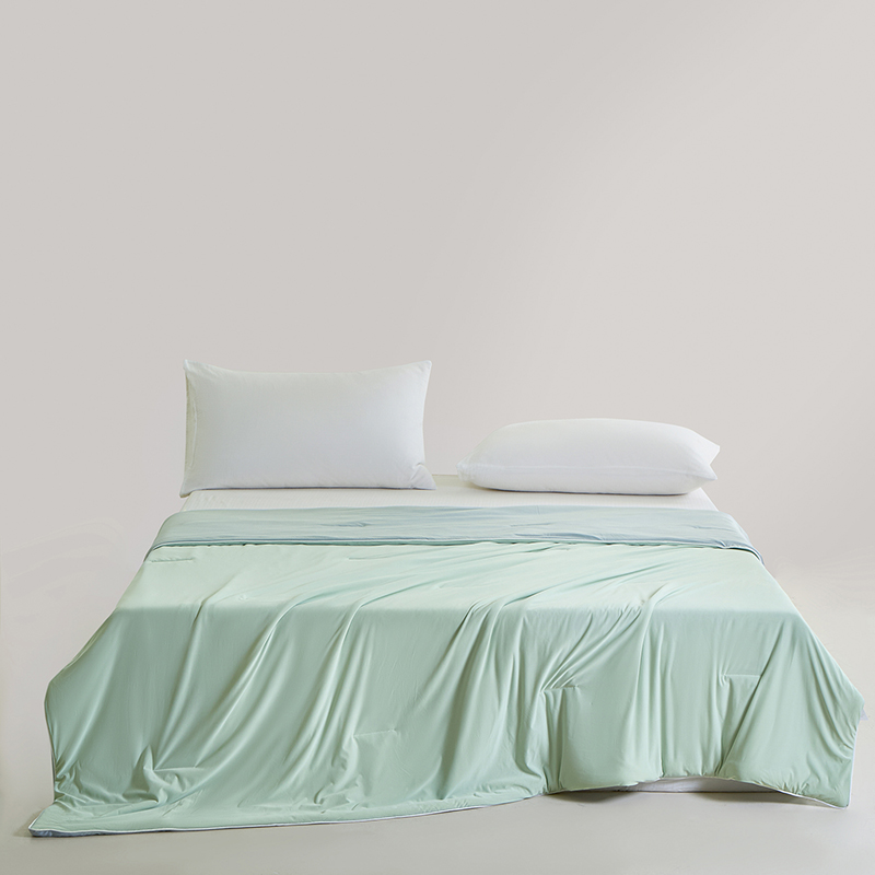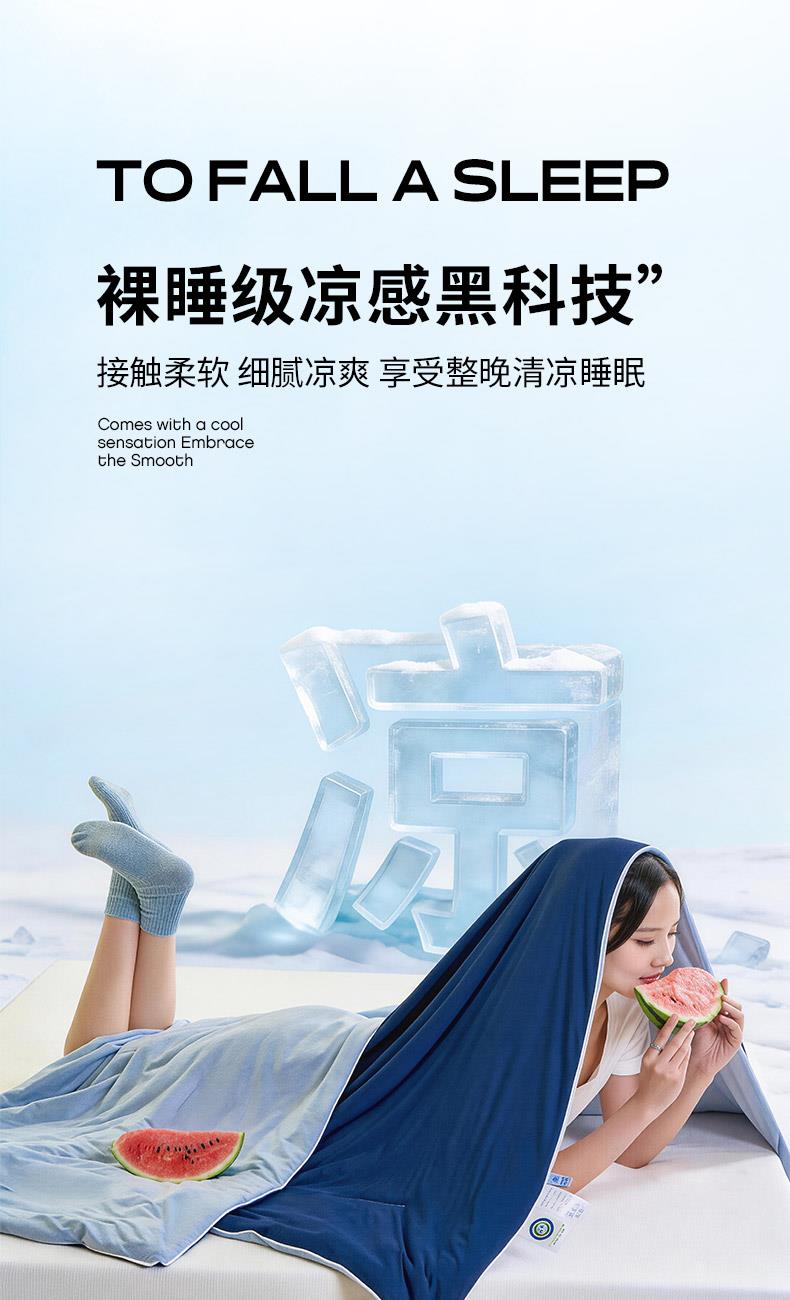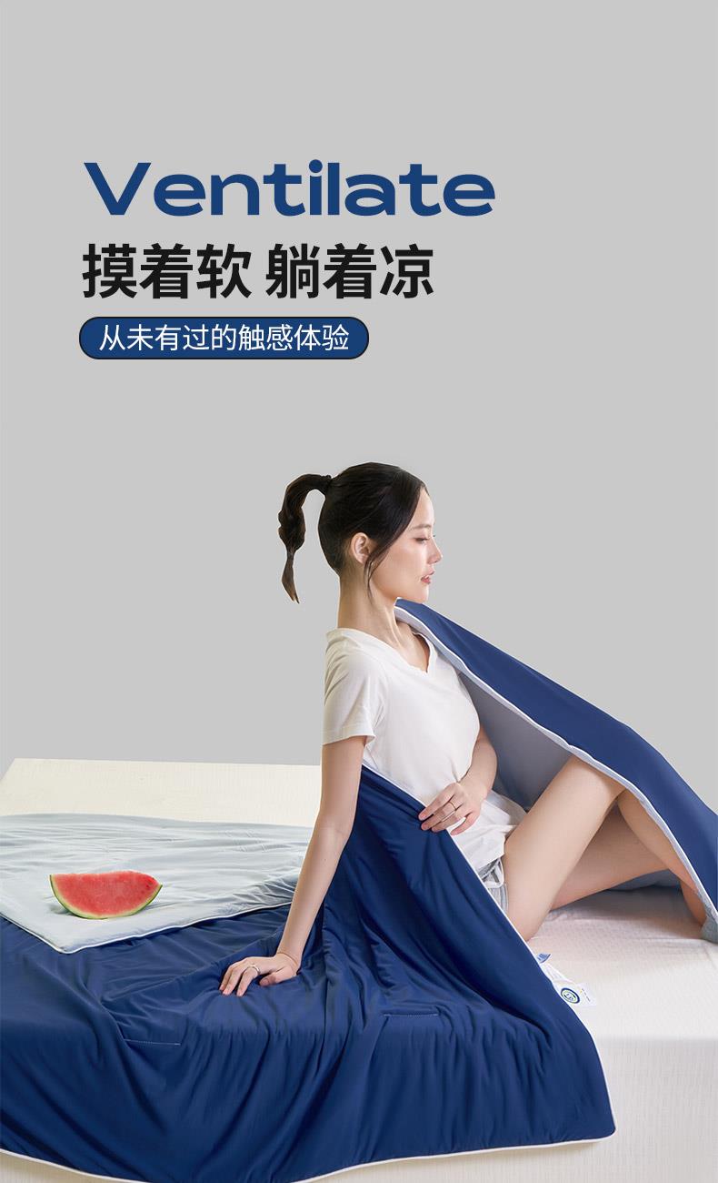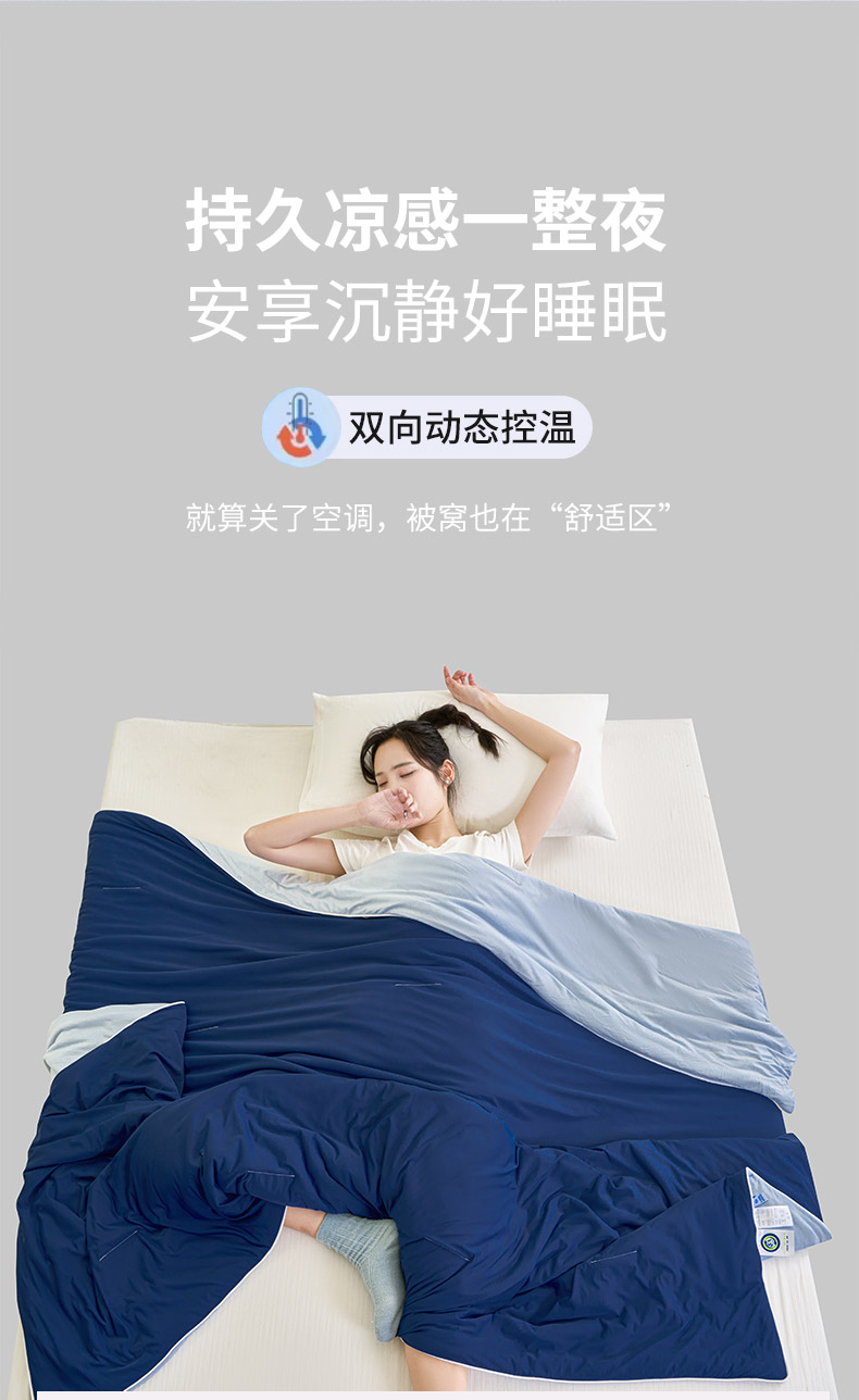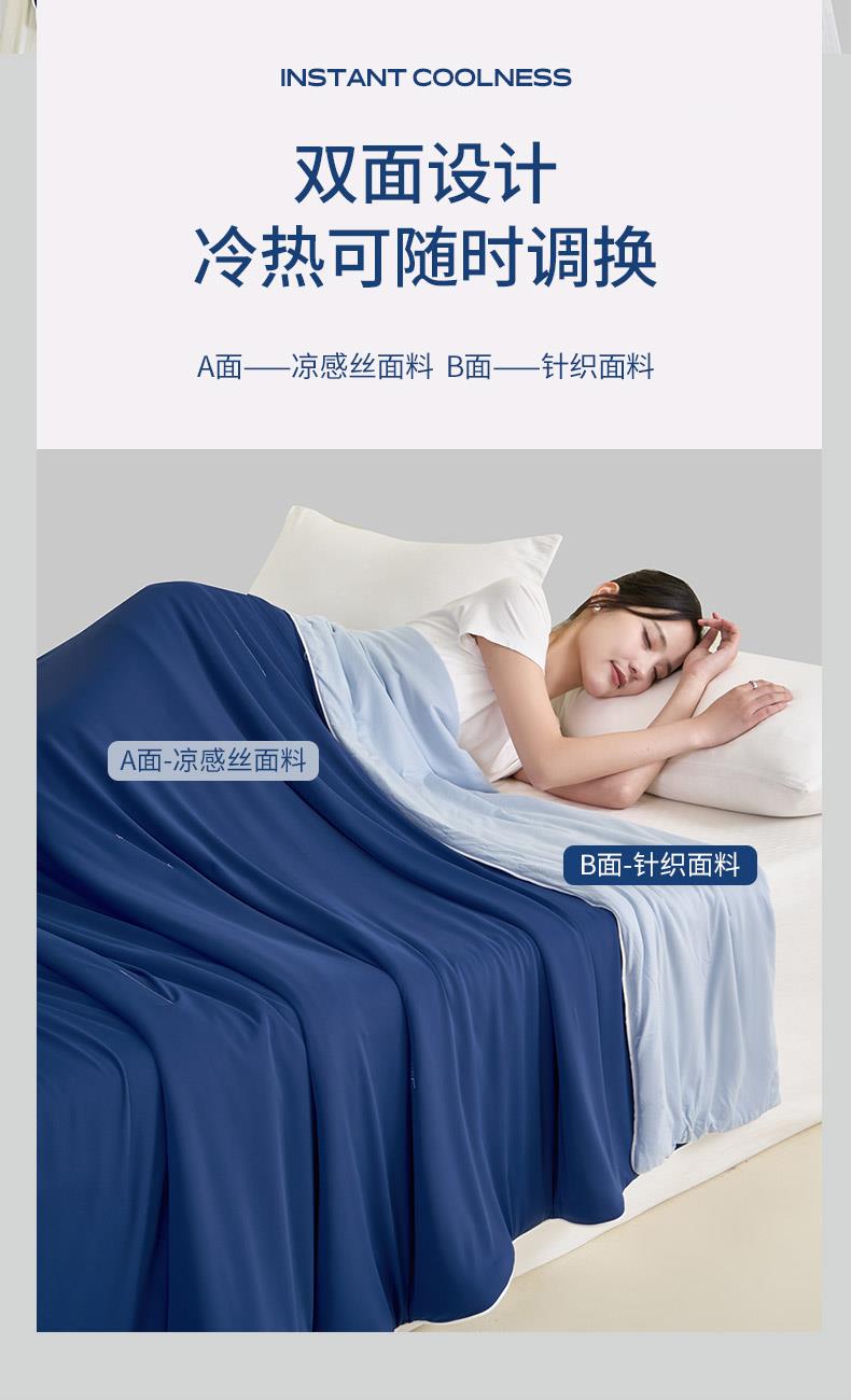 规格:150*200cm 面料: A面 凉感丝面料 B面 针织面料 填充:聚酯纤维埋绳包边 花型:温控-双蓝、温控-灰绿、温控-杏粉 双面凉感,一触即凉 一面冰感针织,一面柔滑亲肤,告别闷热黏腻,体感直降 -℃,整夜清爽好眠。高克重针织,软糯包裹感 升级高克重面料,触感软糯如云朵,包裹感十足,透气不闷汗,凉而不冰。可机洗不变形,省心又耐用 整张填充,机洗不结团、不起坨,洗完依旧蓬松柔软,告别手洗烦恼。 深睡控温科技,告别忽冷忽热 智能控温纤维,自动调节被窝微气候,夏天不闷,春秋不凉,四季都好眠。