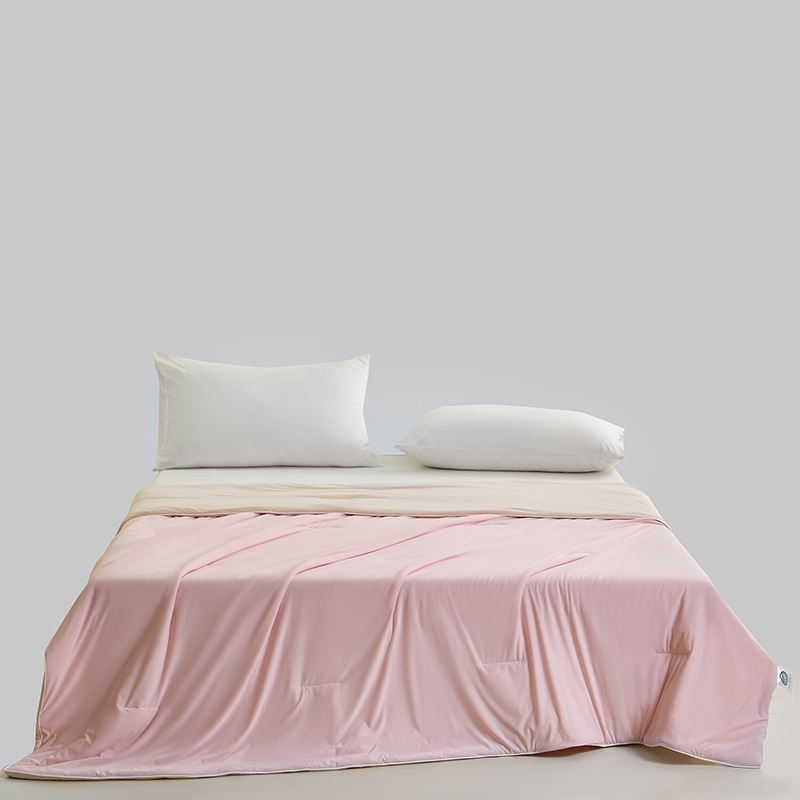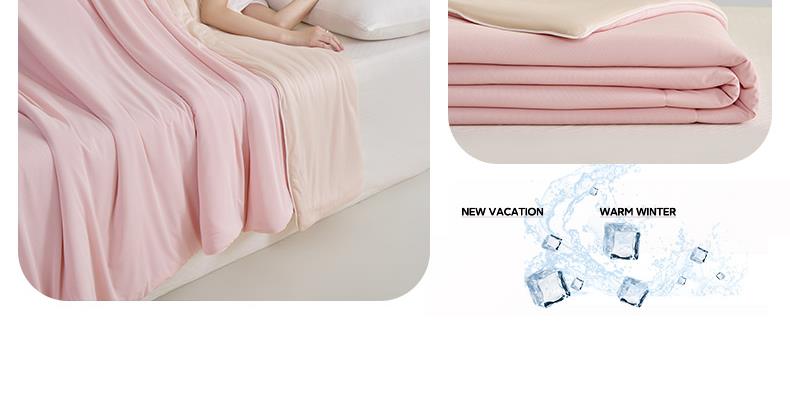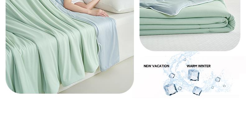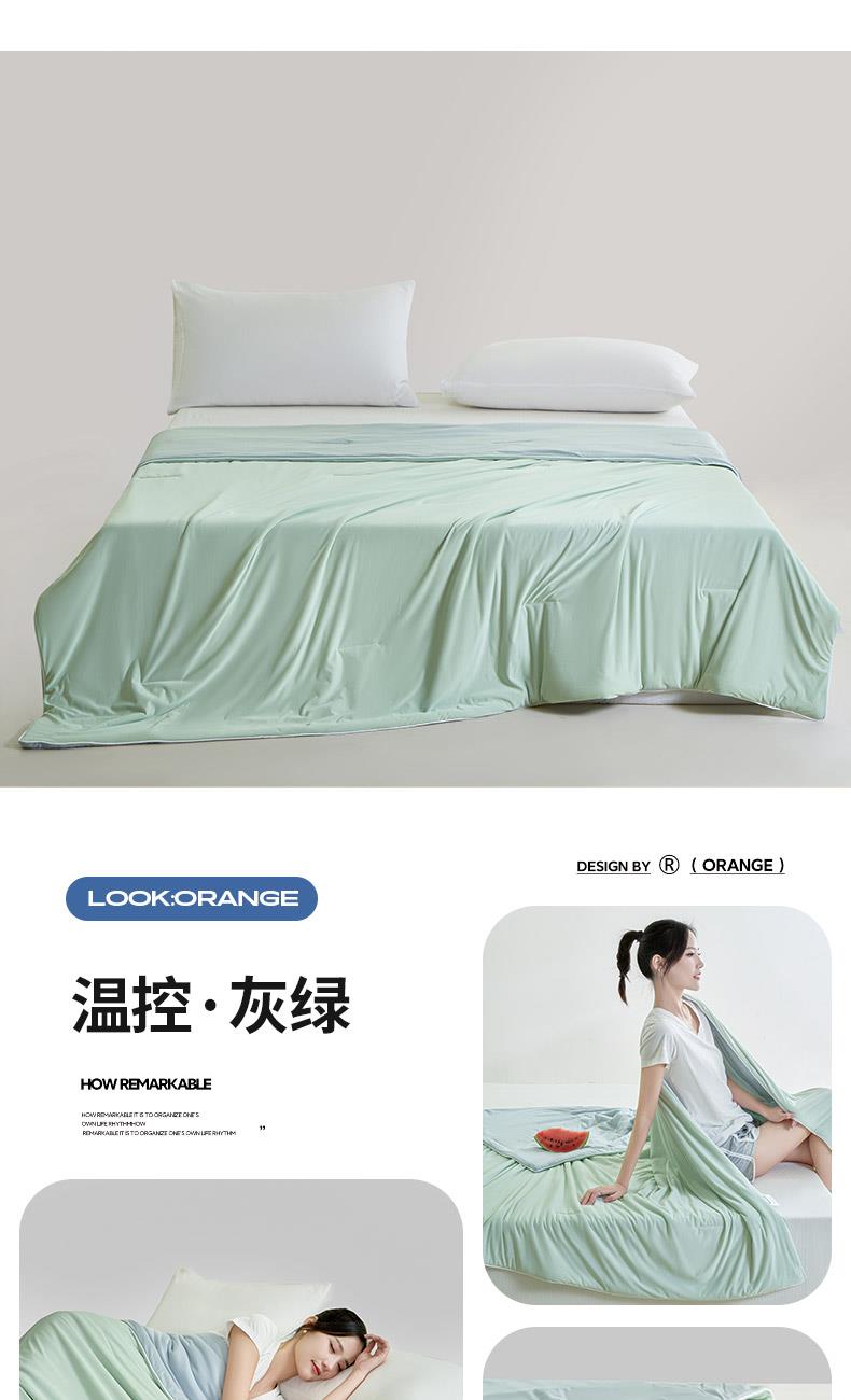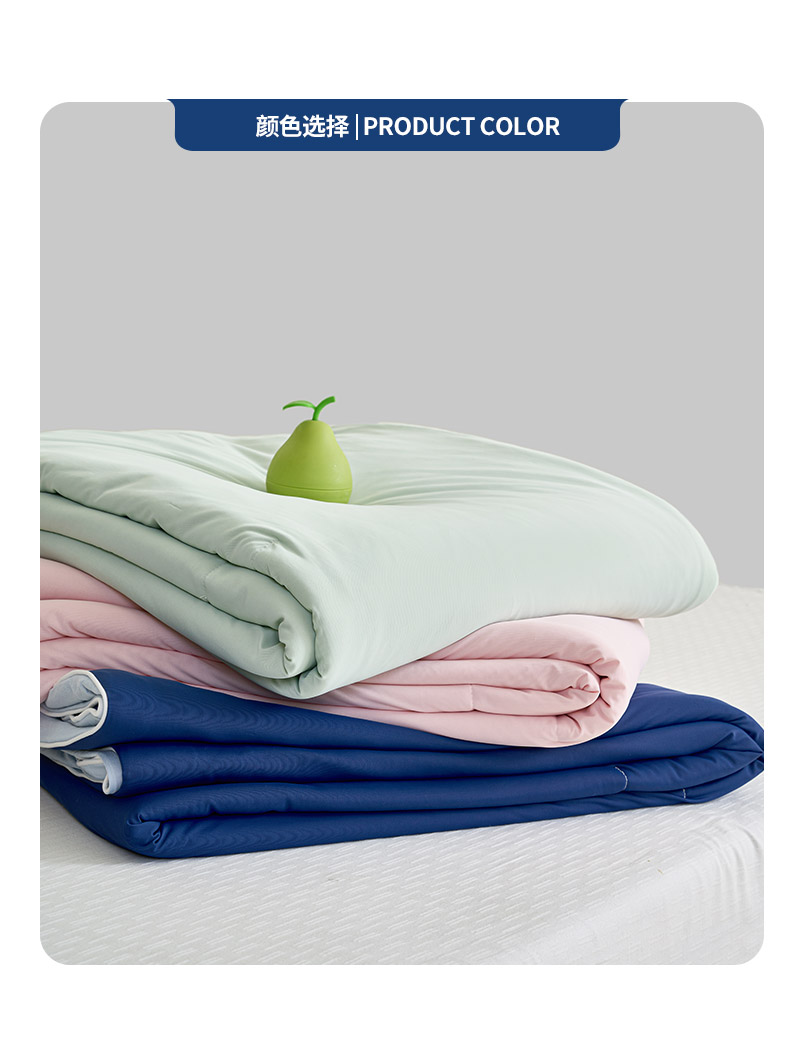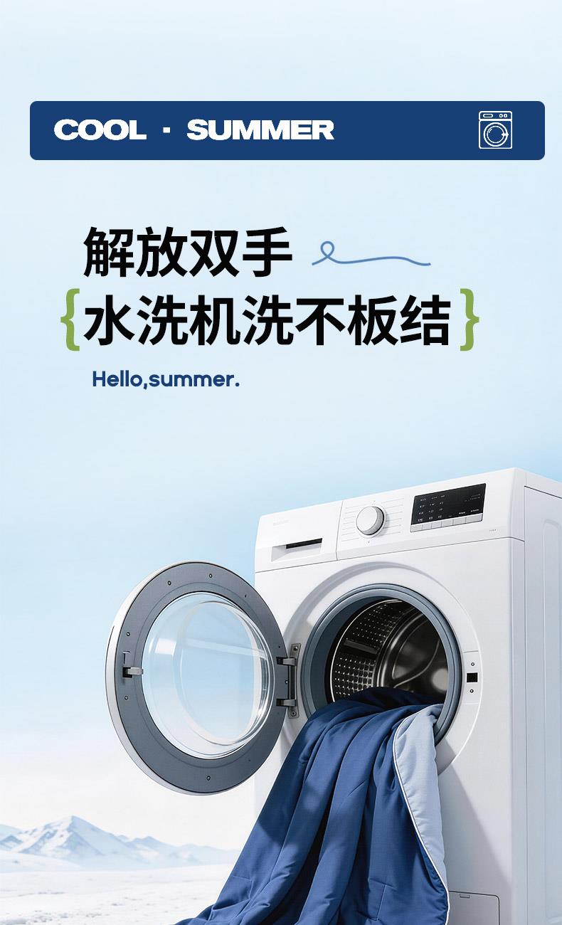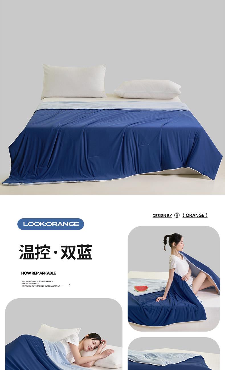 规格:150*200cm 面料: A面 凉感丝面料 B面 针织面料 填充:聚酯纤维埋绳包边 花型:温控-双蓝、温控-灰绿、温控-杏粉 双面凉感,一触即凉 一面冰感针织,一面柔滑亲肤,告别闷热黏腻,体感直降 -℃,整夜清爽好眠。高克重针织,软糯包裹感 升级高克重面料,触感软糯如云朵,包裹感十足,透气不闷汗,凉而不冰。可机洗不变形,省心又耐用 整张填充,机洗不结团、不起坨,洗完依旧蓬松柔软,告别手洗烦恼。 深睡控温科技,告别忽冷忽热 智能控温纤维,自动调节被窝微气候,夏天不闷,春秋不凉,四季都好眠。