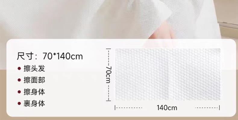 规格:80*140cm 面料:粘胶纤维 含量:1片/包 箱:72包/箱 条码:6978746900172 1.优选材质:产品材质甄选优质天然的植物纤维(再生纤维素纤维) 2.整款产品干湿两用,温和亲肤,AB双面天然植物纤维,无任何添加有害成分,呵护您的肌肤.