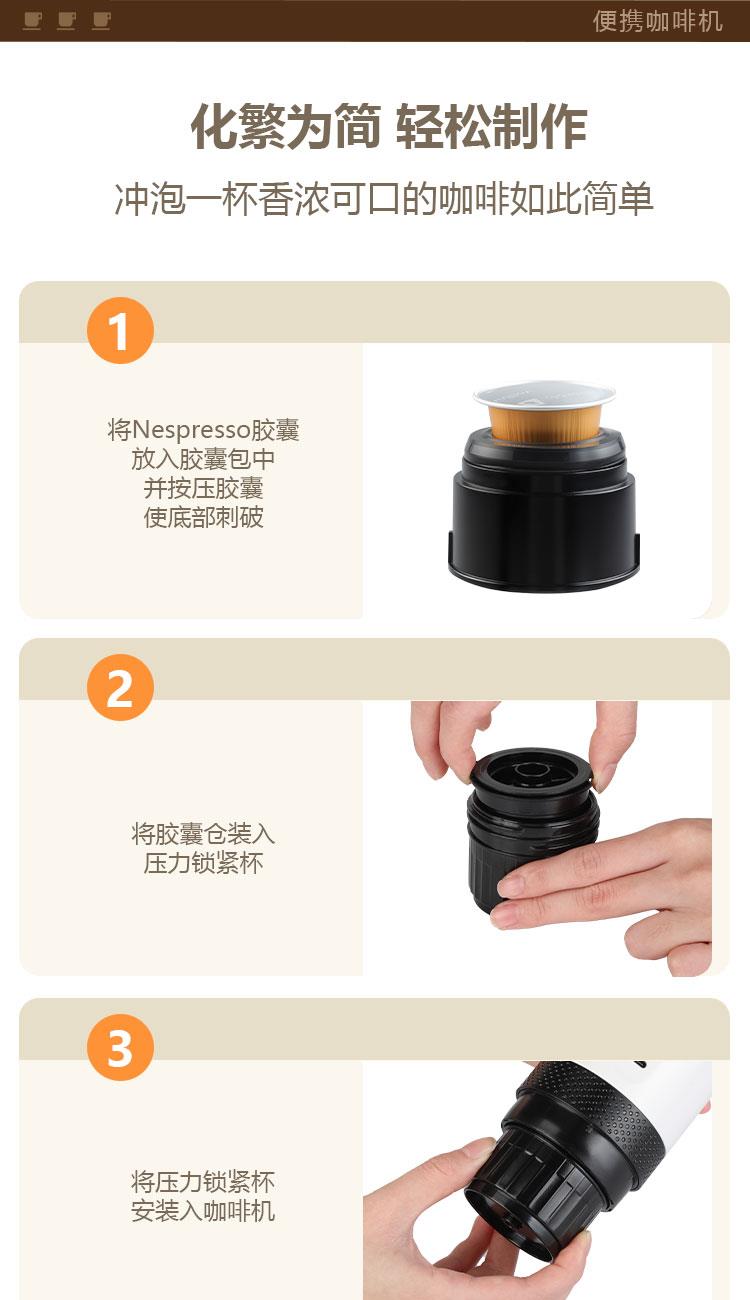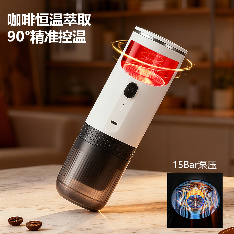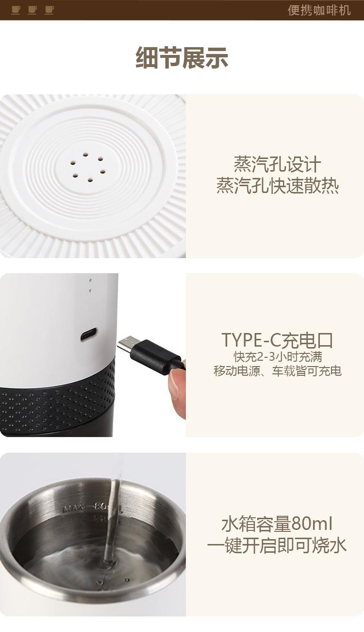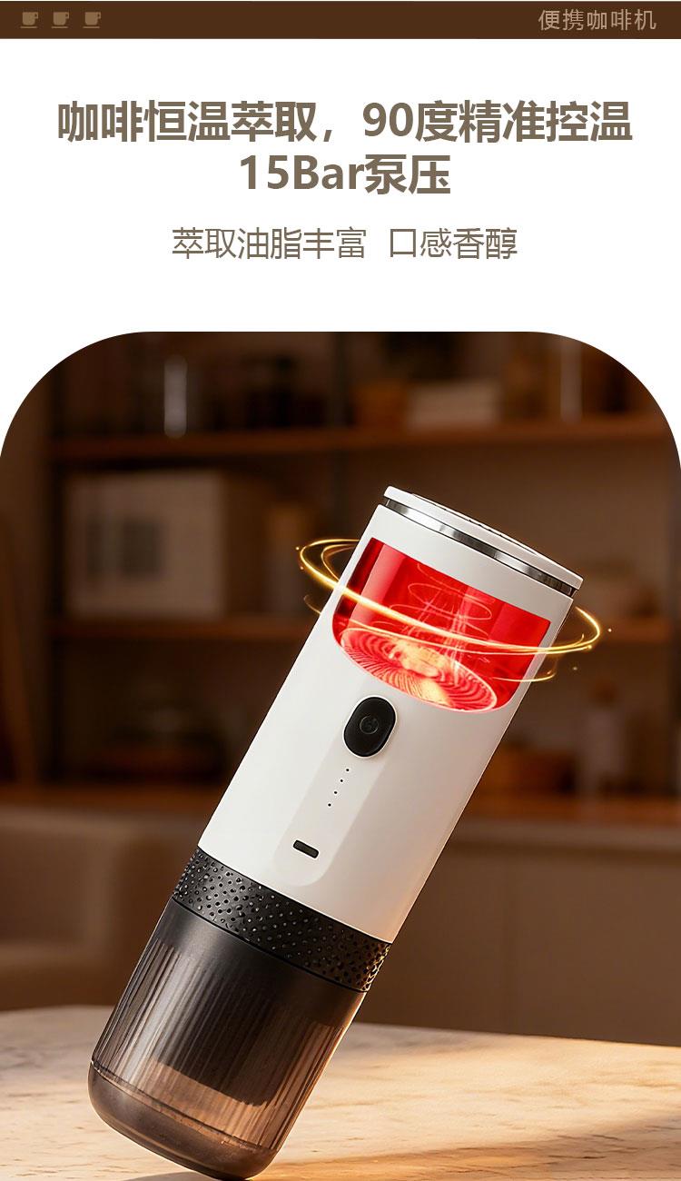 产品参数: 容量:80ml 毛重:810g 净重:650g 电压/频率:12V 工作电流:8A 输出功率:100W 工作寿命:≥6000次 水泵类型:压力式水泵 萃取压力:15BAR 电池容量:7500mAh 充电时间:快充约2-3H 工作温度:20℃-50℃ 充电方式:Type-C充电口 充电电压/电流:5V/2A-4A 彩盒尺寸:95*95*275mm 外箱尺寸:496*295*400mm 产品卖点: 一键启动萃取,安全方便快捷操作 咖啡粉与Nespresso胶囊二合一,满足不同客户需求 无线便携设计,居家户外,满足不同使用场景 电池无线加热,不用自带热水,来一杯香浓意式 咖啡恒温萃取,90度精 准控温、15Bar泵压,萃取油脂丰富、口感香醇 大容量电池、持久续航