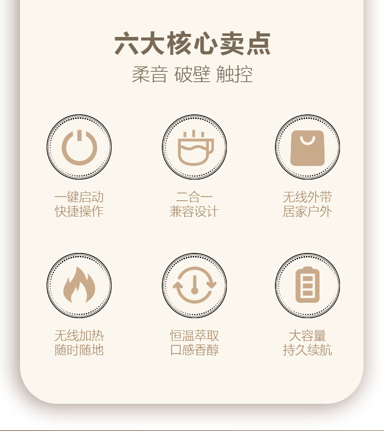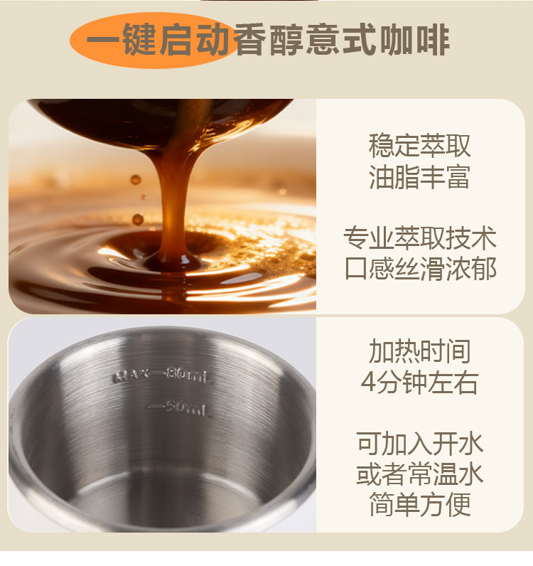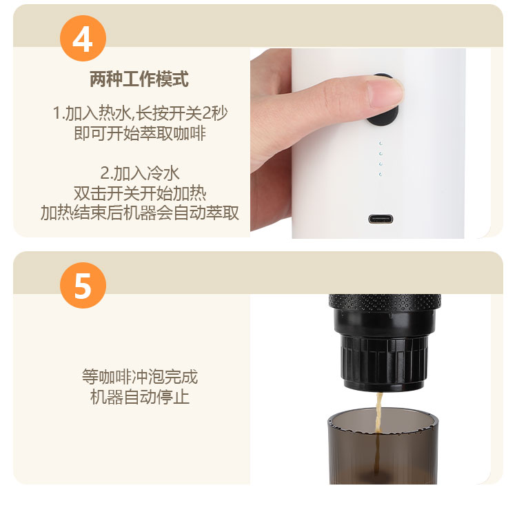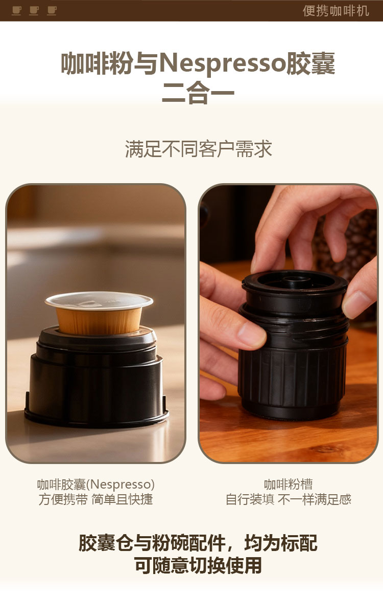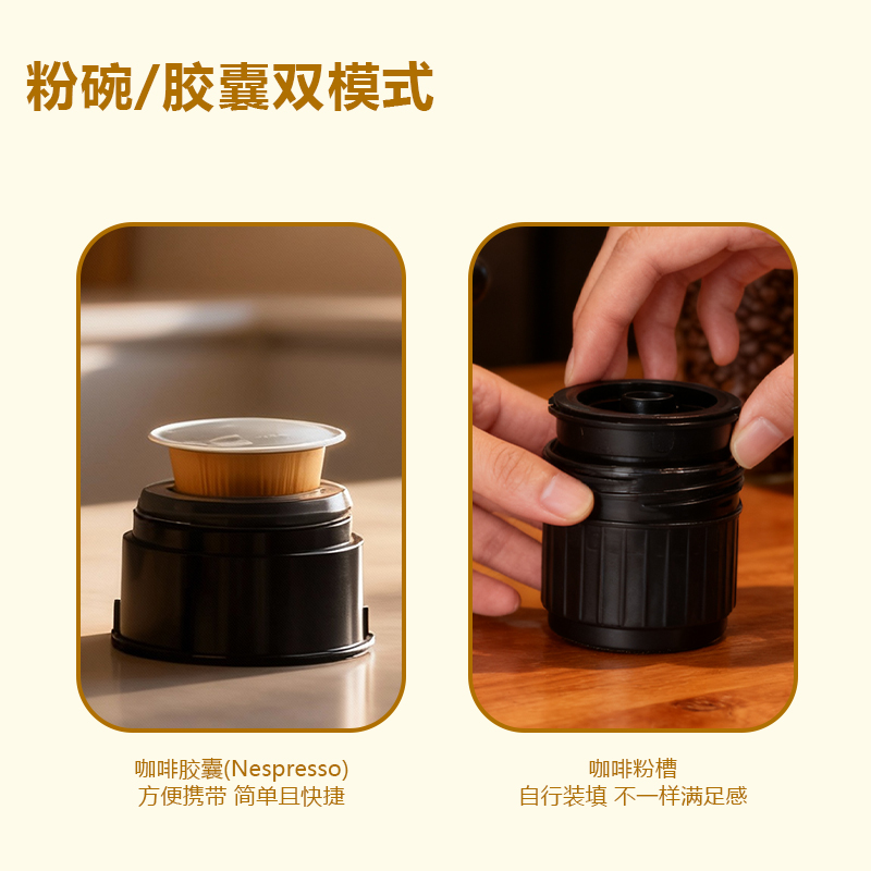 产品参数: 容量:80ml 毛重:810g 净重:650g 电压/频率:12V 工作电流:8A 输出功率:100W 工作寿命:≥6000次 水泵类型:压力式水泵 萃取压力:15BAR 电池容量:7500mAh 充电时间:快充约2-3H 工作温度:20℃-50℃ 充电方式:Type-C充电口 充电电压/电流:5V/2A-4A 彩盒尺寸:95*95*275mm 外箱尺寸:496*295*400mm 产品卖点: 一键启动萃取,安全方便快捷操作 咖啡粉与Nespresso胶囊二合一,满足不同客户需求 无线便携设计,居家户外,满足不同使用场景 电池无线加热,不用自带热水,来一杯香浓意式 咖啡恒温萃取,90度精 准控温、15Bar泵压,萃取油脂丰富、口感香醇 大容量电池、持久续航
