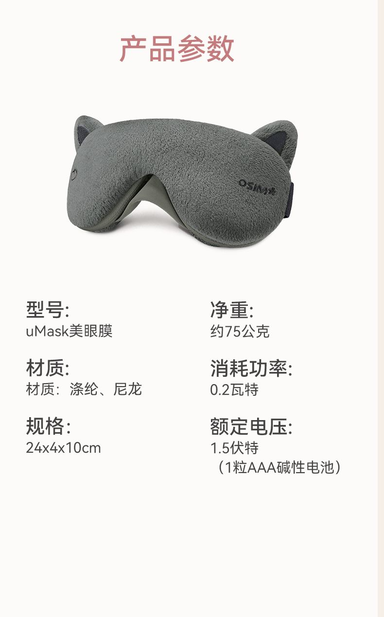 电压:1.5伏特(1粒AAA碱性电池) 耗电量:0.2瓦特 尺寸:22*9*3.5cm 毛重:约115公克 净重:约75公克 1、时尚精致,便于携带,出差、旅行必备神器 2、符合脸部轮廓,绒面多用途,可做遮光眼罩可做眼部按摩器使用 3、办公室午睡使用,轻柔按摩,可放松眼部