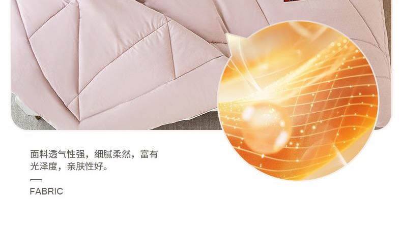 规 格:200×230cm 面 料:斜纹防羽布(聚酯纤维) 填 充:51%羊毛+10%聚乙烯醇纤维(含有蛋白)+39%聚酯纤维