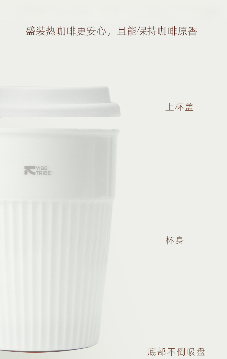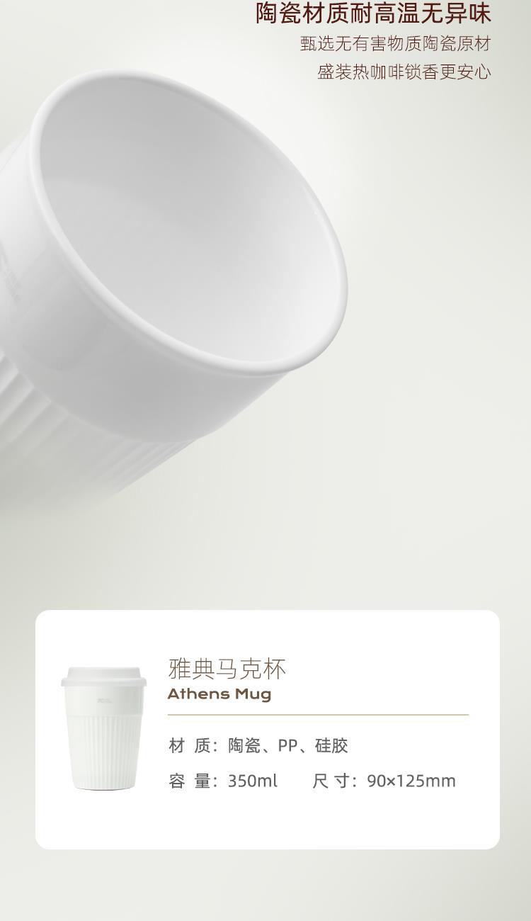 产品:VIBE-TRIBE雅典马克杯 产品尺寸:125*90 mm 彩盒尺寸:95*95*135 mm 产品材质:陶瓷、PP、硅胶 核心卖点: 1.采用超白玲珑瓷材质耐高温无异味、透光不透水,0吸水性,杜绝茶渍咖啡渍产生,光滑易清洁,不含有害物质,盛装热咖啡更安心,且能保持咖啡原香;釉面润泽如玉,视觉纯净雅致,兼具艺术感与现代审美。 2.不倒设计,放置桌面时稳定性强,有效避免倾倒,减少咖啡洒漏,杯身光滑易清洁,污渍不易残留,清洗方便,日常打理省心;