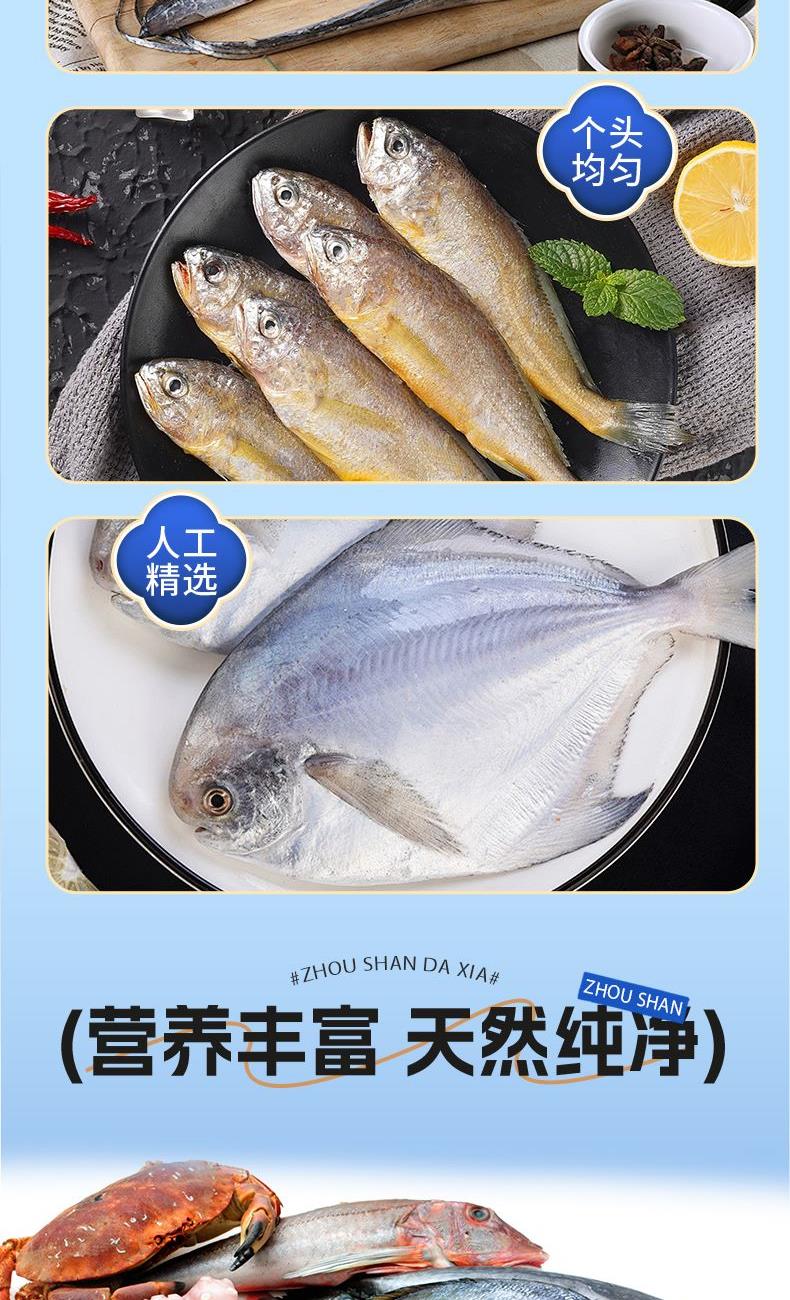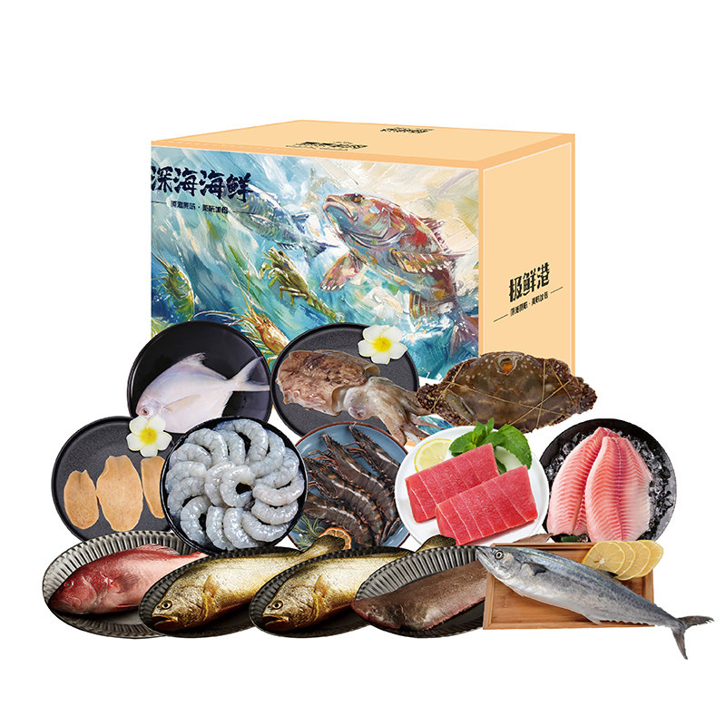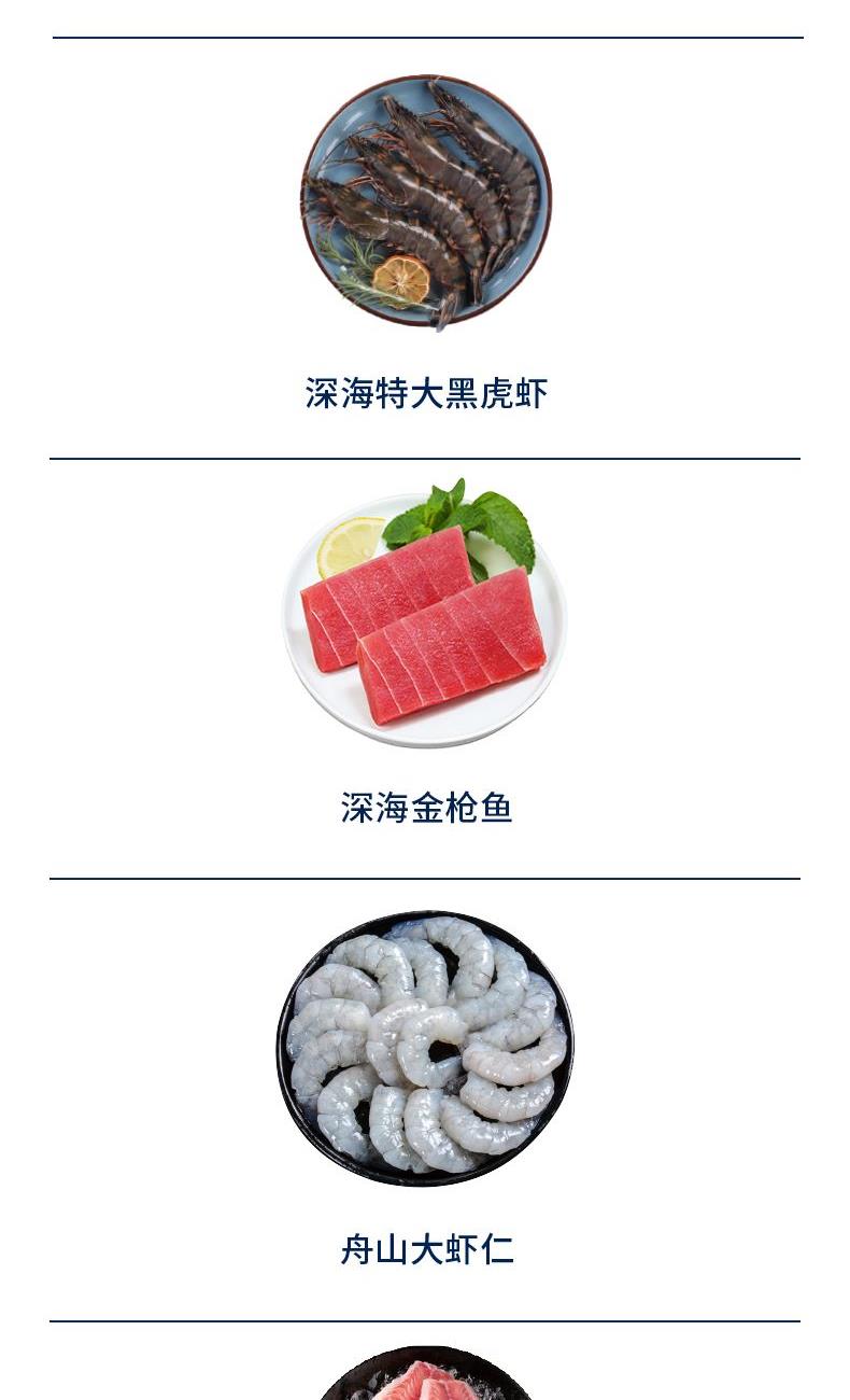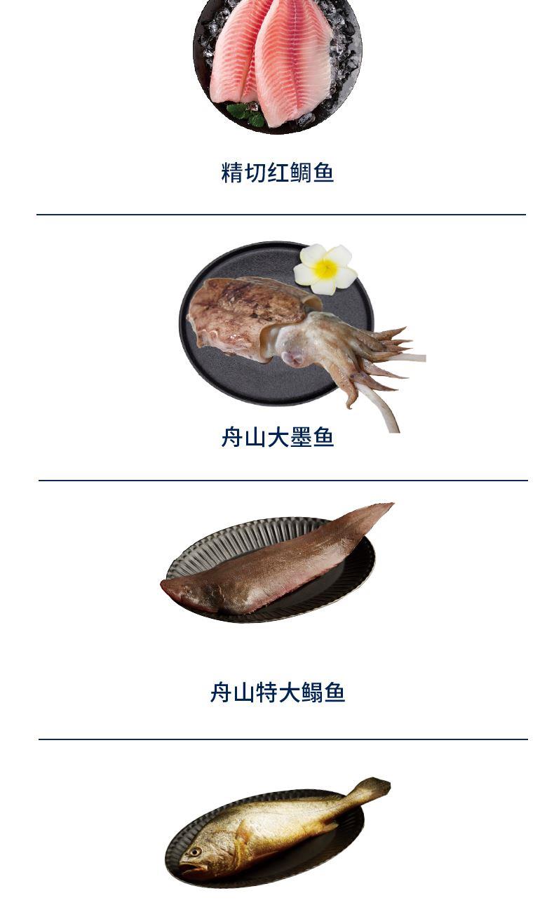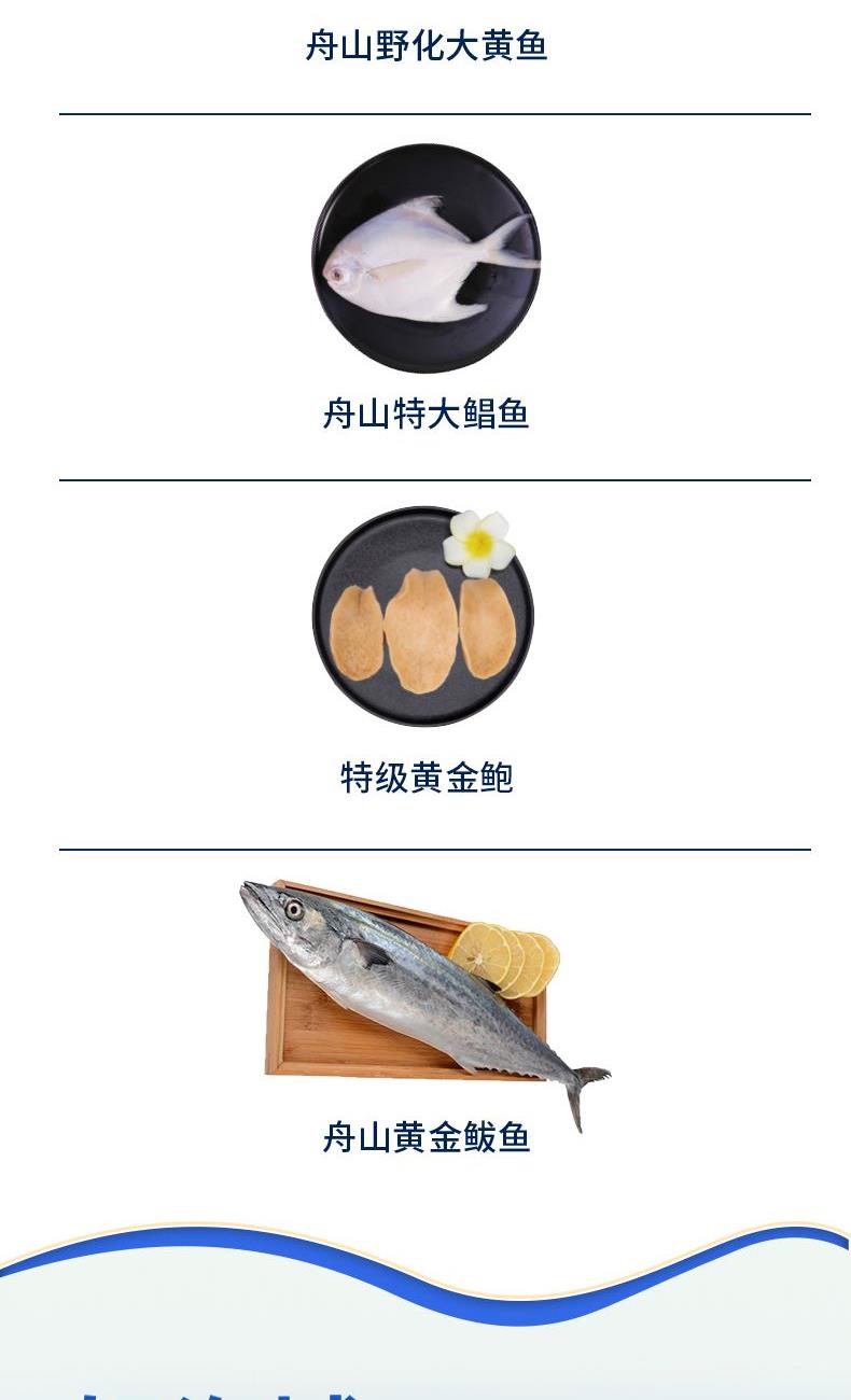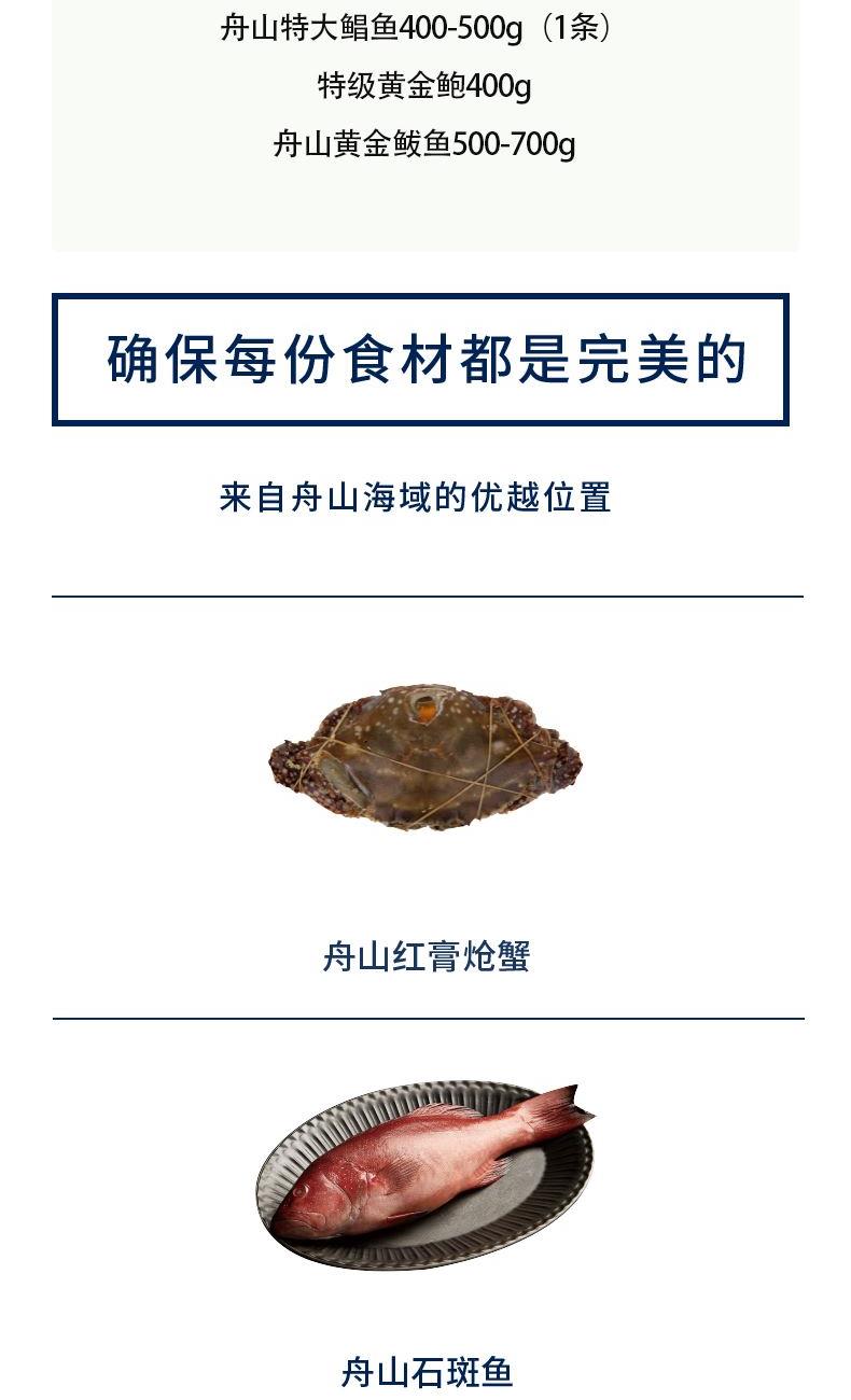 产品内配:舟山野化大黄鱼400-500g(1条)*2舟山红膏呛蟹300-400g深海特大黑虎虾300g深海金枪鱼200-300g舟山大虾仁300g精切红鲷鱼250-350g舟山大墨鱼400-500g舟山特大鳎鱼400-500g舟山石斑鱼300-400g舟山特大鲳鱼400-500g(1条)特级黄金鲍400g舟山黄金鲅鱼500-700g