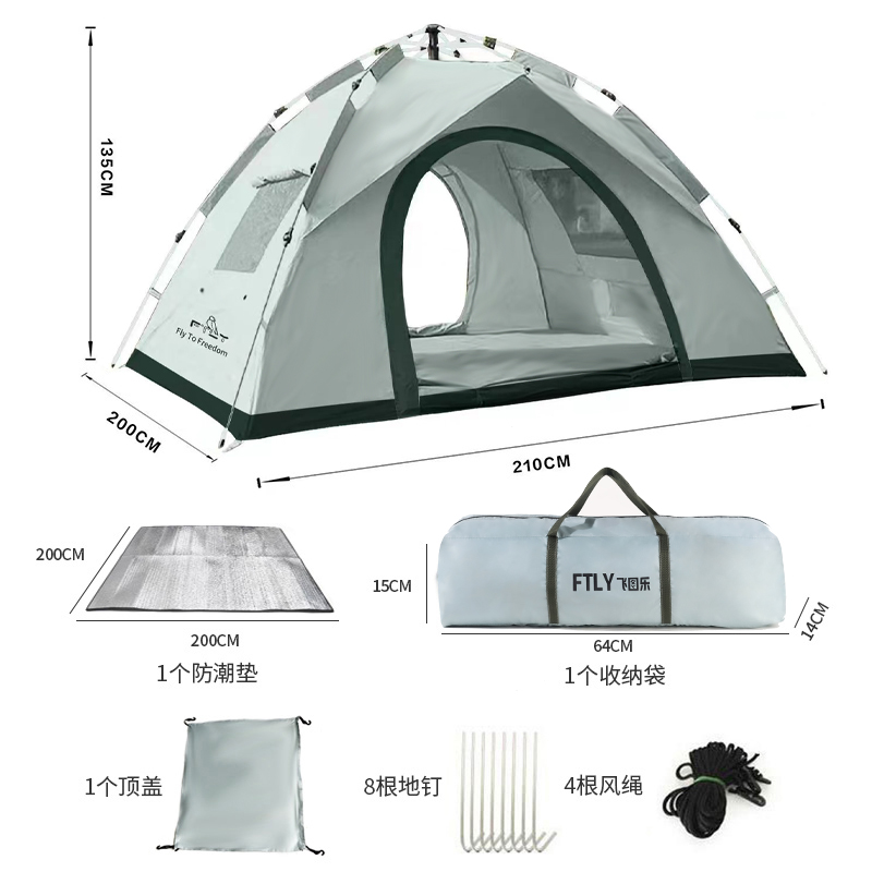 配置含: 1. 3-4人液压帐篷套装-天青灰(200*210*135cm) 2. 铝膜防潮垫(2*2m) 3. 青春绿折叠桌椅六件套(一桌四椅+收纳袋) 帐篷 材质:190T涂银面料+玻璃纤维杆+底部210D牛津布 颜色:天青灰 尺寸:200*210*135cm 折叠桌椅 材质:600D加密牛津布 +防锈烤漆铁管 商品颜色:米白拼绿 商品规格:六件套(一桌四椅+收纳袋) 桌子尺寸:45*45*41cm 椅子尺寸:58*38*38cm 商品净重:5.8kg 商品承重:120kg