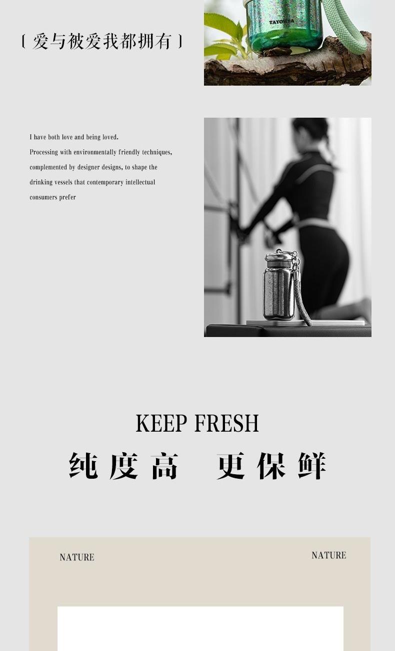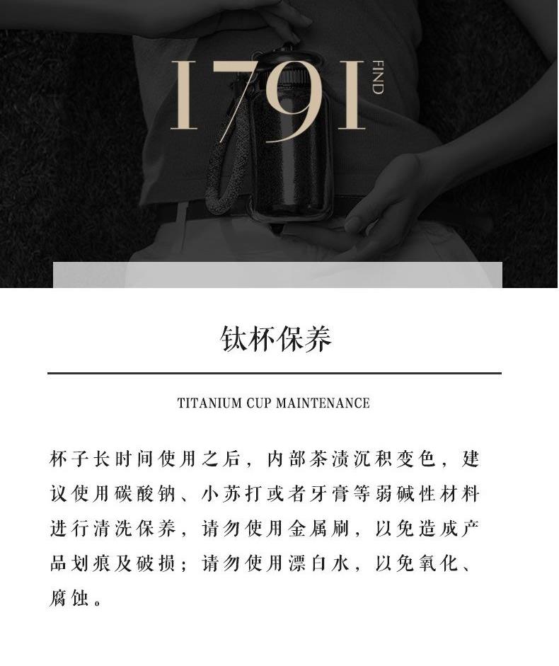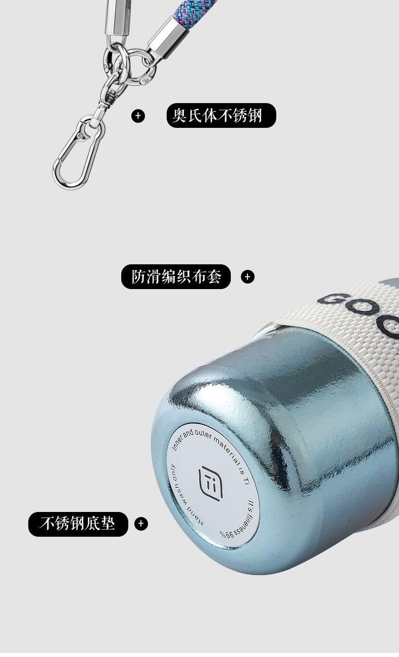 容 量: 300ml 颜色分类:紫 产品尺寸:φ7.0X15.5cm 金属材质:99%纯钛(Ti) 包装方式:礼盒包装 1. 钛含量99.88%,纯度高,更保鲜,同时钛具有良好的yijun效果。 2. 钛的耐腐蚀性极强,可盛装各种冷热酸碱饮品。 3. 保温保冷;密封防漏。 4. 此器型设计独特,三色出挑,唤醒多巴胺。 5. 配有挂绳,一拎即走,享受出游松弛感。 6“Good Luck”编制防滑布套,寓意好运常伴。 7. 礼盒精装,送礼体面。