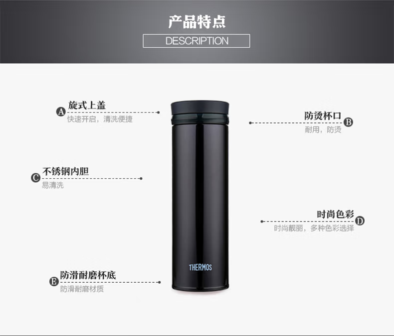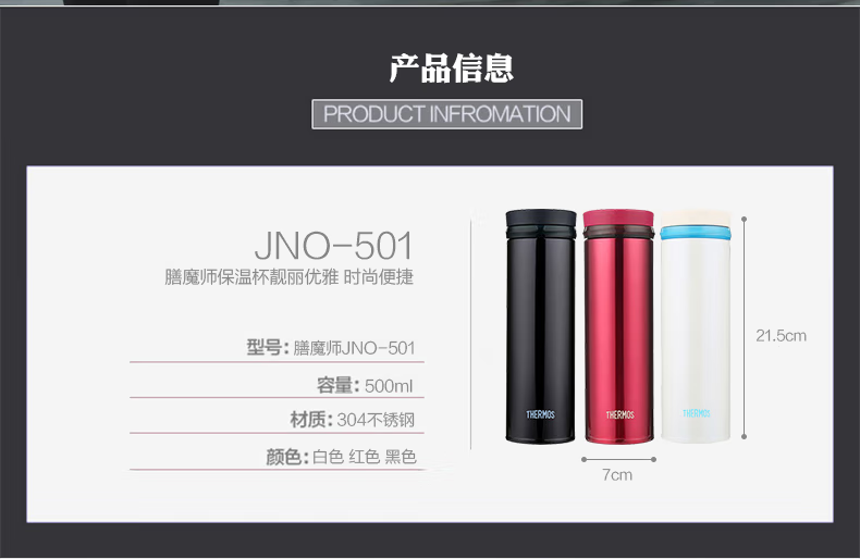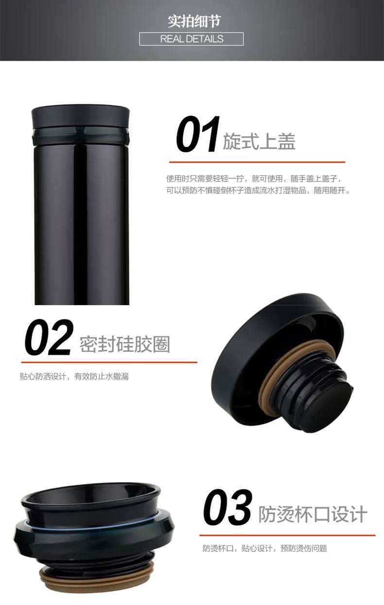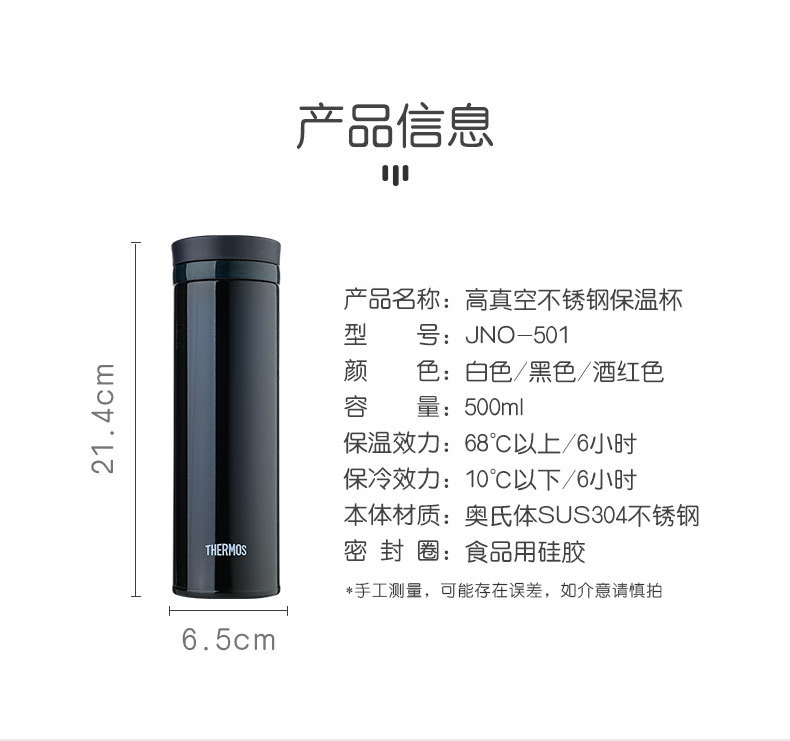 颜 色:黑色BK 白色PRW 红色BGD 容 量:500毫升 保温效力:68℃以上/6小时 保冷效力:10C以下(6小时) 外管材质:304不锈钢 内管材质:304不锈钢 密封圈:食品级硅胶 杯盖材质:食品级PP