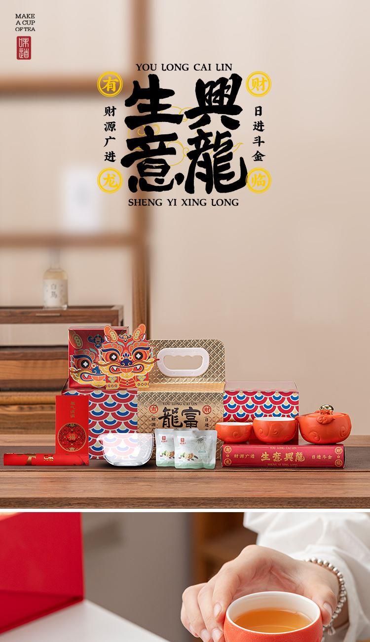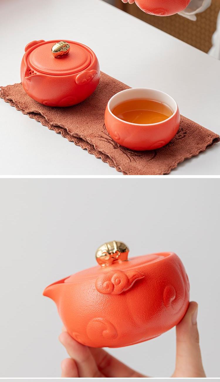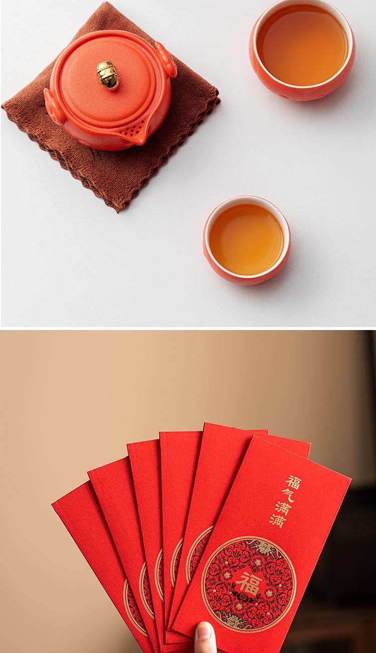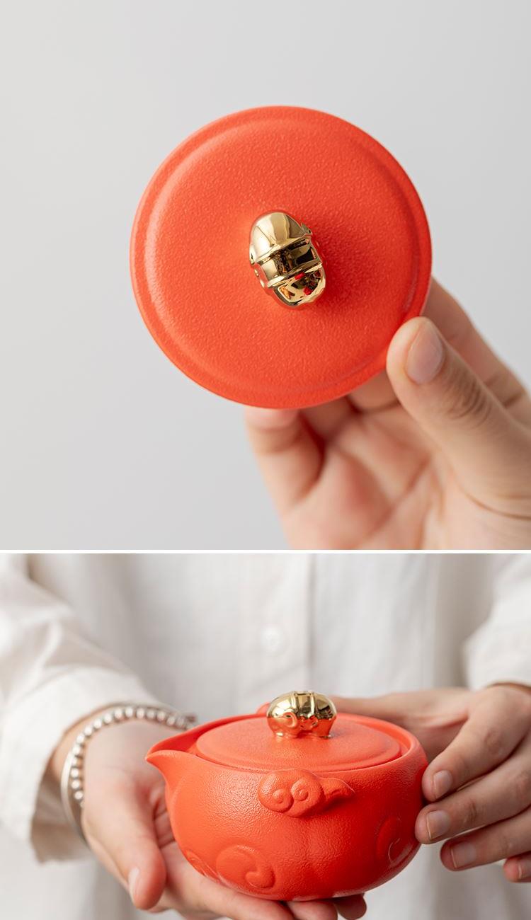 设计理念:清·铜鎏金珐琅太平有象文物为设计灵感,又以 老百姓喜闻乐见的传统如意祥云图案为主要装饰元素, 寄意丰富,整体套装,红色醒目,富贵吉祥,又热情 喜庆,是节日自用、礼赠皆宜的佳品。 产品配置:吉象茶壶*1、主人杯*1、客杯*1、公道杯*1、对联*1 、红包*6、茶点*2、礼盒、礼袋