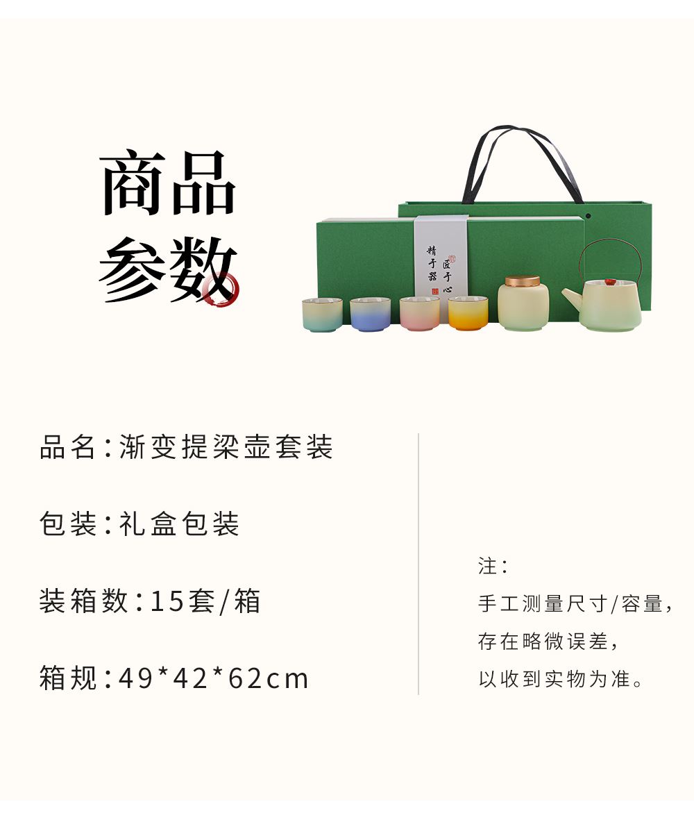 壶:14*11.5厘米252ml 茶叶罐:8*7厘米200ml 品茗杯:6*4.5厘米65ml 礼盒:41*15.5*12厘米 天然矿物釉,高温烧制无铅镉 ,精致便携, 搭配礼盒包装,自用赠礼两宜,瓷胎密实不吸茶香,久用更显韵味,以茶汤的甘醇,唤醒内心的宁静。